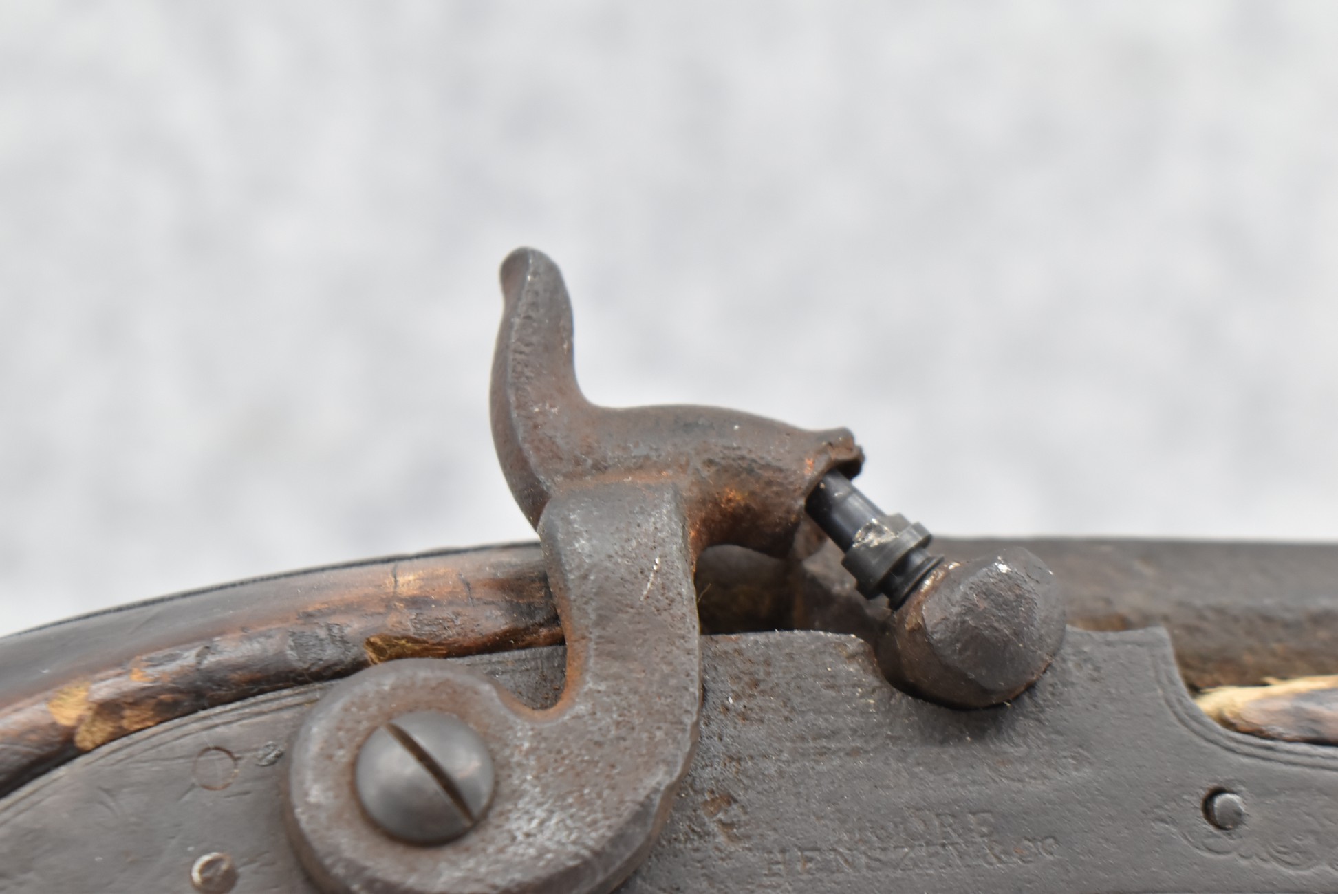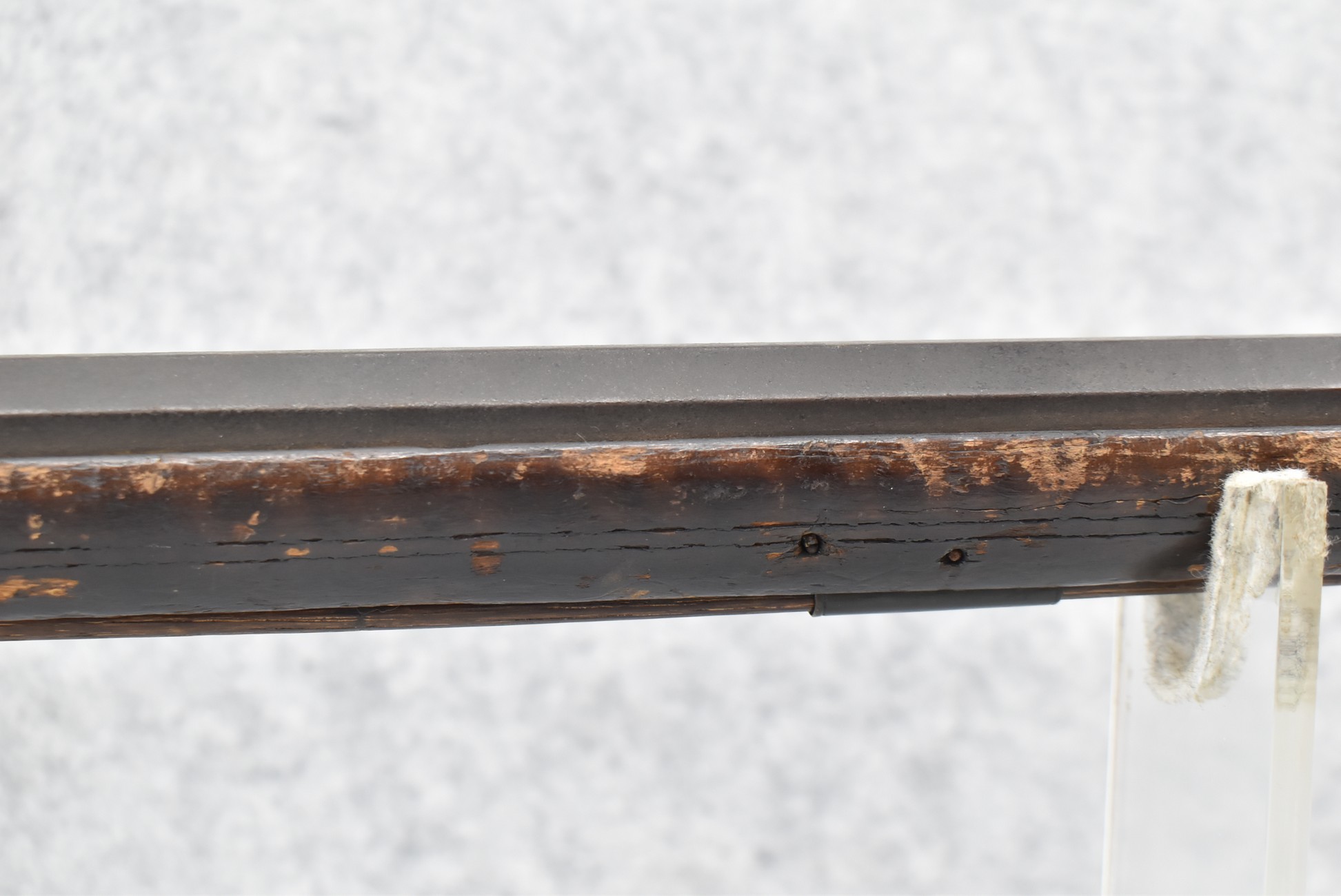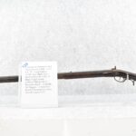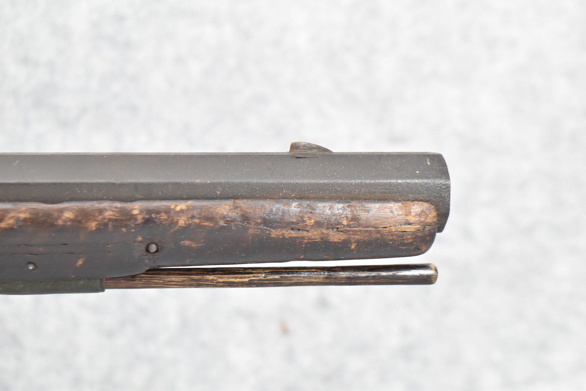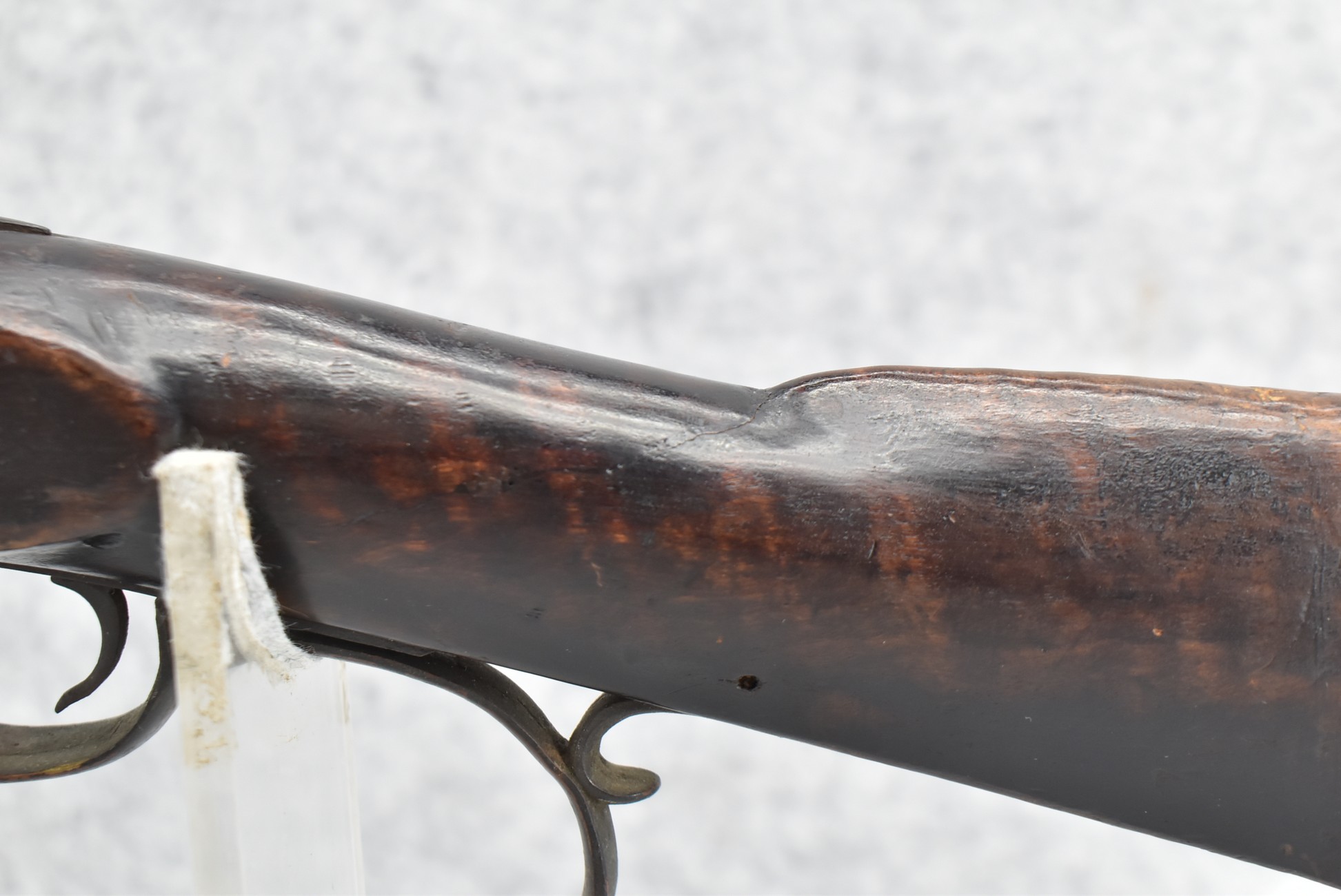 128. Converted to Percussion Full Stock Kentucky Rifle – w/36 Cal. 36” Octagon Barrel – w/Full Tiger Maple Wood Stock w/Brass Butt Plate & Brass Trigger Guard – w/Moore Henszey & Co. Percussion Lock – w/Double Set Triggers – w/Ram Rod – Possible Huntingdon County – Overall Length of 52”