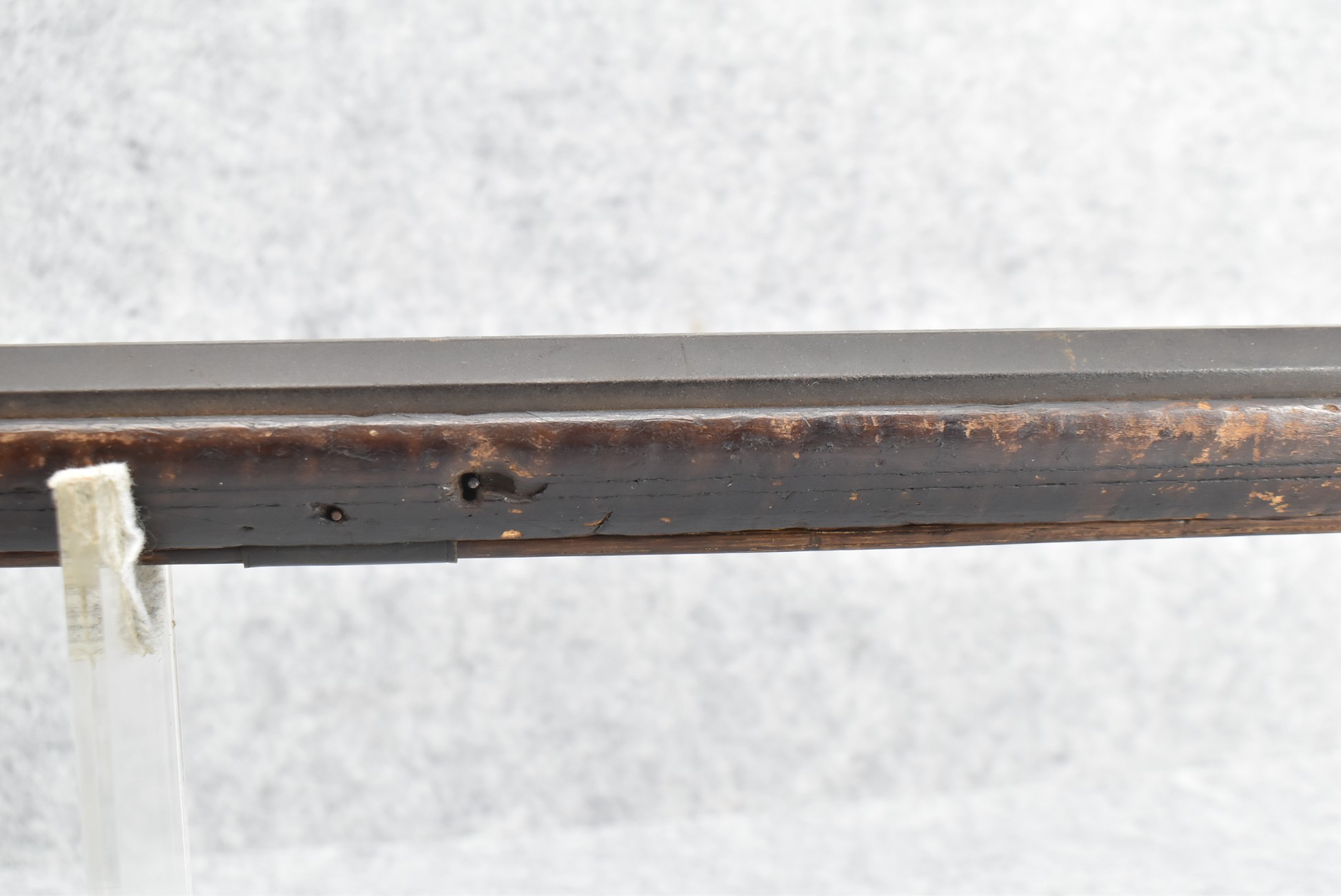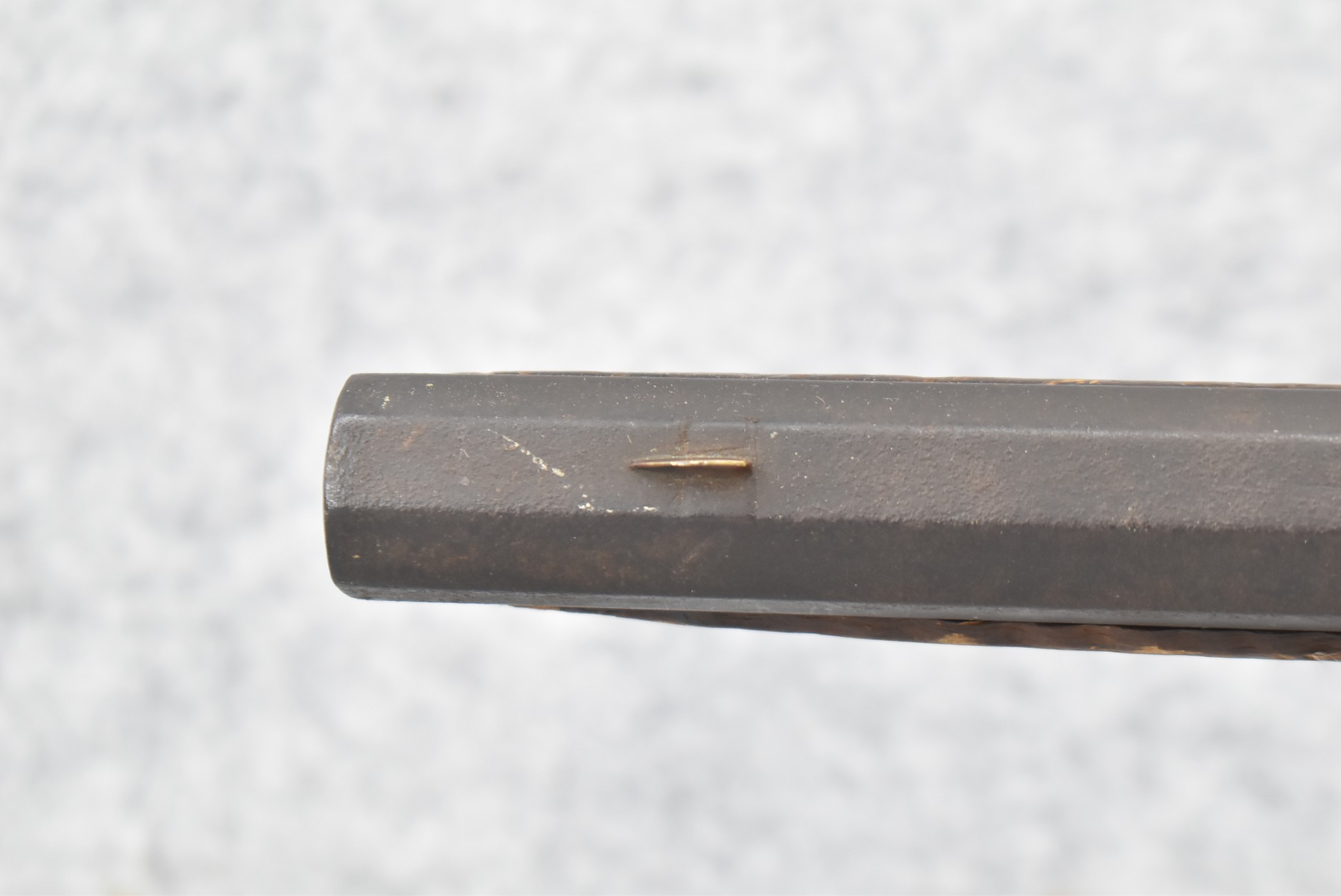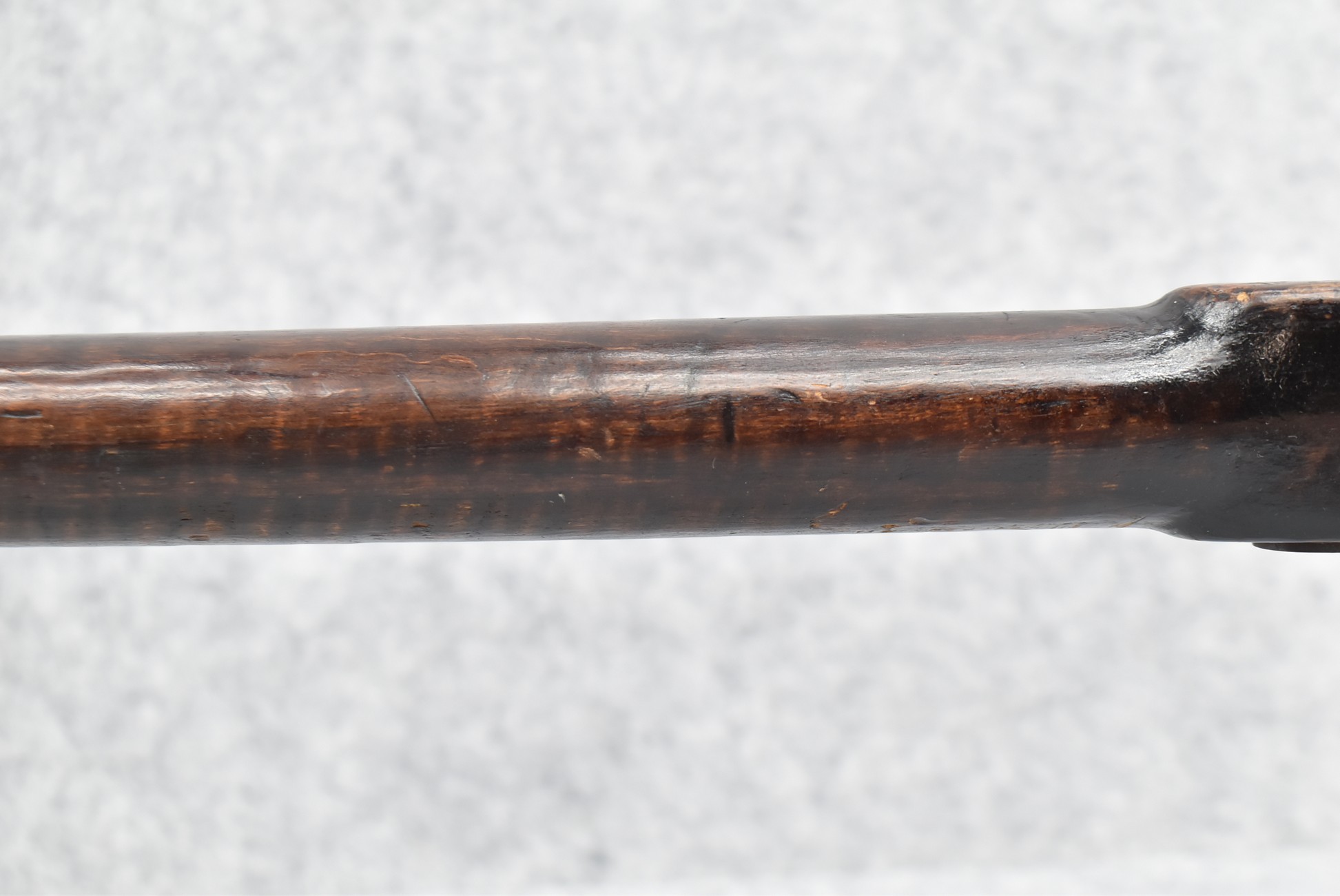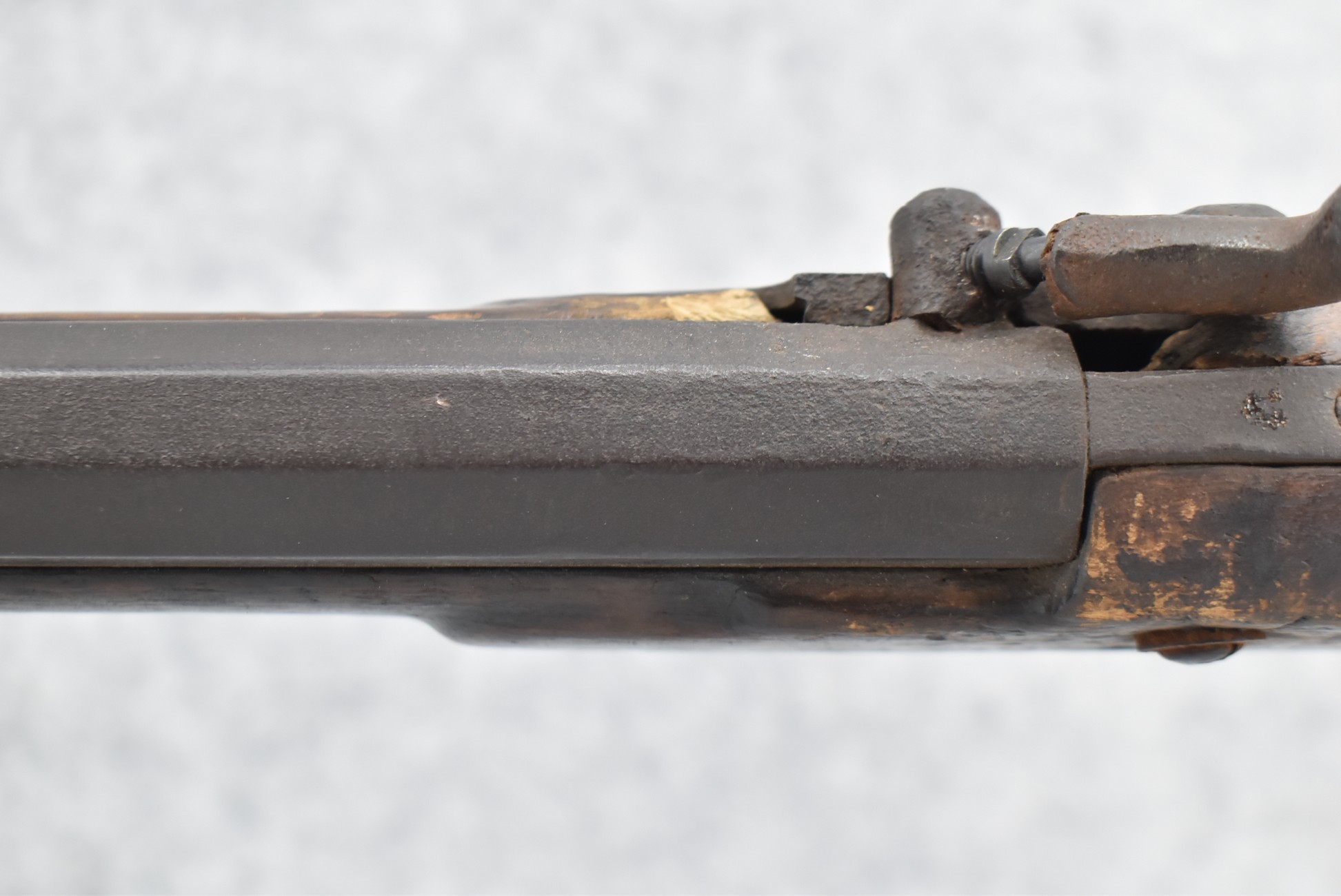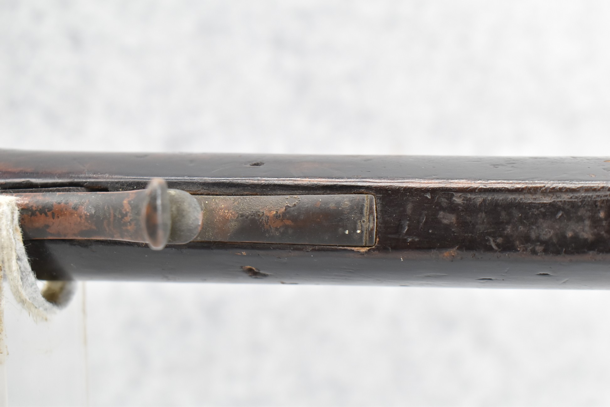 128. Converted to Percussion Full Stock Kentucky Rifle – w/36 Cal. 36” Octagon Barrel – w/Full Tiger Maple Wood Stock w/Brass Butt Plate & Brass Trigger Guard – w/Moore Henszey & Co. Percussion Lock – w/Double Set Triggers – w/Ram Rod – Possible Huntingdon County – Overall Length of 52”