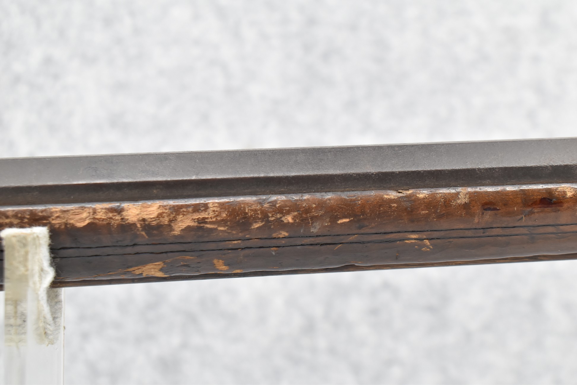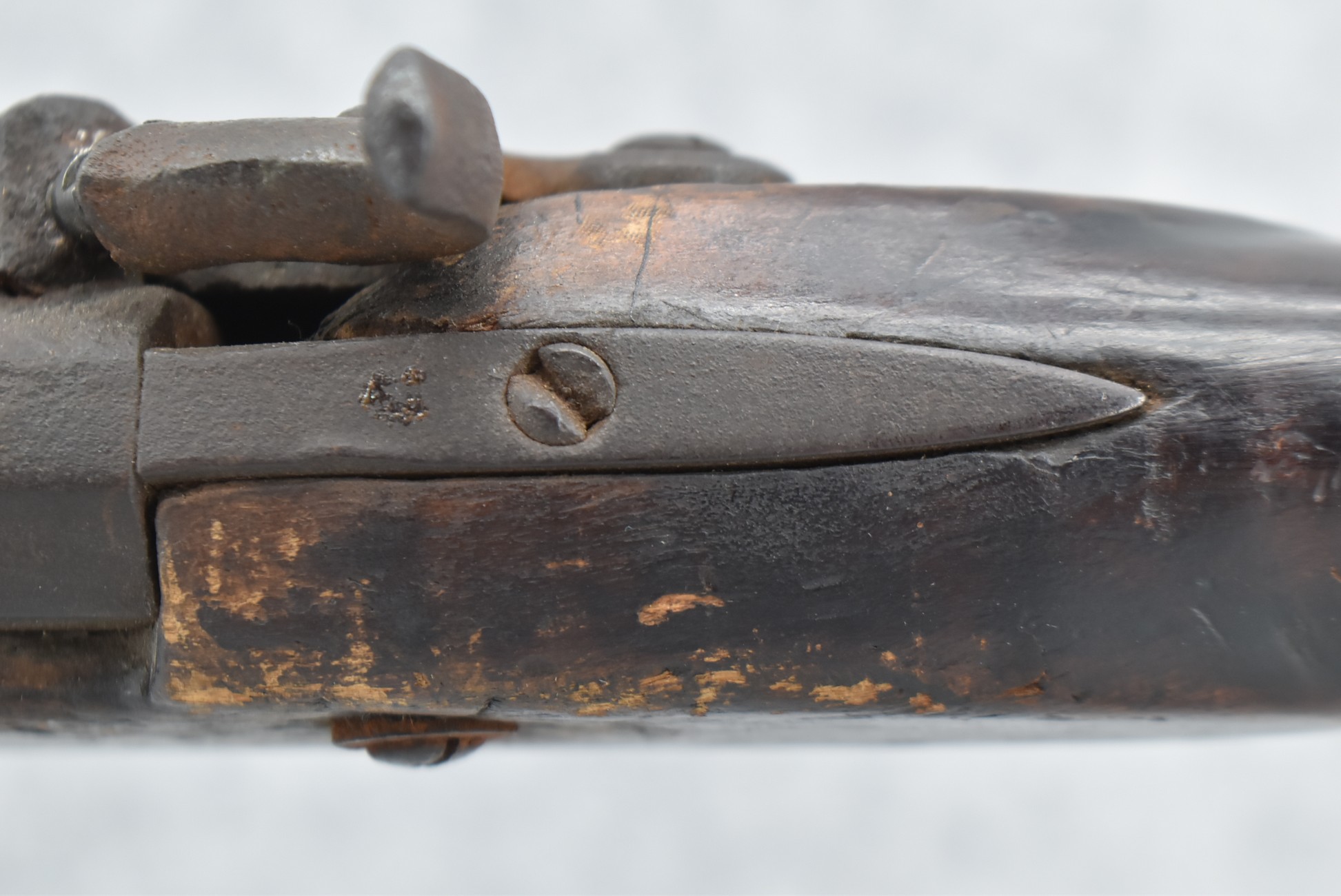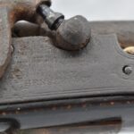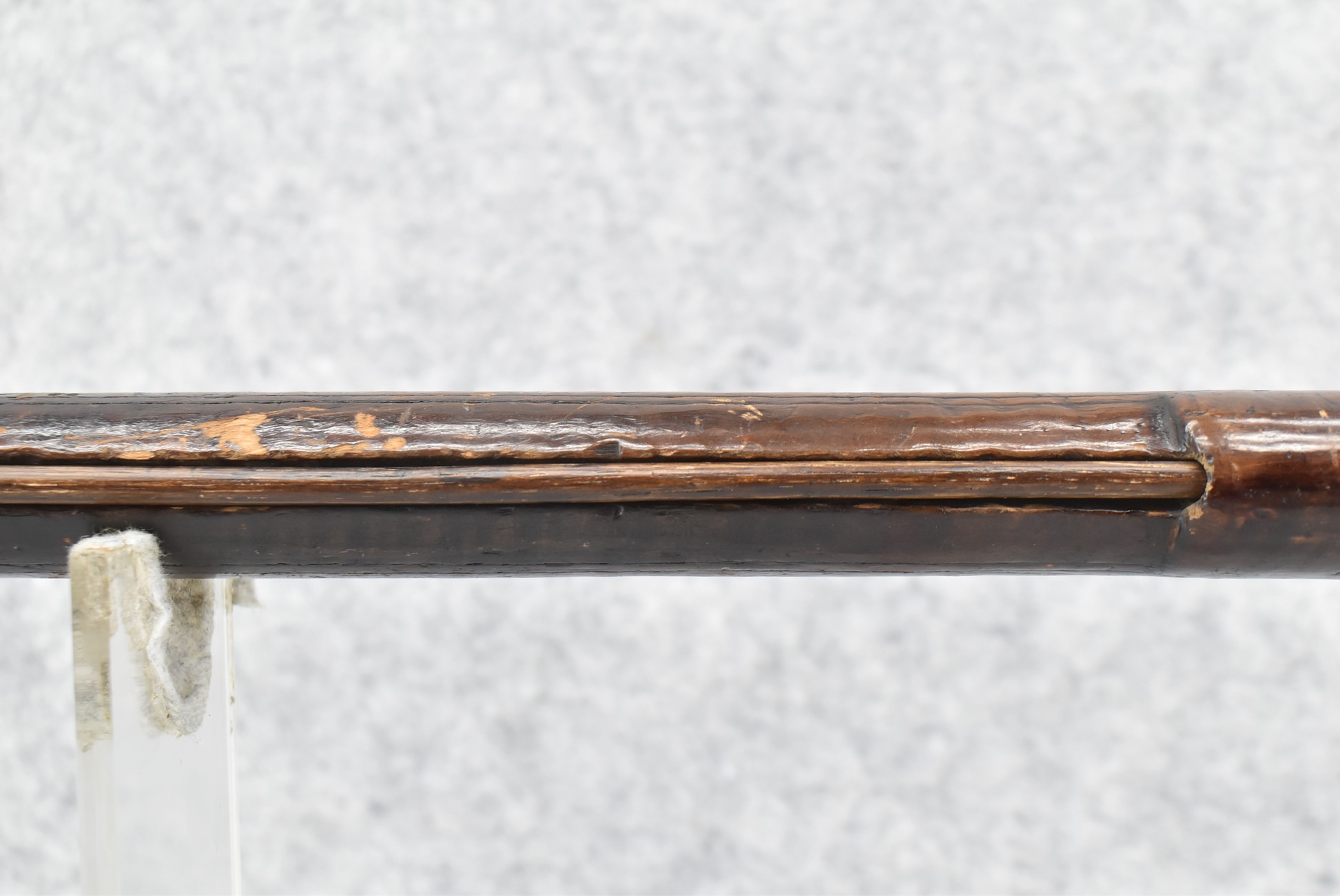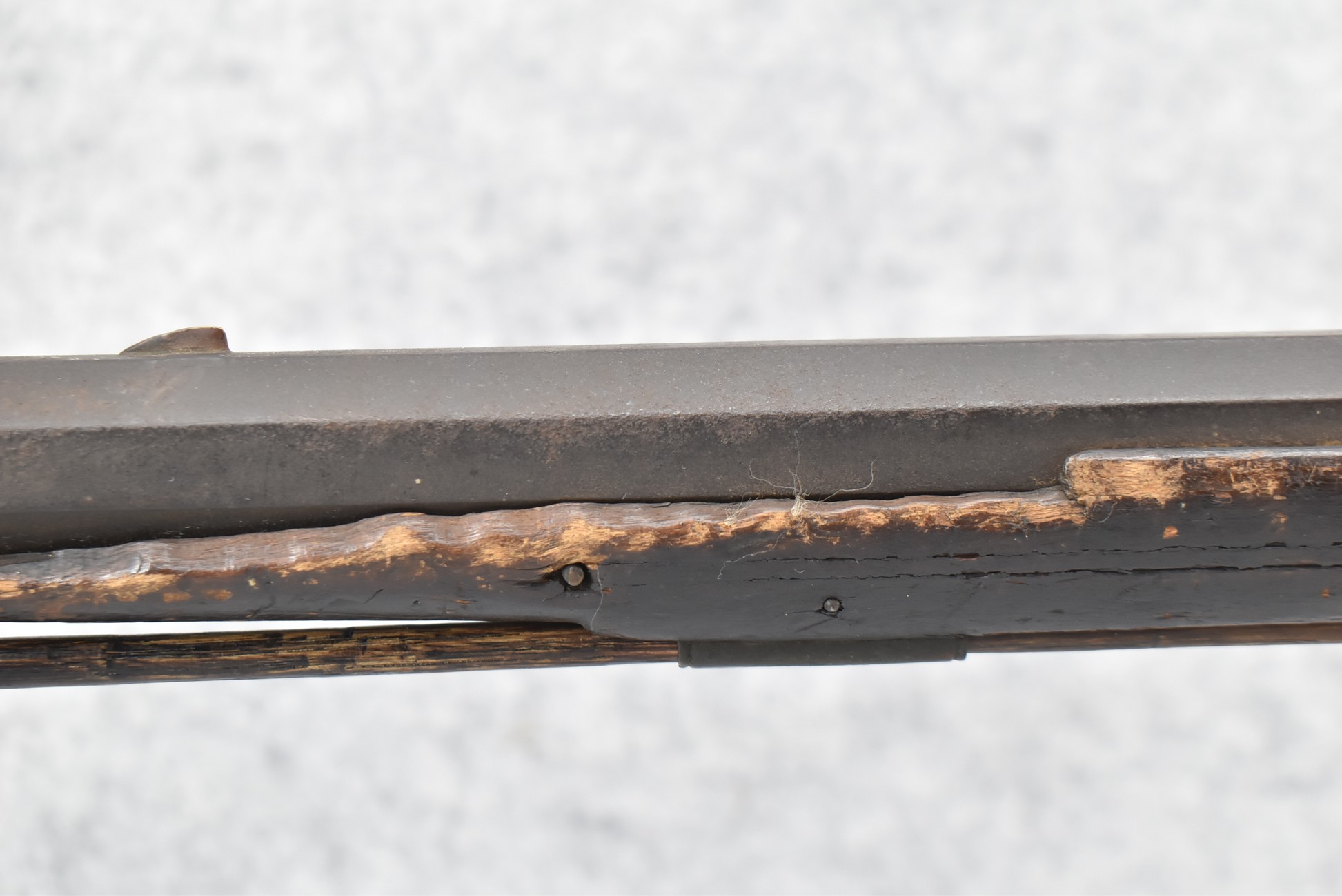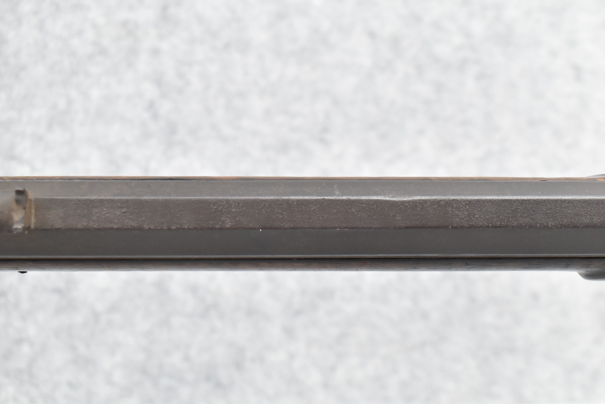128. Converted to Percussion Full Stock Kentucky Rifle – w/36 Cal. 36” Octagon Barrel – w/Full Tiger Maple Wood Stock w/Brass Butt Plate & Brass Trigger Guard – w/Moore Henszey & Co. Percussion Lock – w/Double Set Triggers – w/Ram Rod – Possible Huntingdon County – Overall Length of 52”