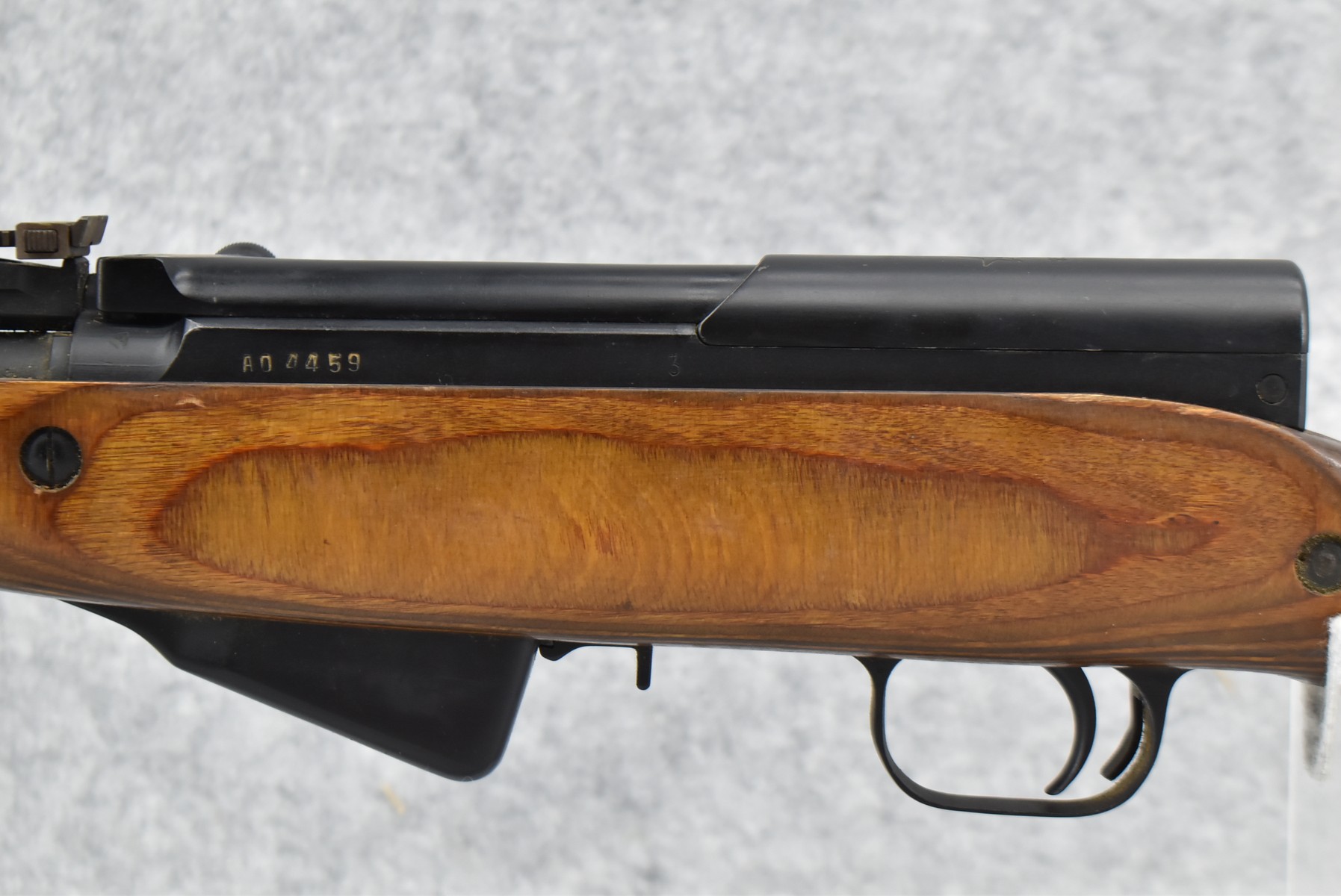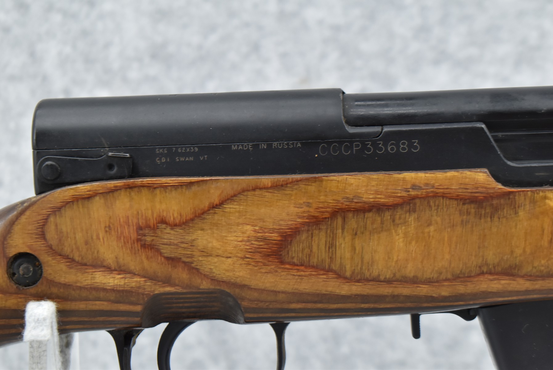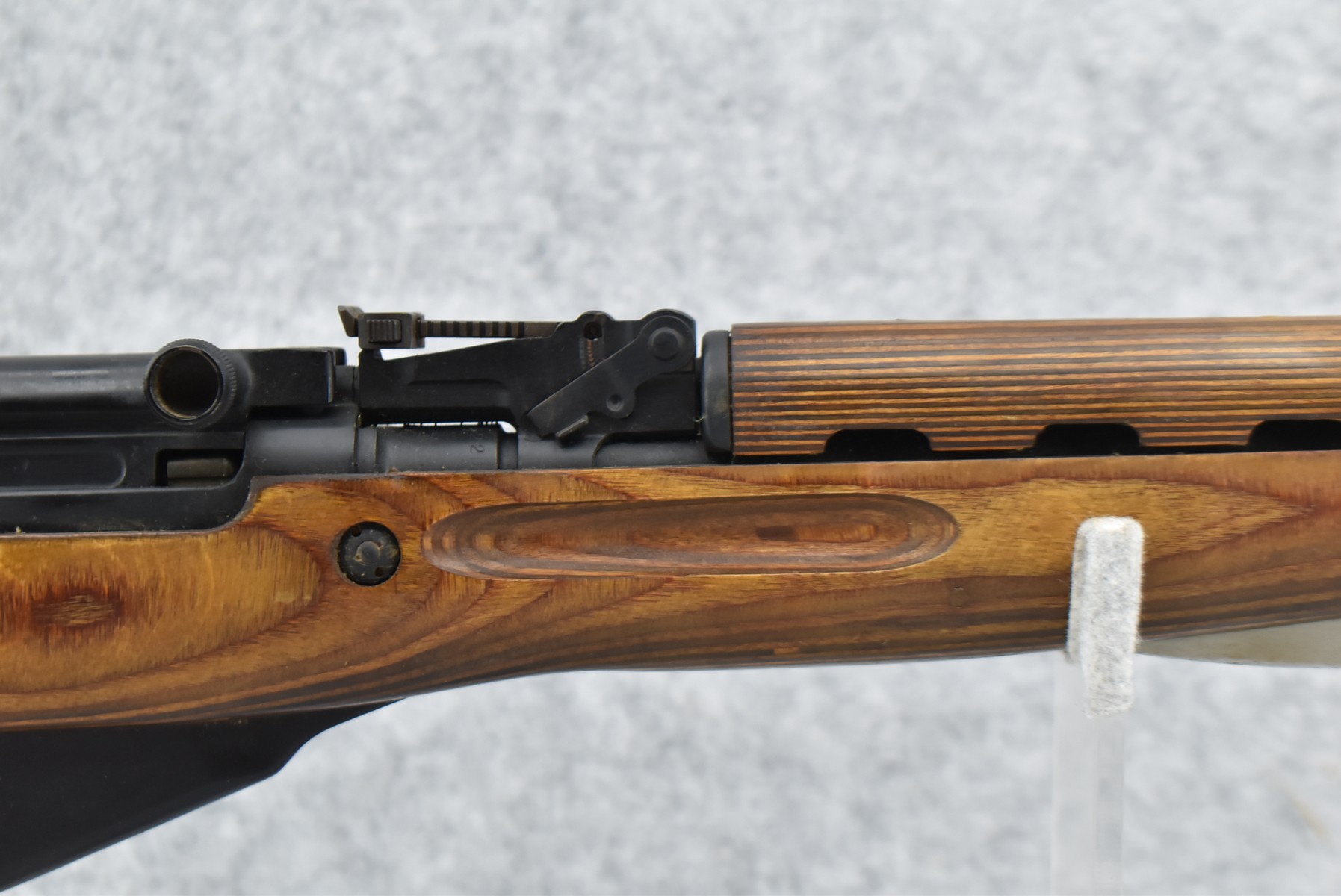 128R. Russian – Mod. SKS – 7.62×39 Cal. Semi-Auto Rifle – w/20” Barrel w/Hooded Front & Adj. Rear Ladder Sights – Blued Finish – w/Pistol Grip Wood Stock w/Factory Metal Butt Plate – w/Cleaning Rod & Folding Knife Bayonet – Import Marked
