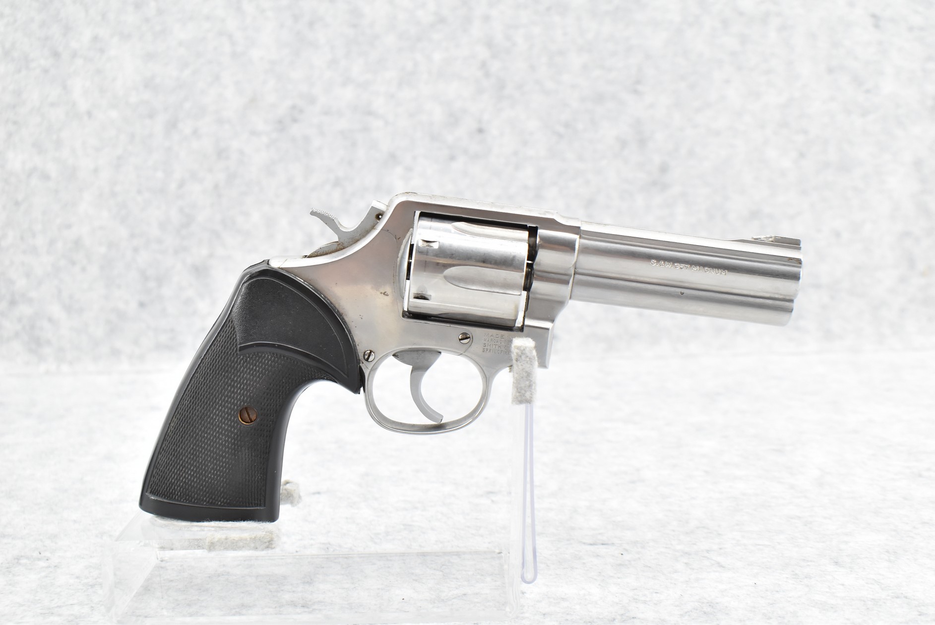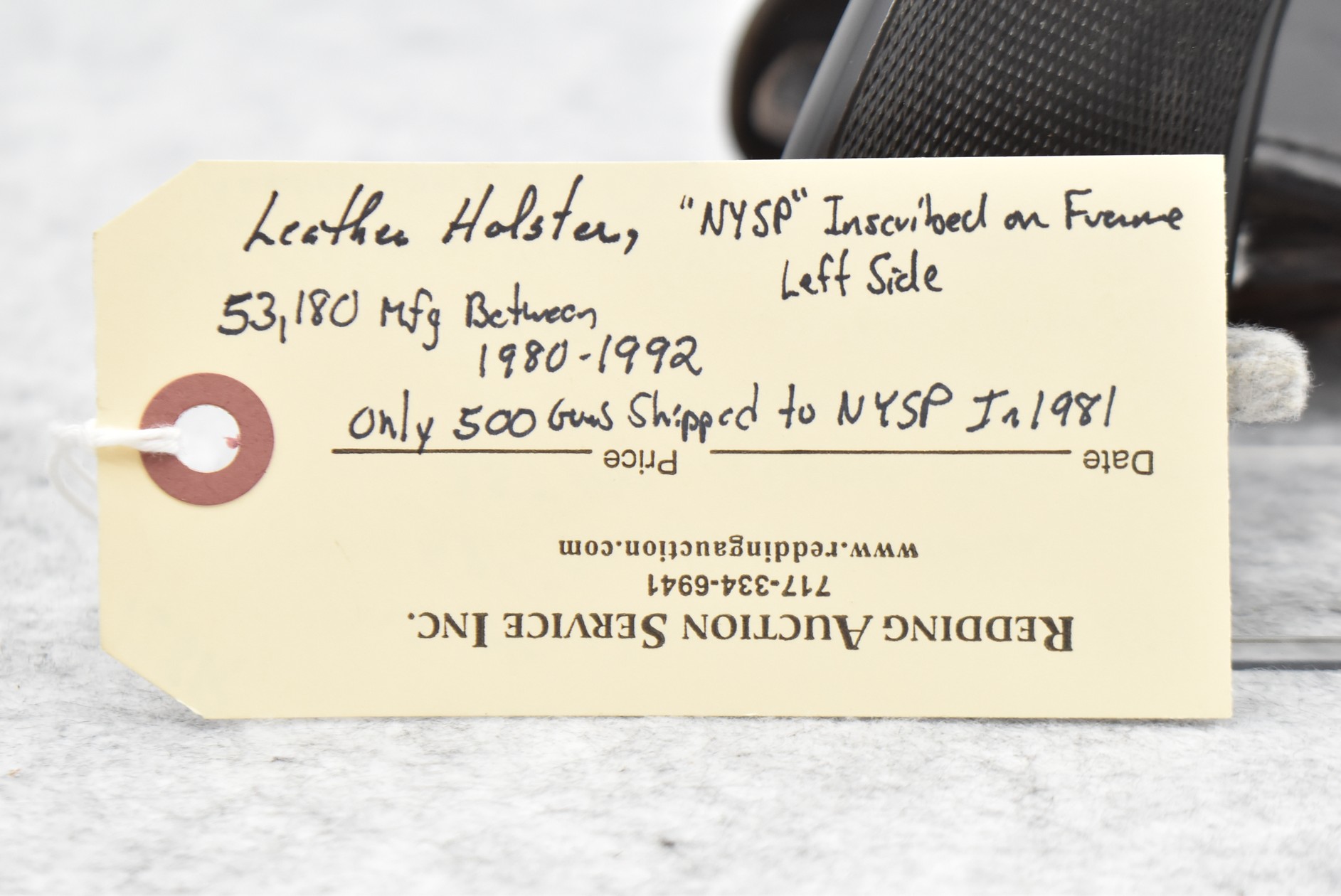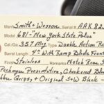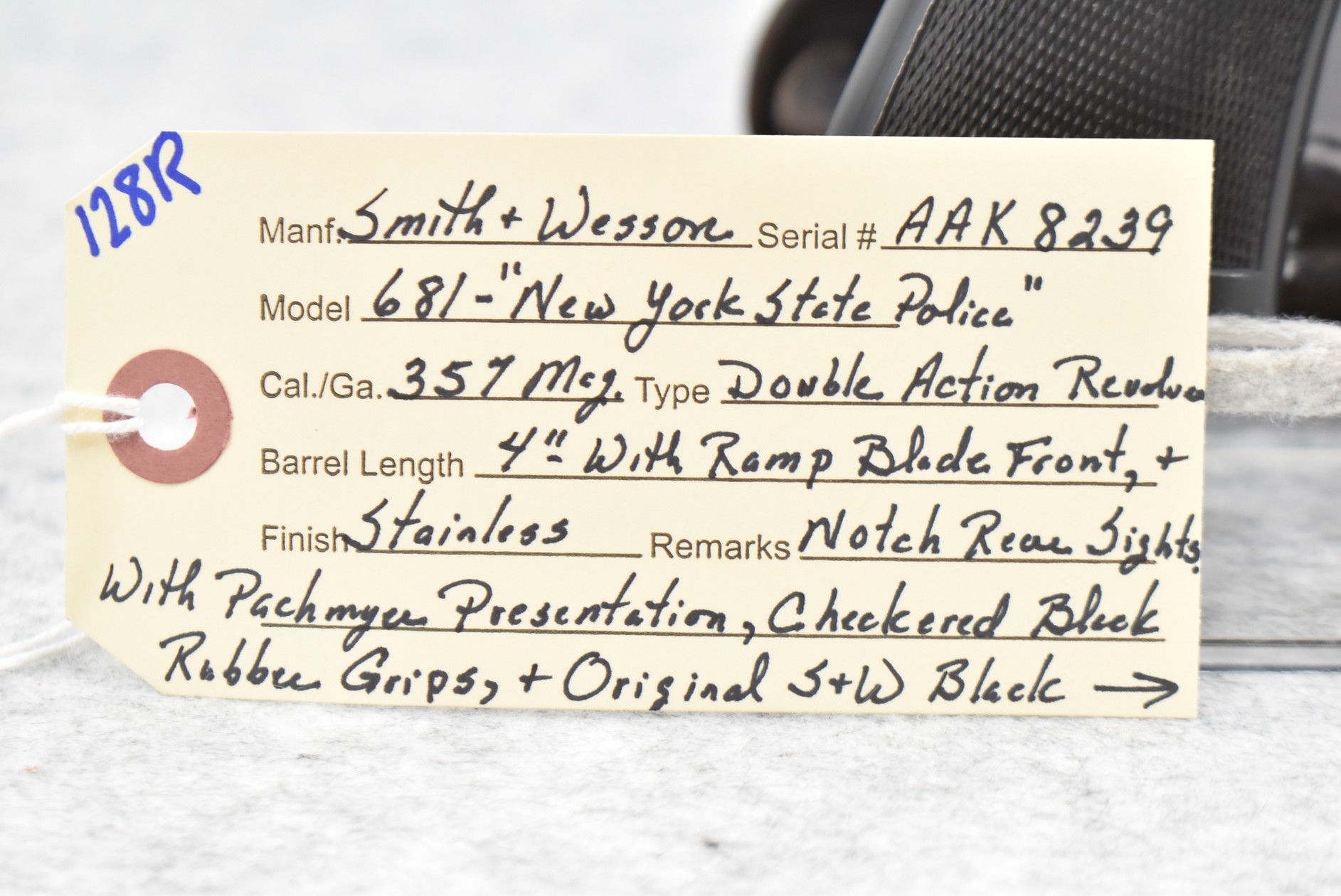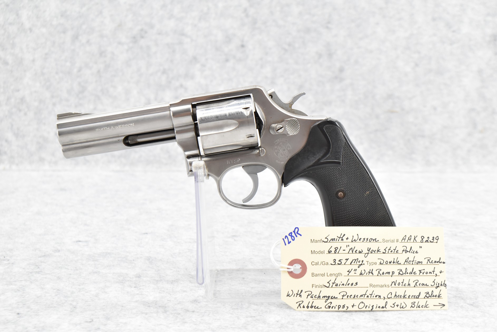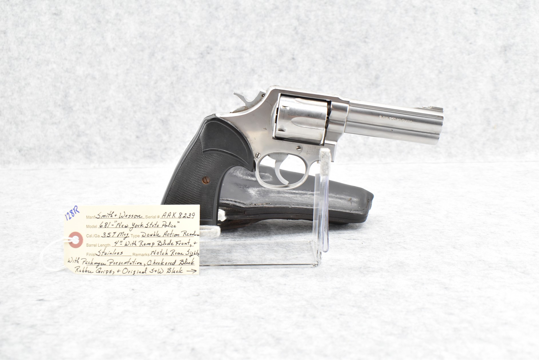 128R. Smith & Wesson – Mod. 681 “New York State Police” – 357 Mag. Cal. Double Action Revolver – w/4” Barrel w/Ramp Blade Front & Notch Rear Sights – Stainless Finish – w/Pachmayr Presentation Checkered Black Rubber Grips – “NYSP” Inscribed on Frame Left Side – w/Original S&W Black Leather Holster – 53,180 Mfg. Between 1980-1992 – Only 500 Guns Sipped to NYSP in 1981
