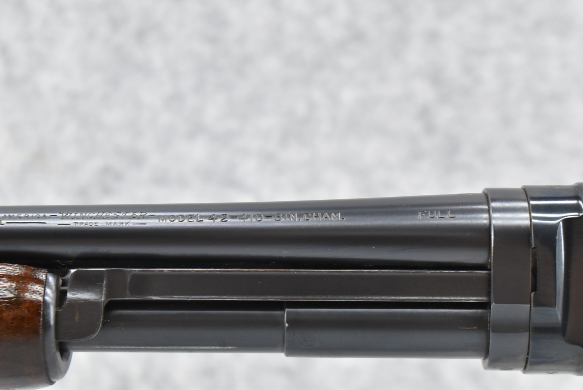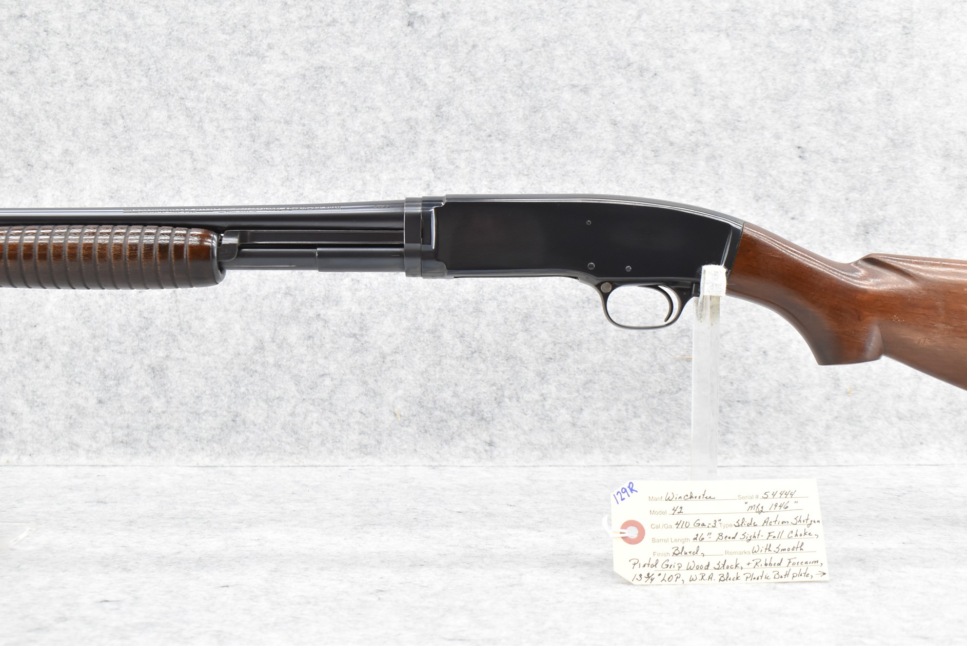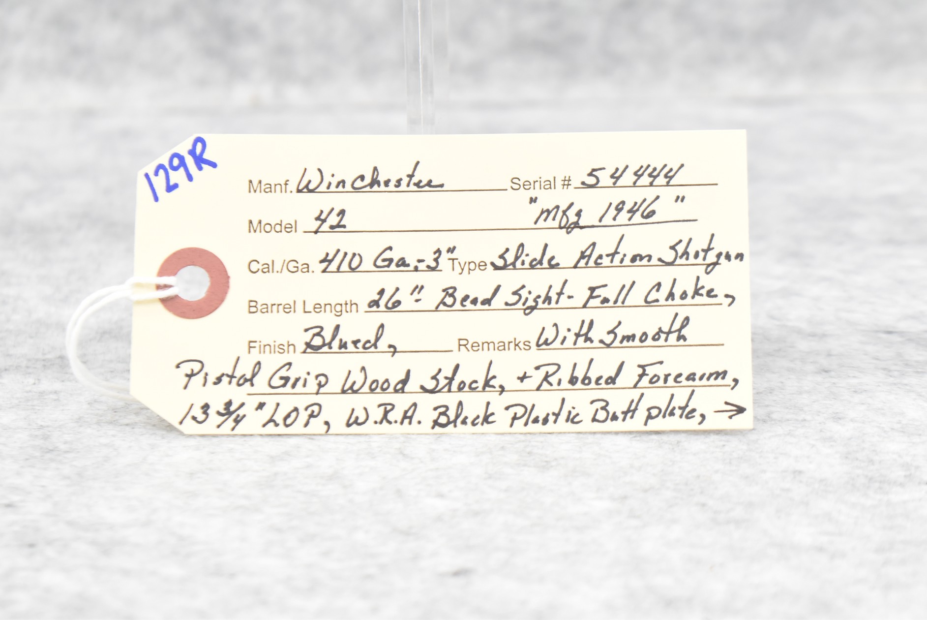 129R. Winchester – Mod. 42 – 410ga. 3” Pump Action Shotgun – w/26” Full Choke Barrel w/Bead Sight – Blued Finish – w/Smooth Pistol Grip Wood Stock & Ribbed Forearm w/Factory Butt Plate – Mfg. 1946