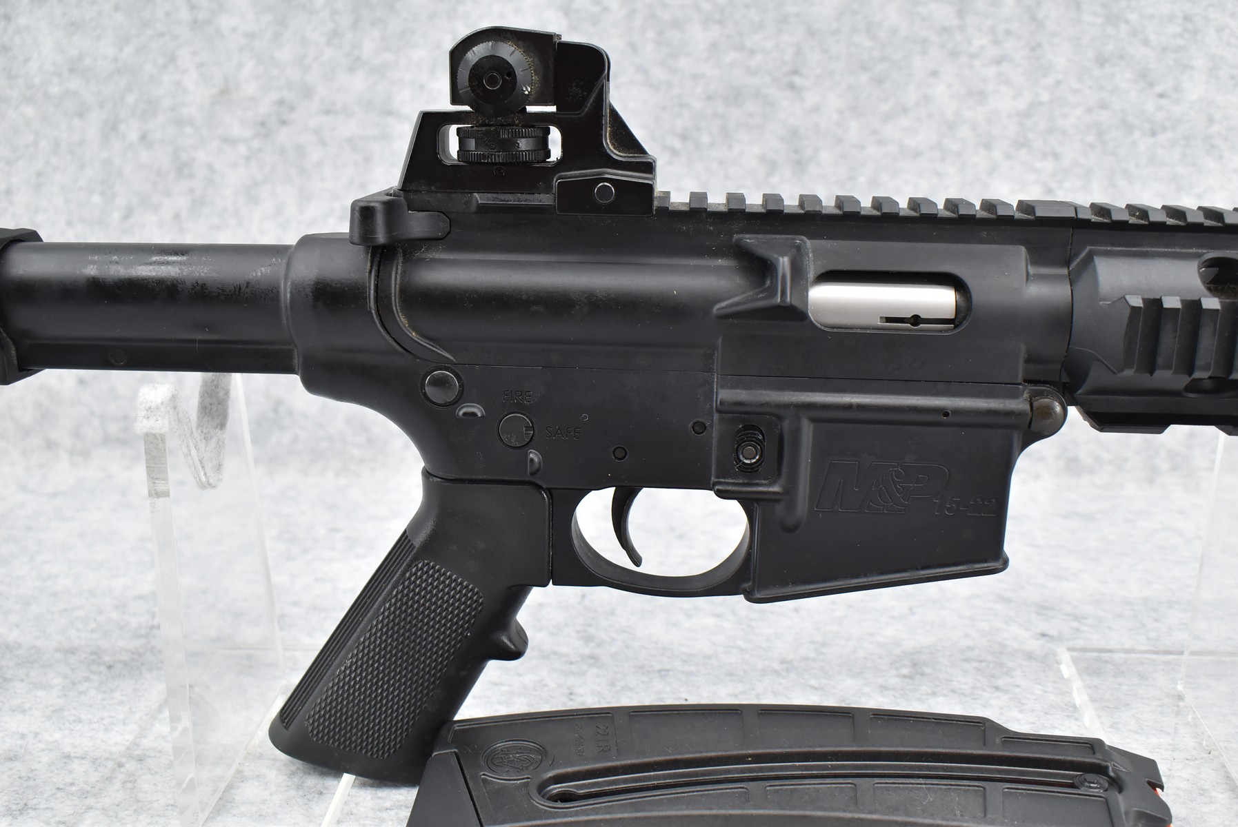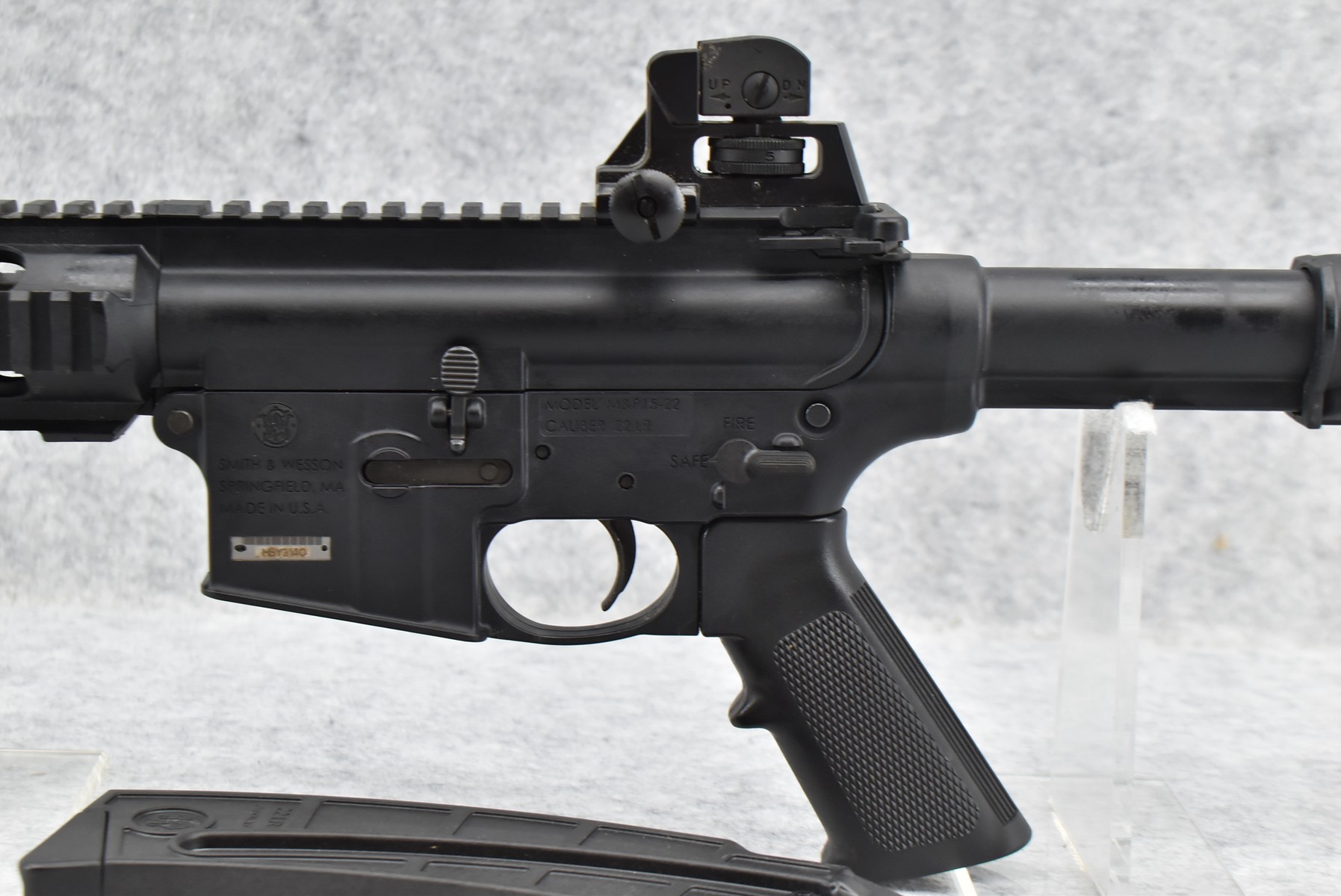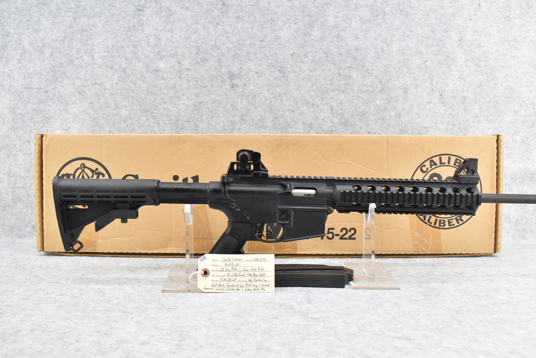 12R. Smith & Wesson – Mod. M&P 15-22 – 22LR Cal. Semi-Auto Rifle – w/16” Barrel w/Post Front and Adjustable Rear Sights – Matte Blued Finish – w/Adjustable Position Synthetic Butt Stock and Checkered Synthetic Pistol Grip and Vented Forearm – Unfired w/Factory Box and Factory 25-Round Magazine