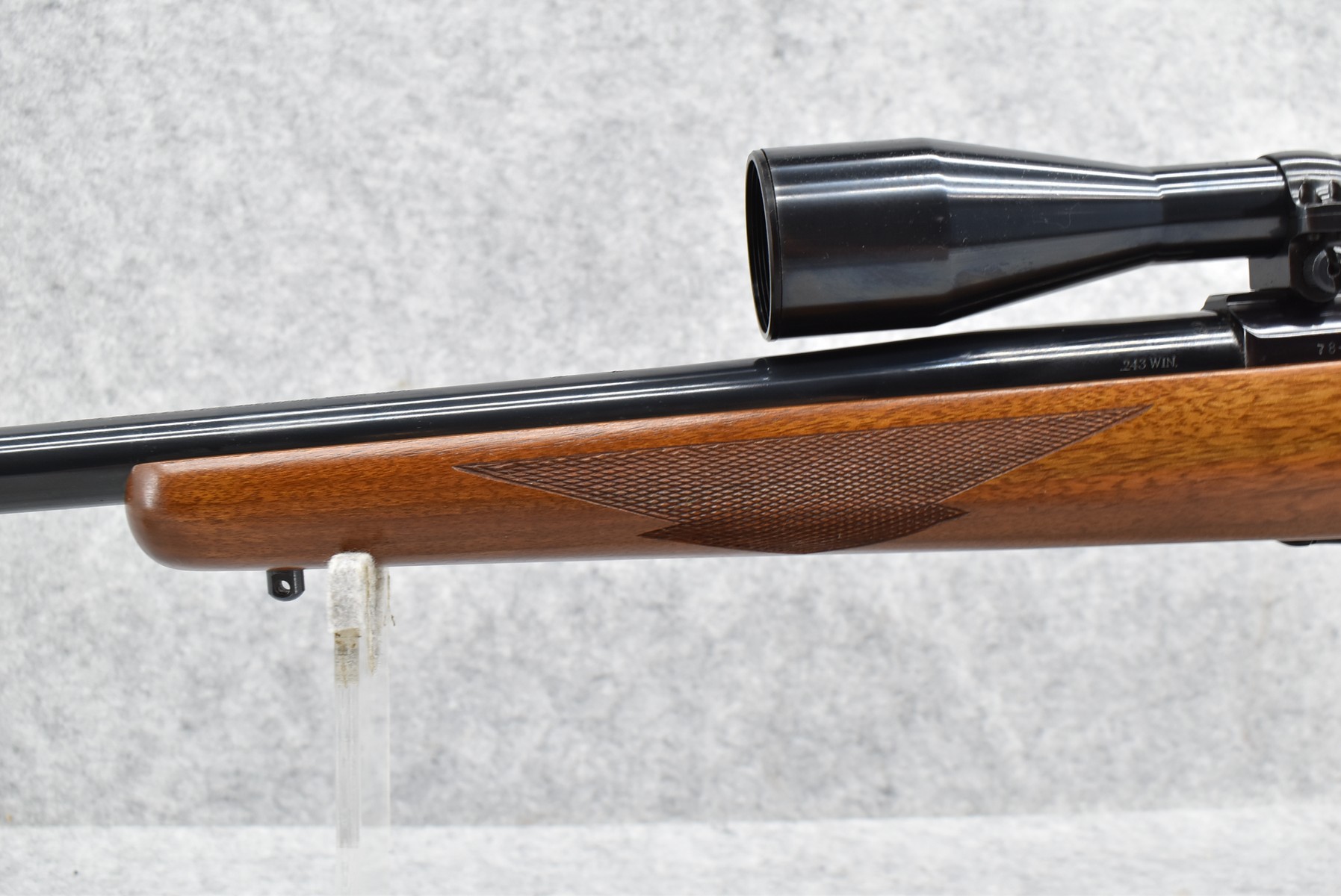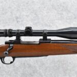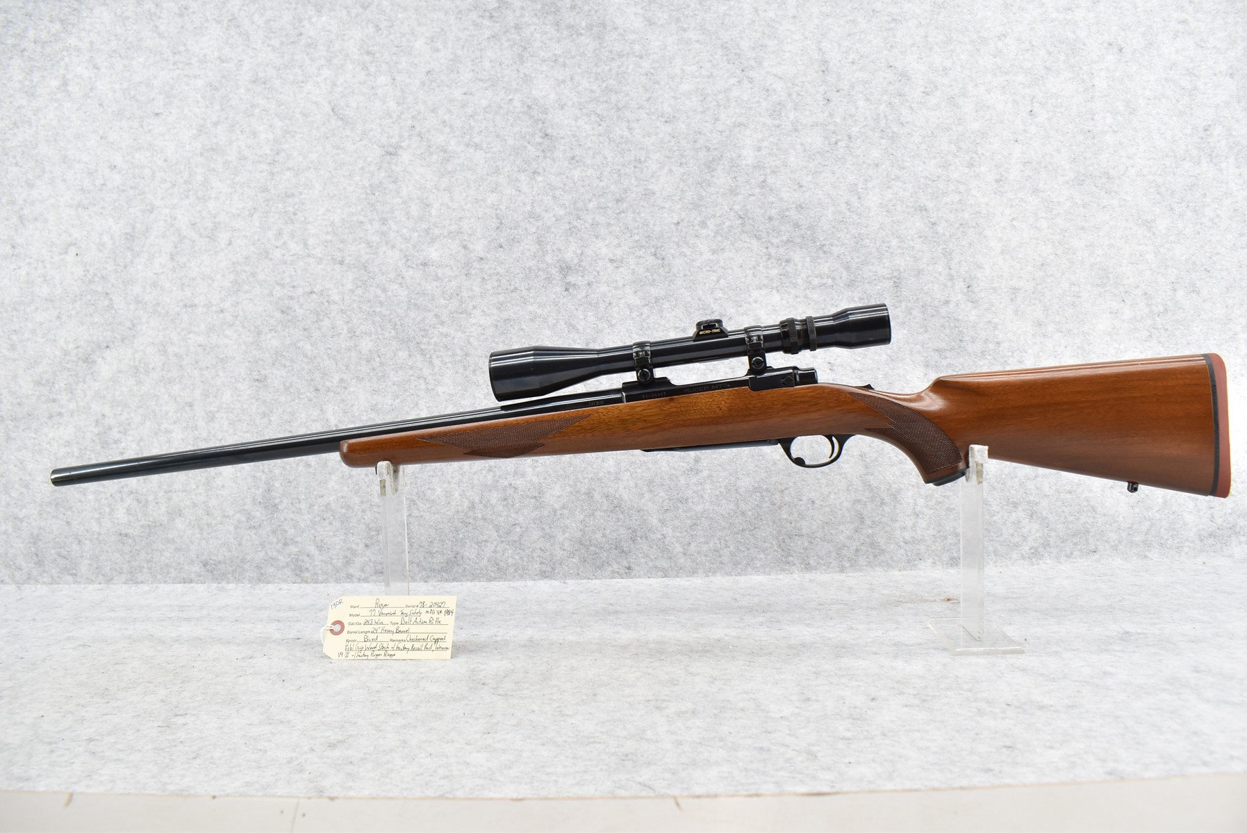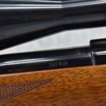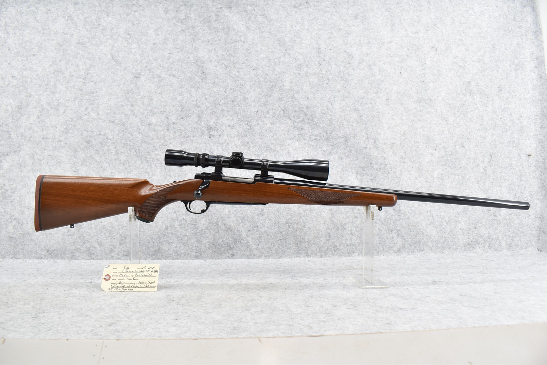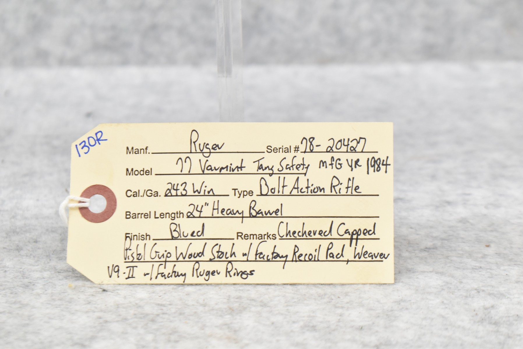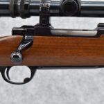 130R. Ruger – Mod. 77 Varmint Tang Safety – 243 Win. Cal. Bolt Action Rifle – w/24” Heavy Barrel – Blued Finish – w/Checkered Capped Pistol Grip Wood Stock w/Factory Recoil Pad – w/Period Weaver V9-II Scope – w/Factory Ruger Ring – Mfg. 1984