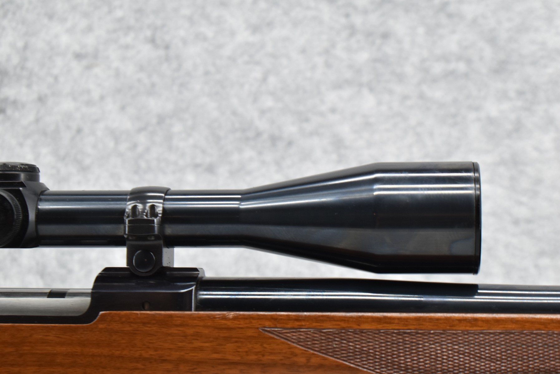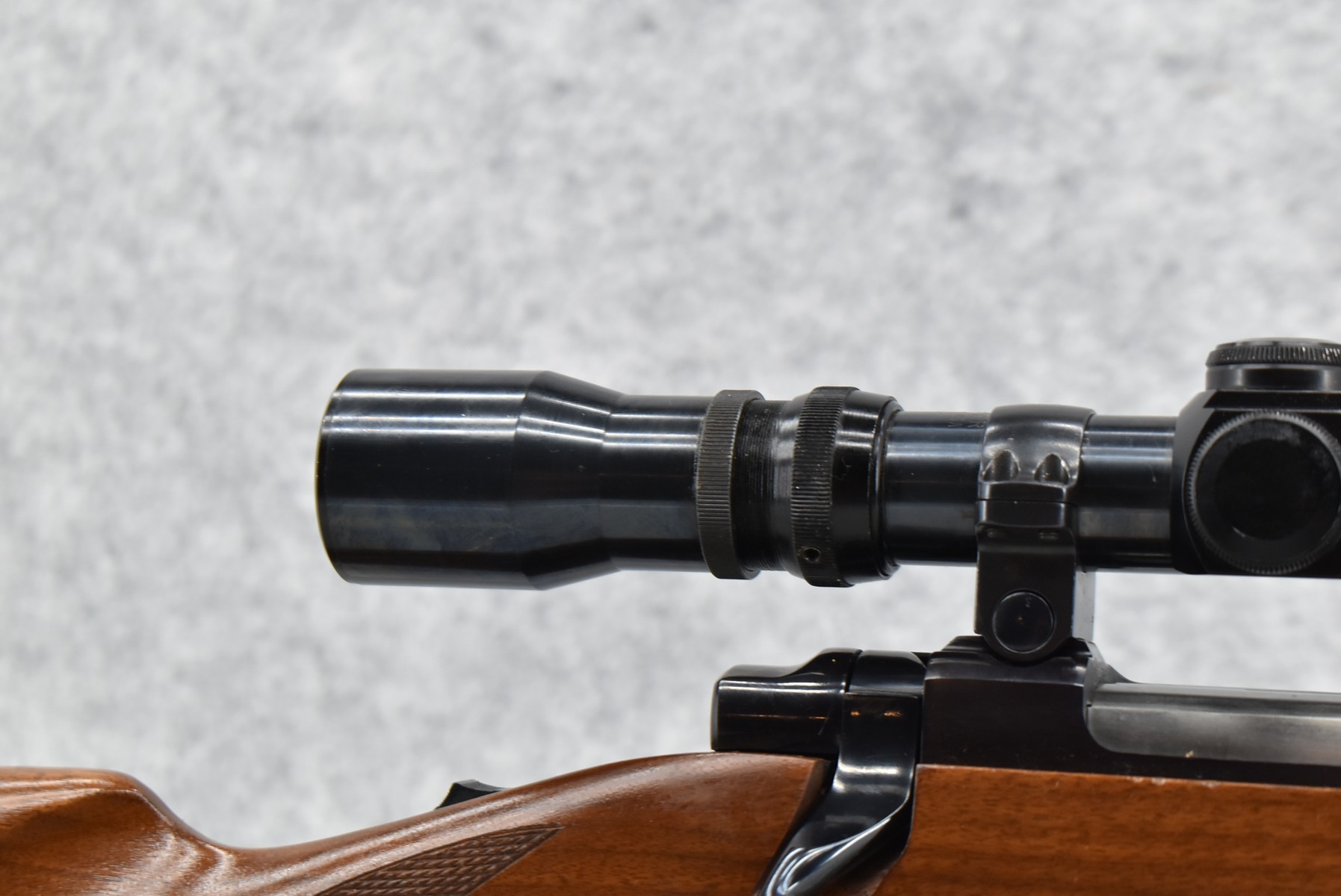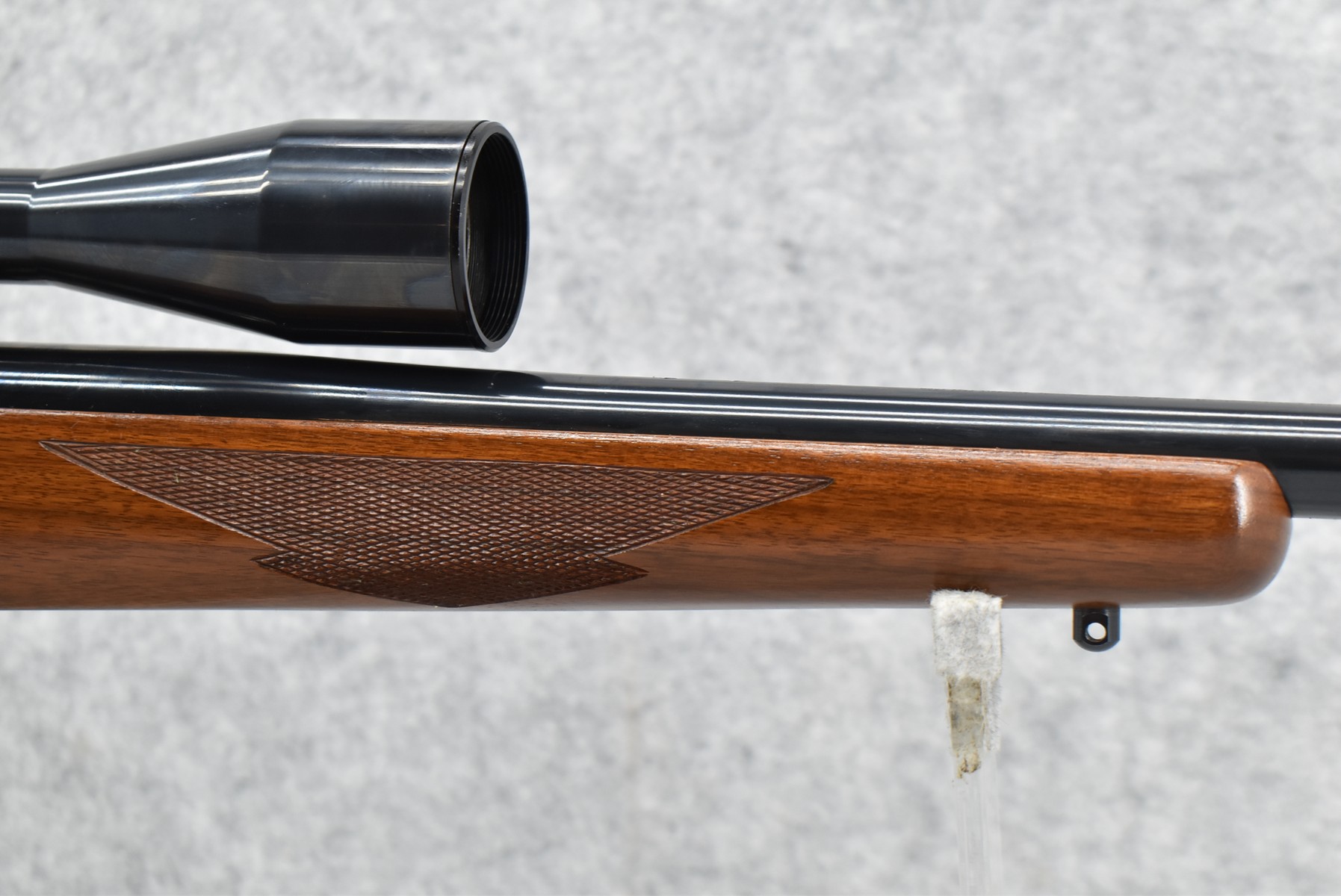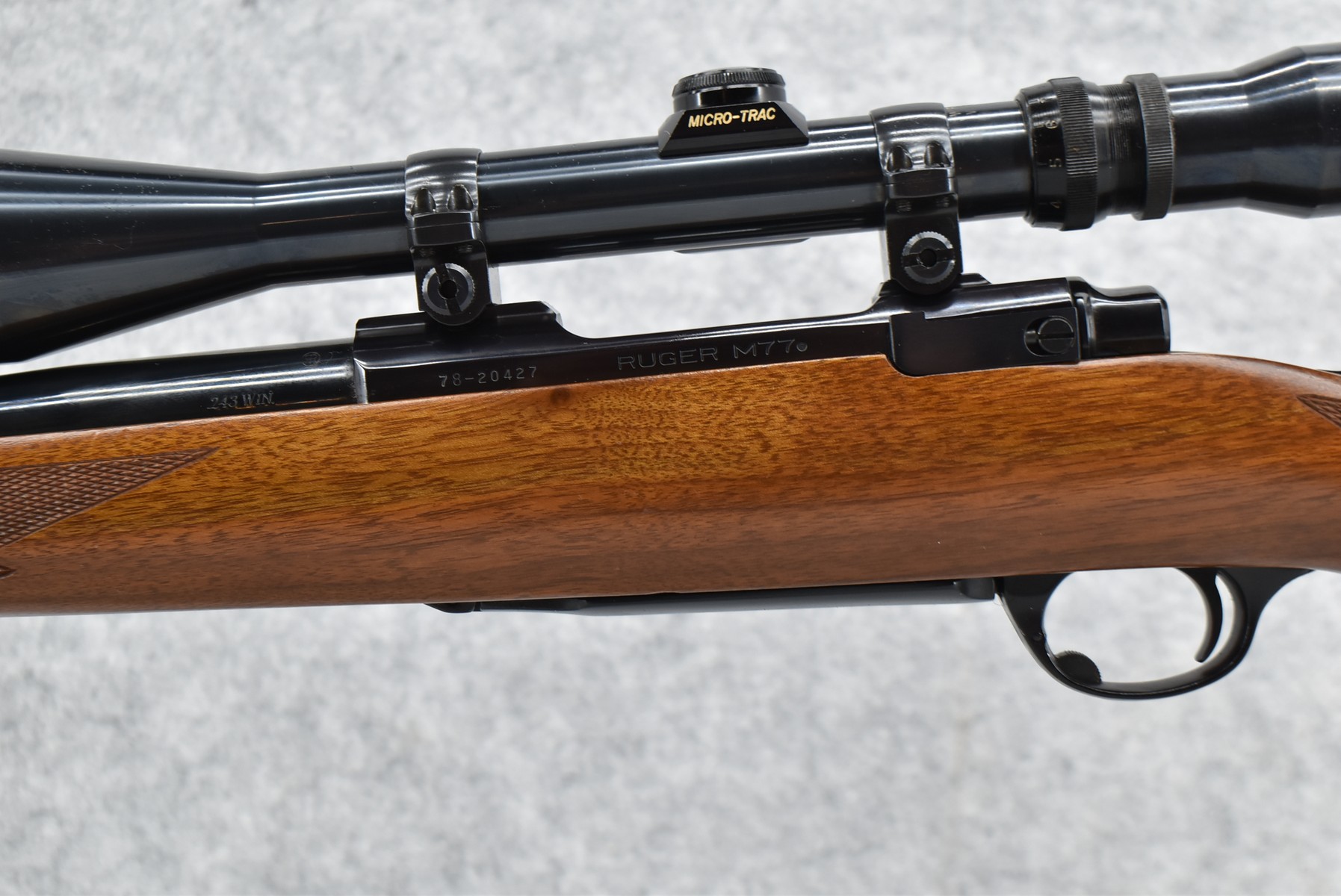 130R. Ruger – Mod. 77 Varmint Tang Safety – 243 Win. Cal. Bolt Action Rifle – w/24” Heavy Barrel – Blued Finish – w/Checkered Capped Pistol Grip Wood Stock w/Factory Recoil Pad – w/Period Weaver V9-II Scope – w/Factory Ruger Ring – Mfg. 1984