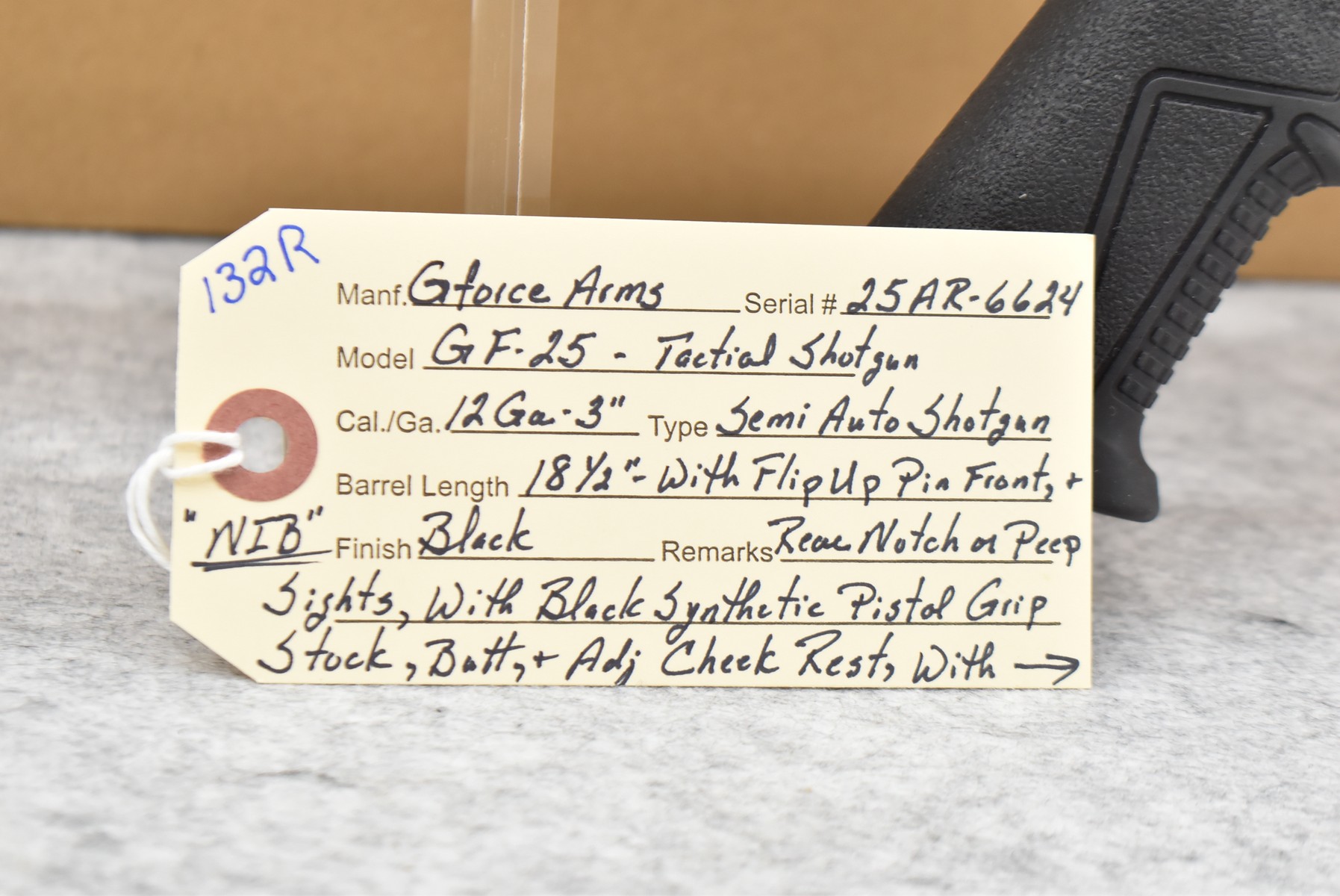 132R. G Force Arms – Mod. GF-25 Tactical Shotgun – 12ga. 3” Semi-Auto Shotgun – w/18 ½” Barrel w/Flip Up Pin Front & Rear Peep Sights – Black Finish – w/Black Synthetic Pistol Grip Stock, Butt & Adj. Cheek Piece – New w/Factory Box, Manuals & Accessories