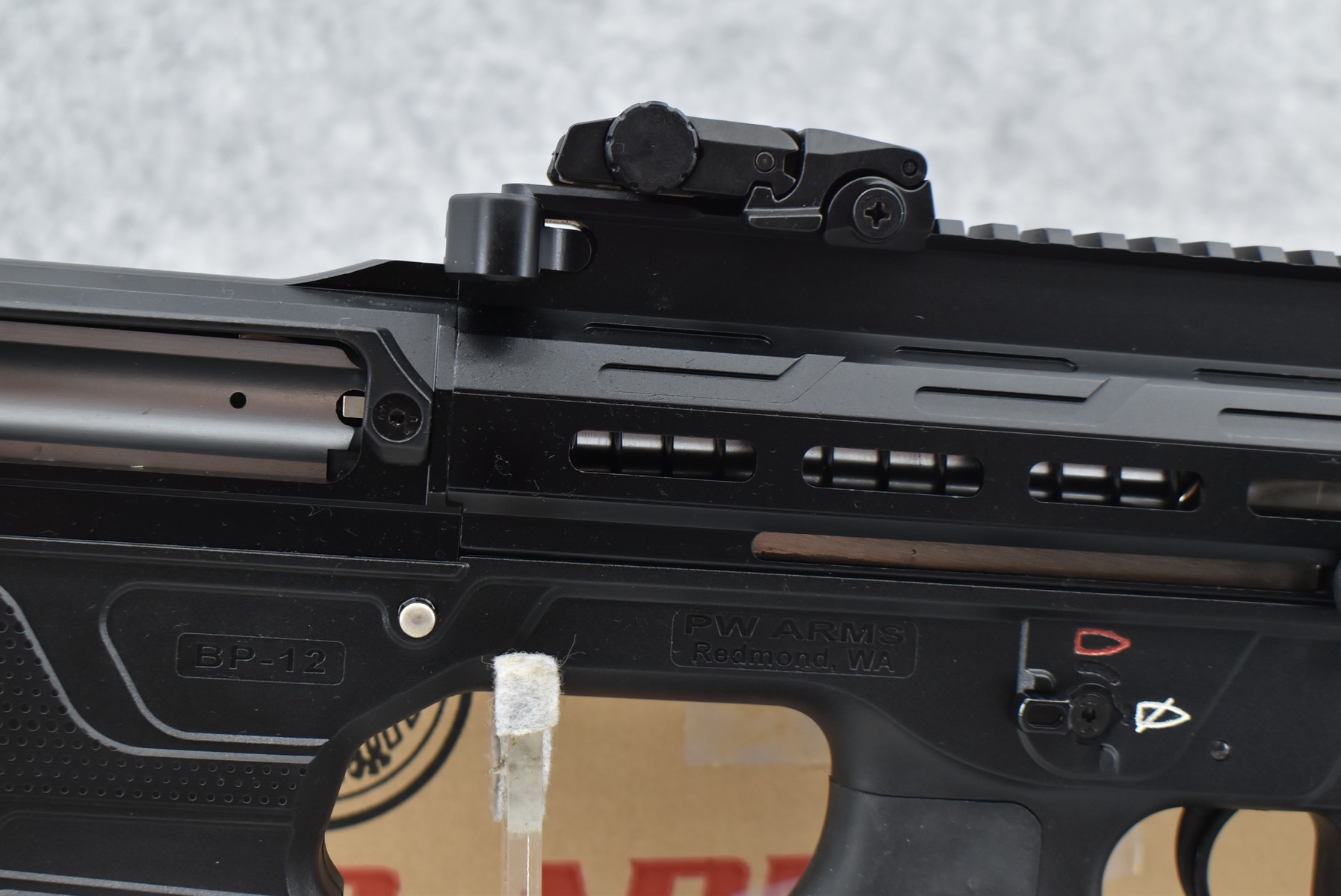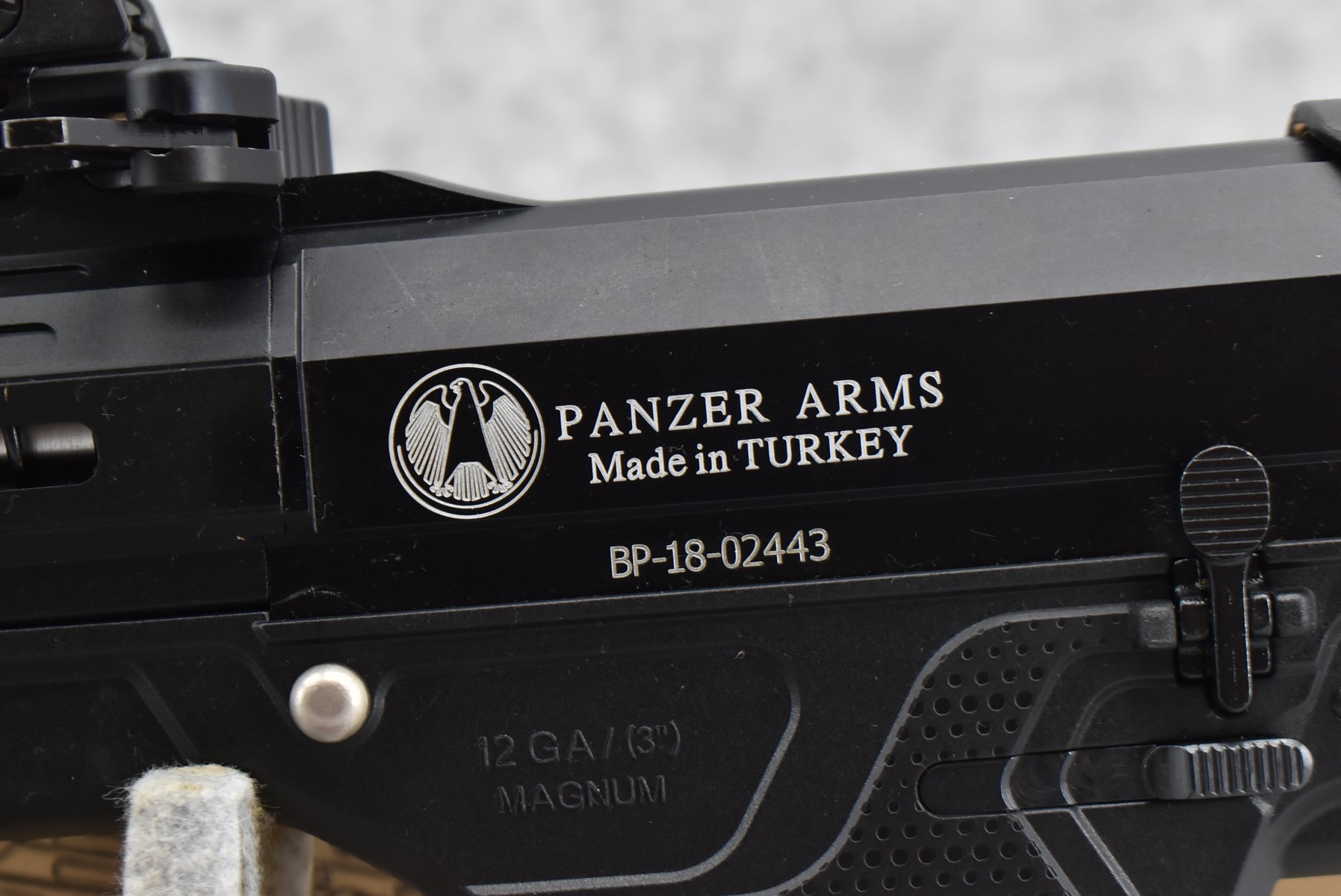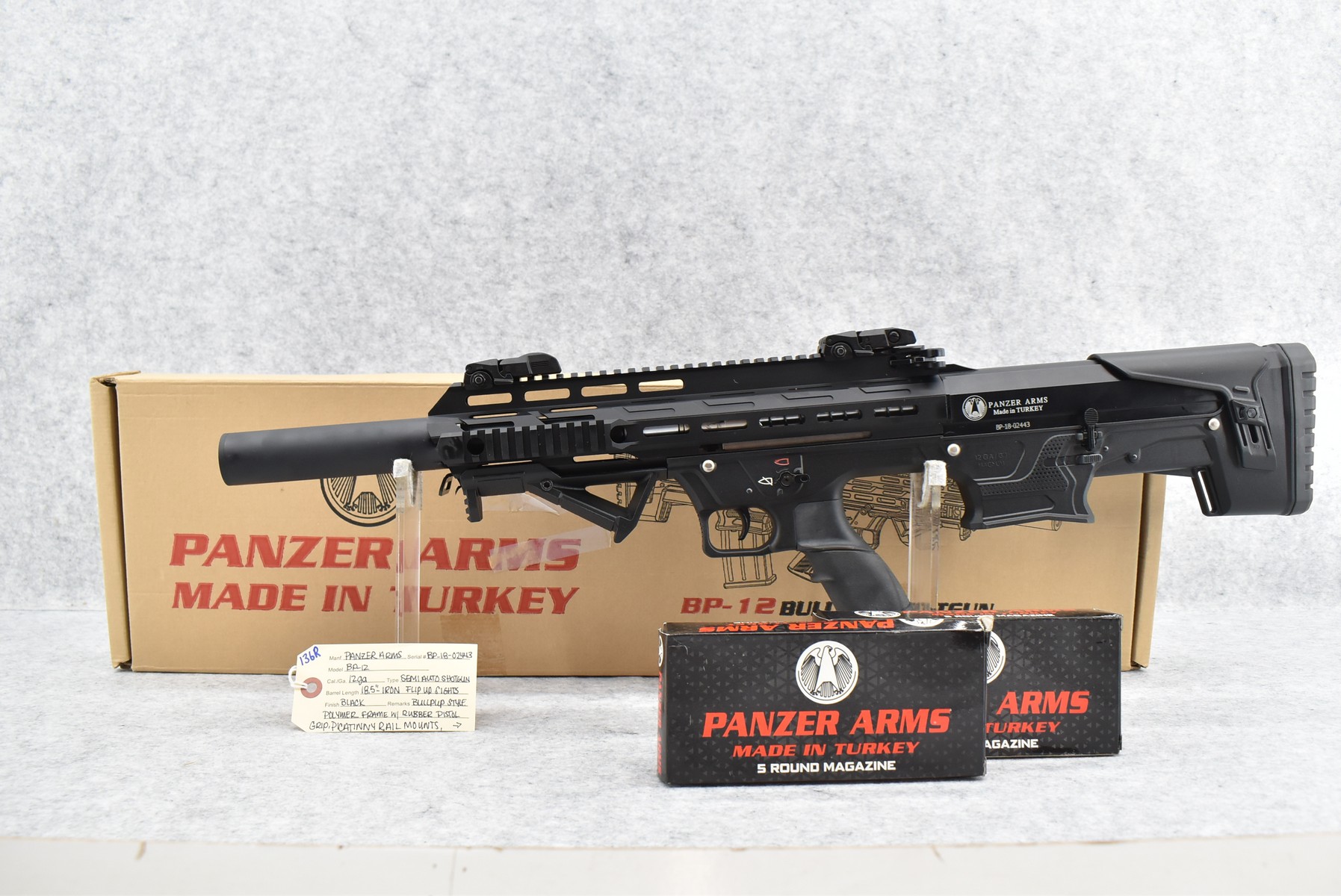 136R. Panzer Arms – Mod. BP-12 – 12ga. Semi-Auto Shotgun – w/18.5” Barrel w/Iron Flip Up Sights – Matte Black Finish – w/Bullpup Style Polymer Frame w/Rubber Pistol Grip – Mag Fed w/2 Factory Mags – w/Picatinny Rail Mounts – Unfired w/Factory Box & Manual