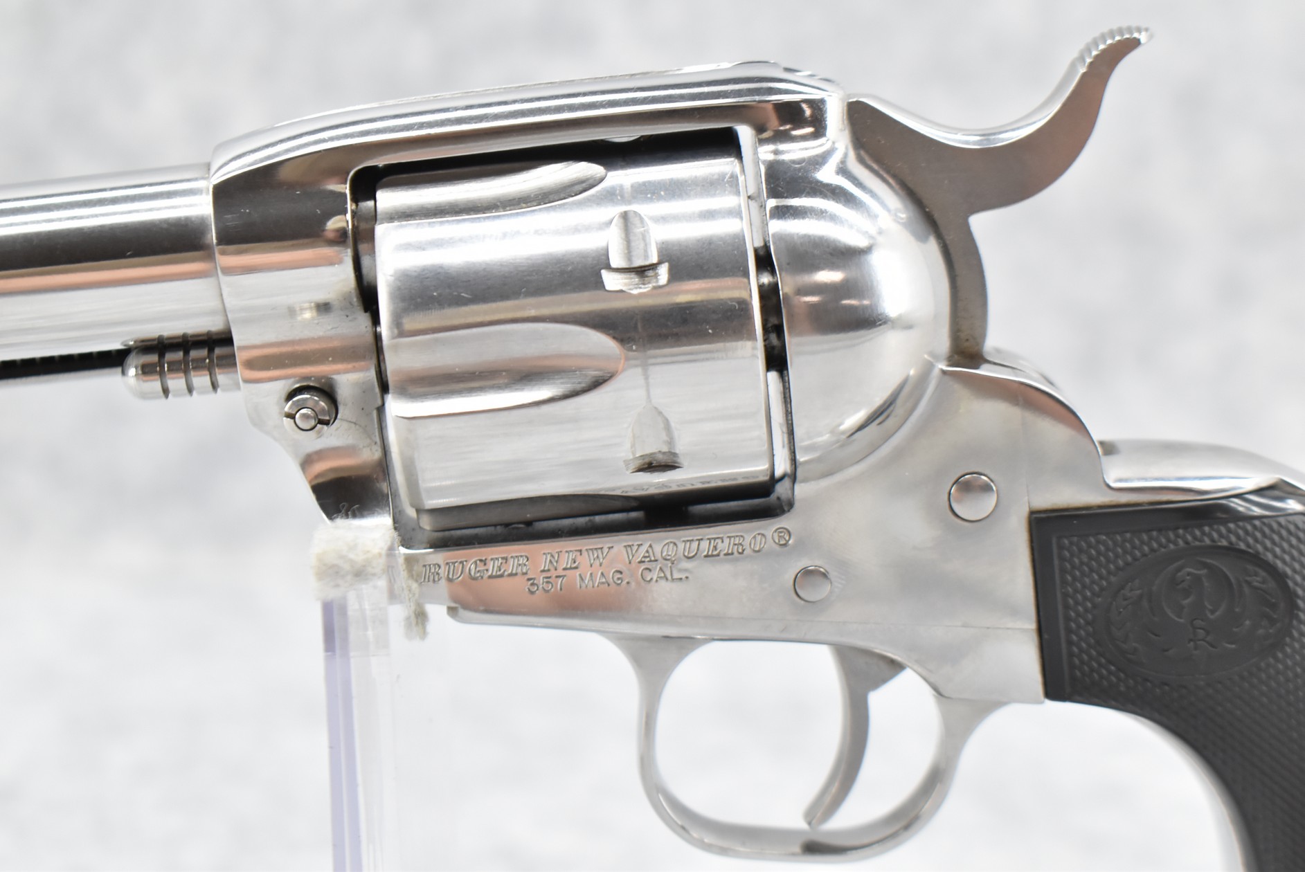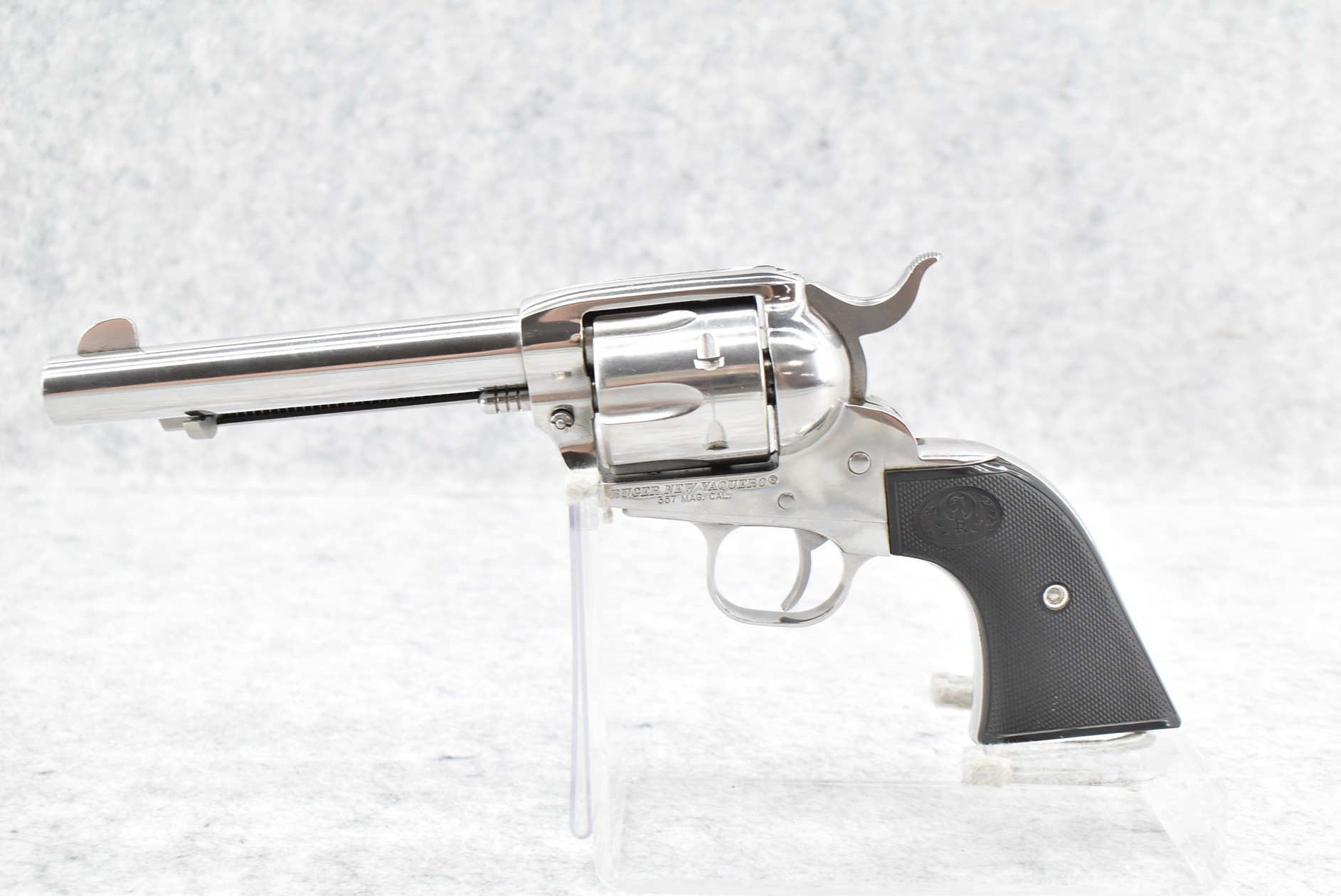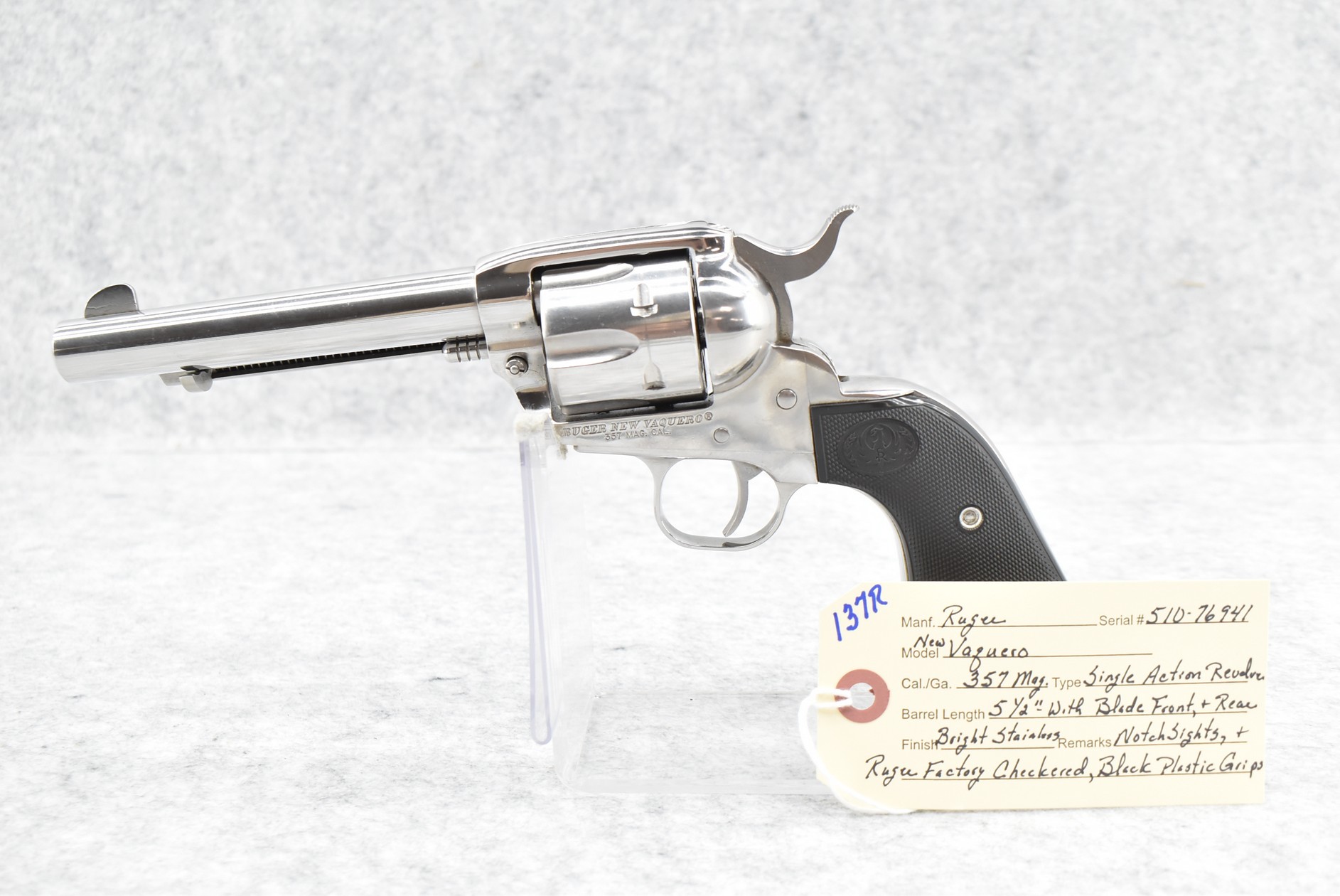 137R. Ruger – Mod. New Vaquero – 357 Mag. Cal. Single Action Revolver – w/5 ½” Barrel w/Blade Front & Rear Notch Sights – Bright Stainless Finish – w/Ruger Factory Checkered Black Plastic Grips