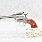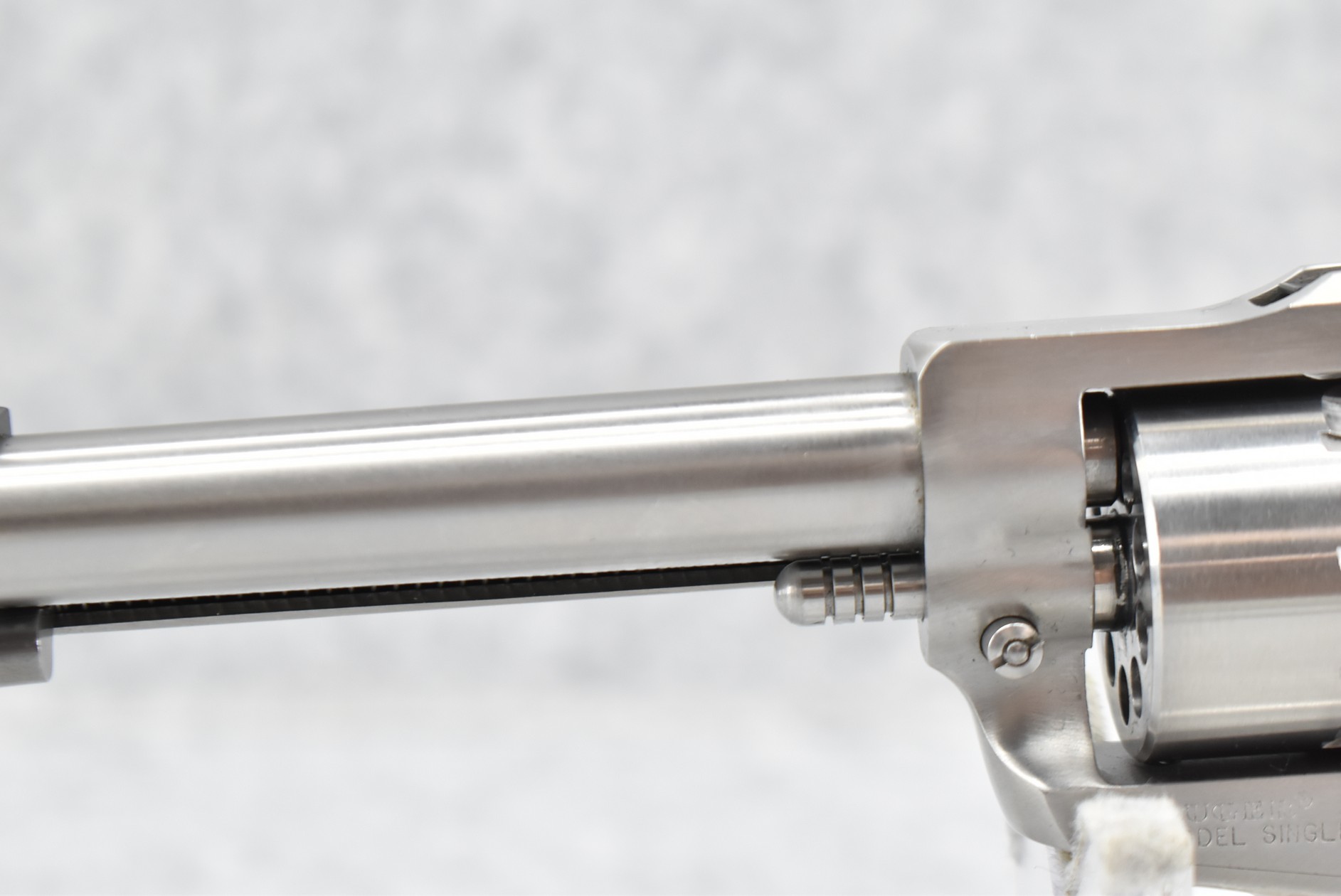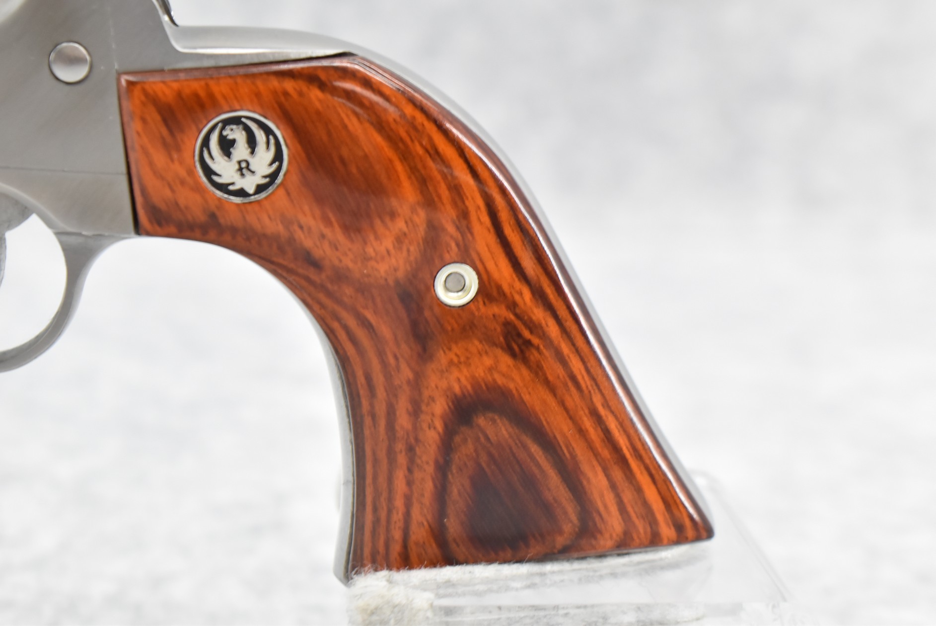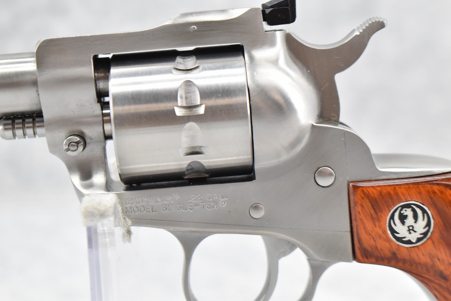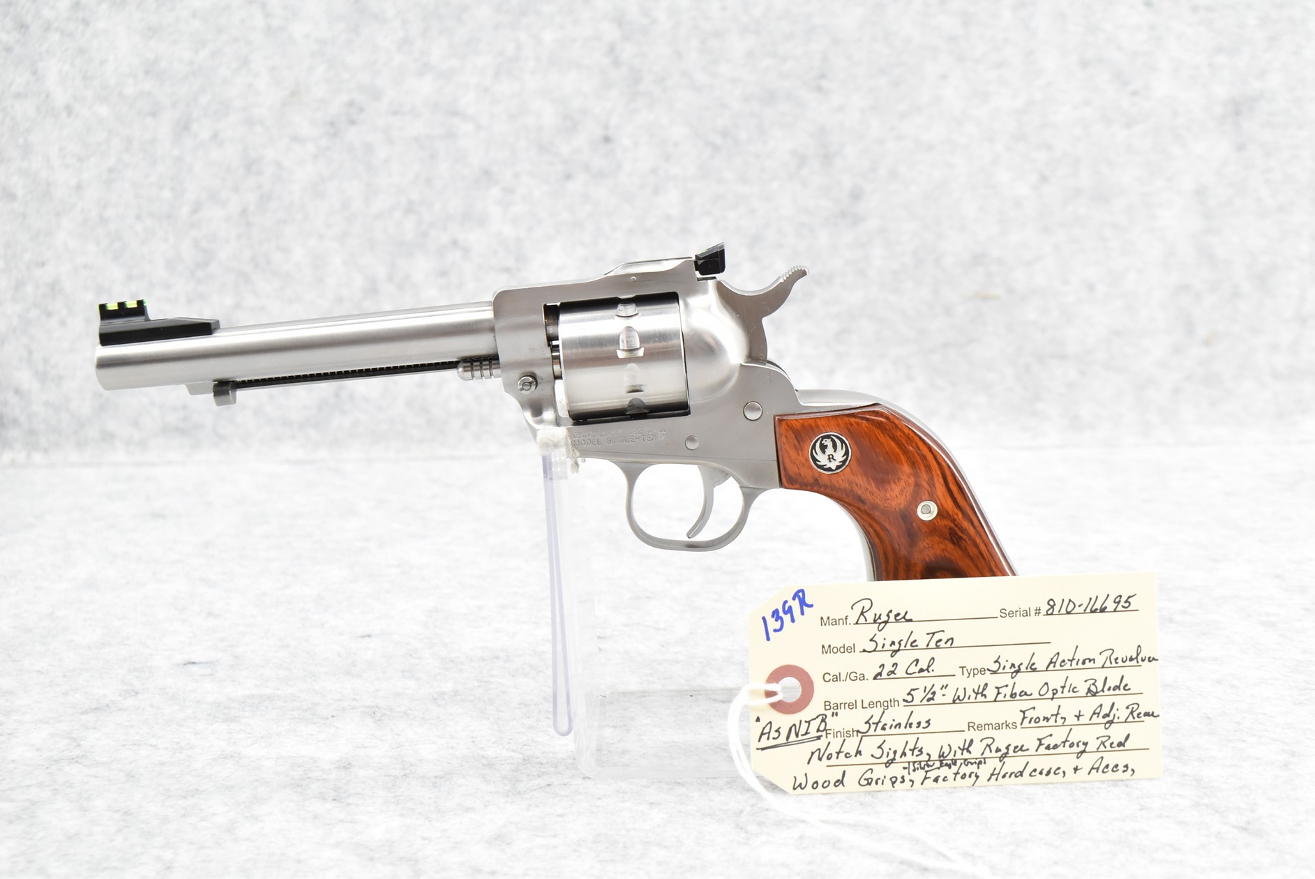 139R. Ruger – Mod. Single Ten – 22 Cal. Single Action Revolver – w/5 ½” Barrel w/Fiber Optic Blade Front & Adj. Rear Notch Sights – Stainless Finish – w/Ruger Factory Red Wood Grips w/Silver Eagle – As New w/Factory Hard Case & Accessories