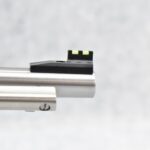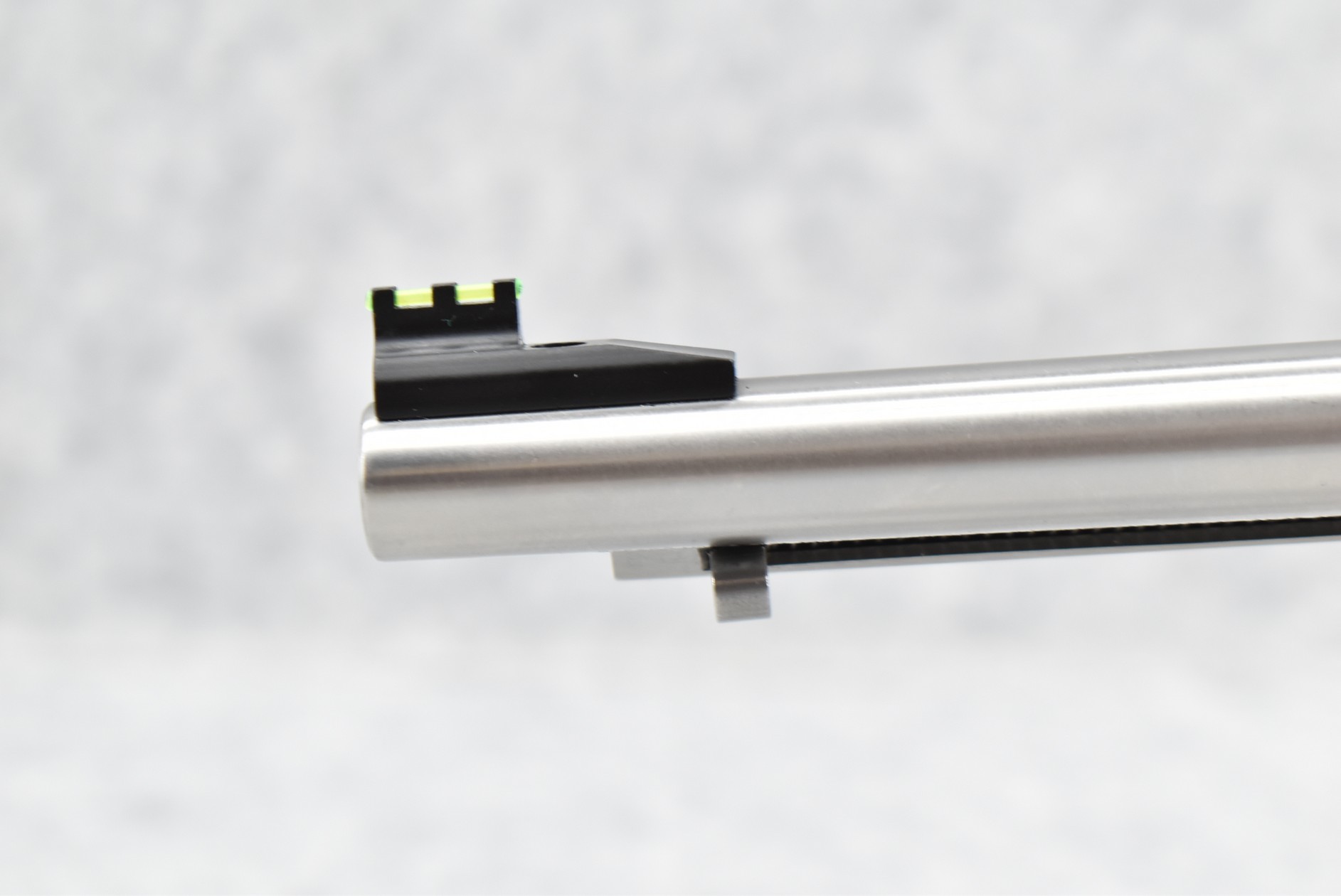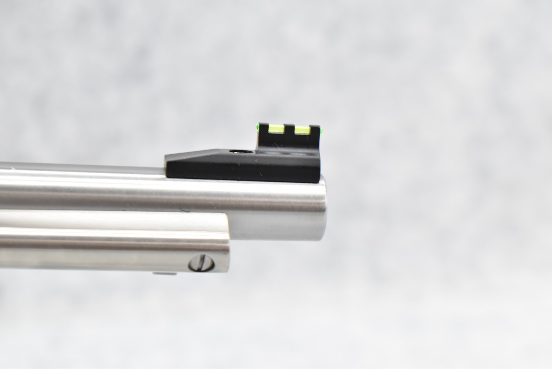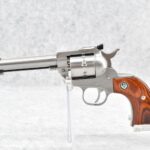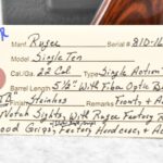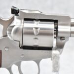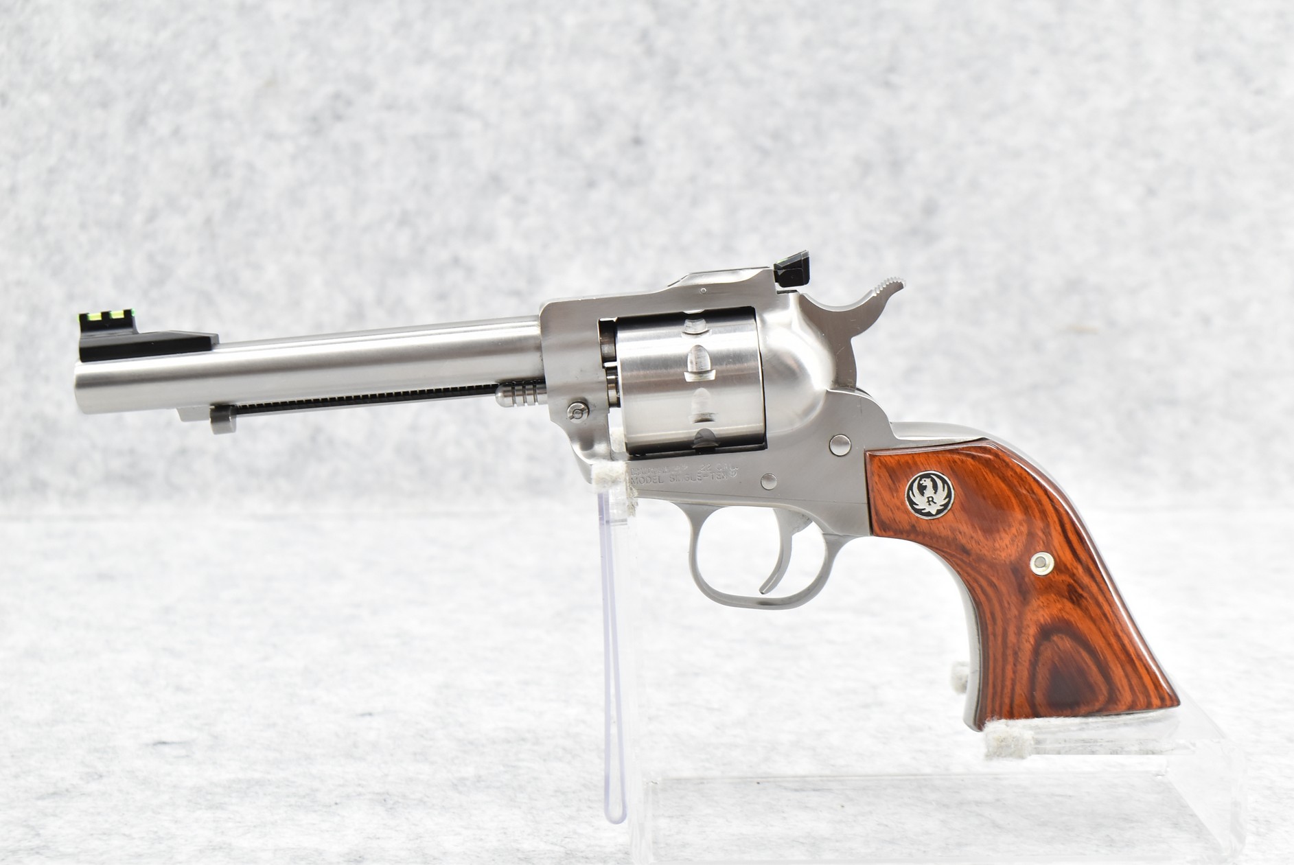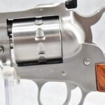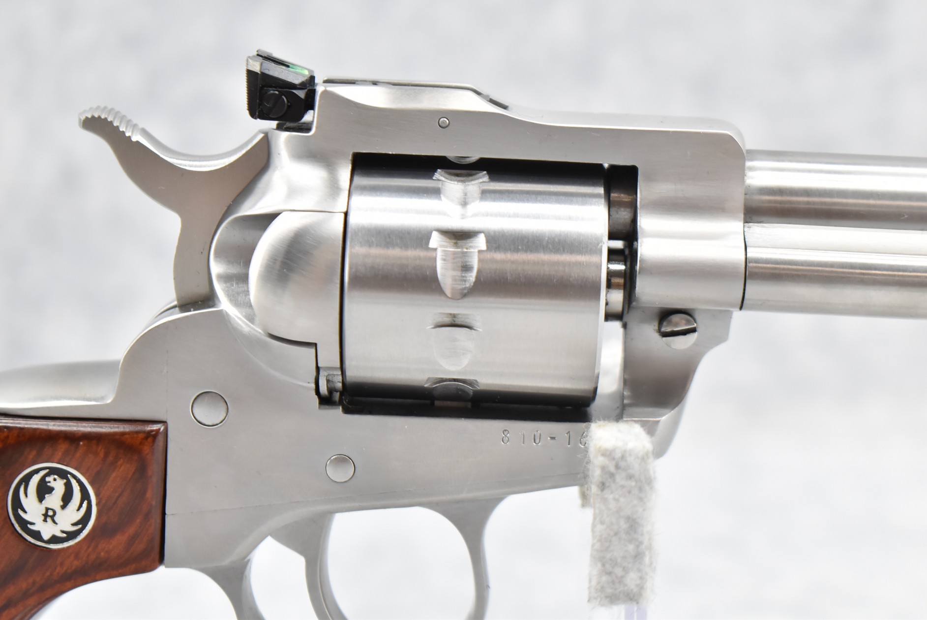 139R. Ruger – Mod. Single Ten – 22 Cal. Single Action Revolver – w/5 ½” Barrel w/Fiber Optic Blade Front & Adj. Rear Notch Sights – Stainless Finish – w/Ruger Factory Red Wood Grips w/Silver Eagle – As New w/Factory Hard Case & Accessories