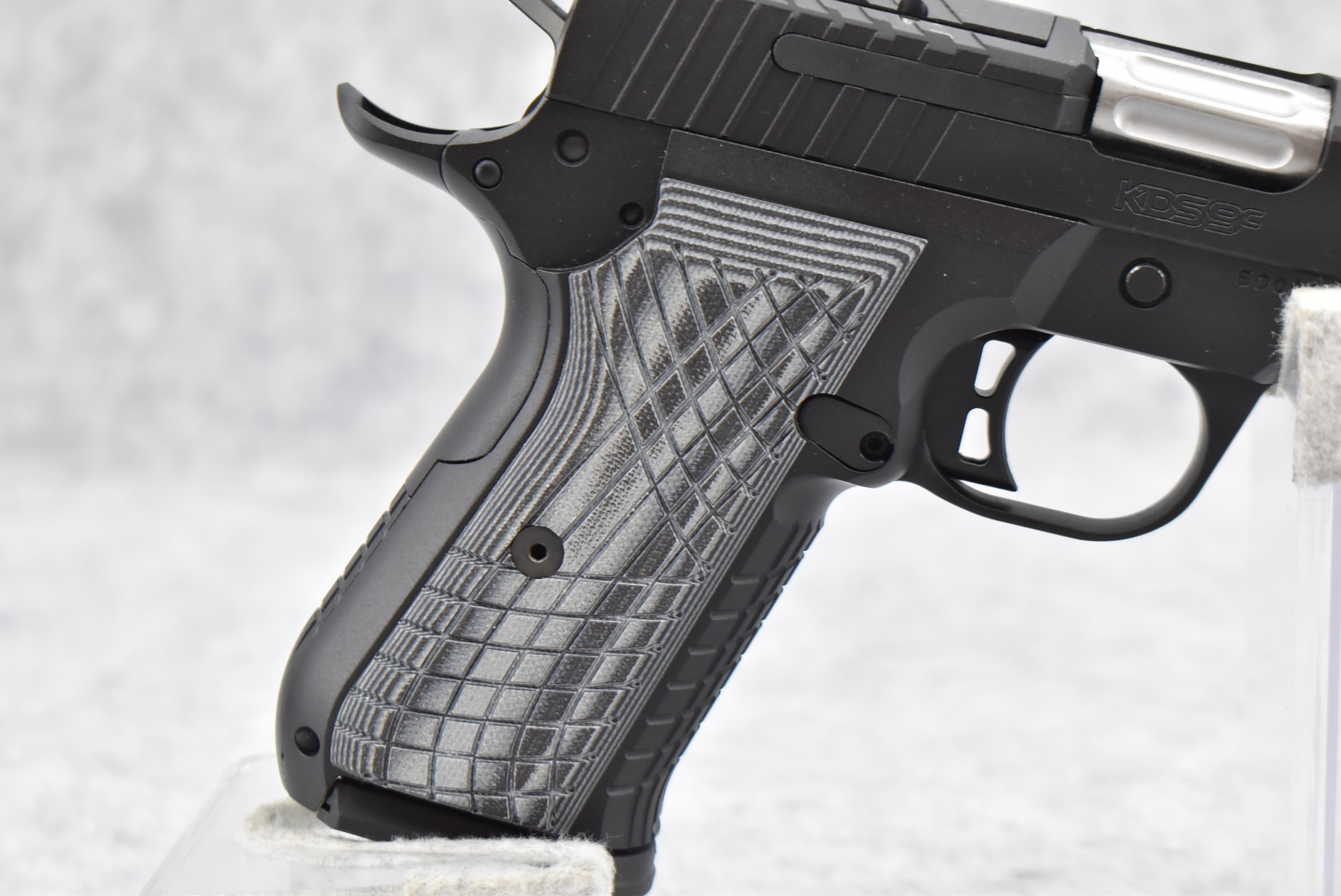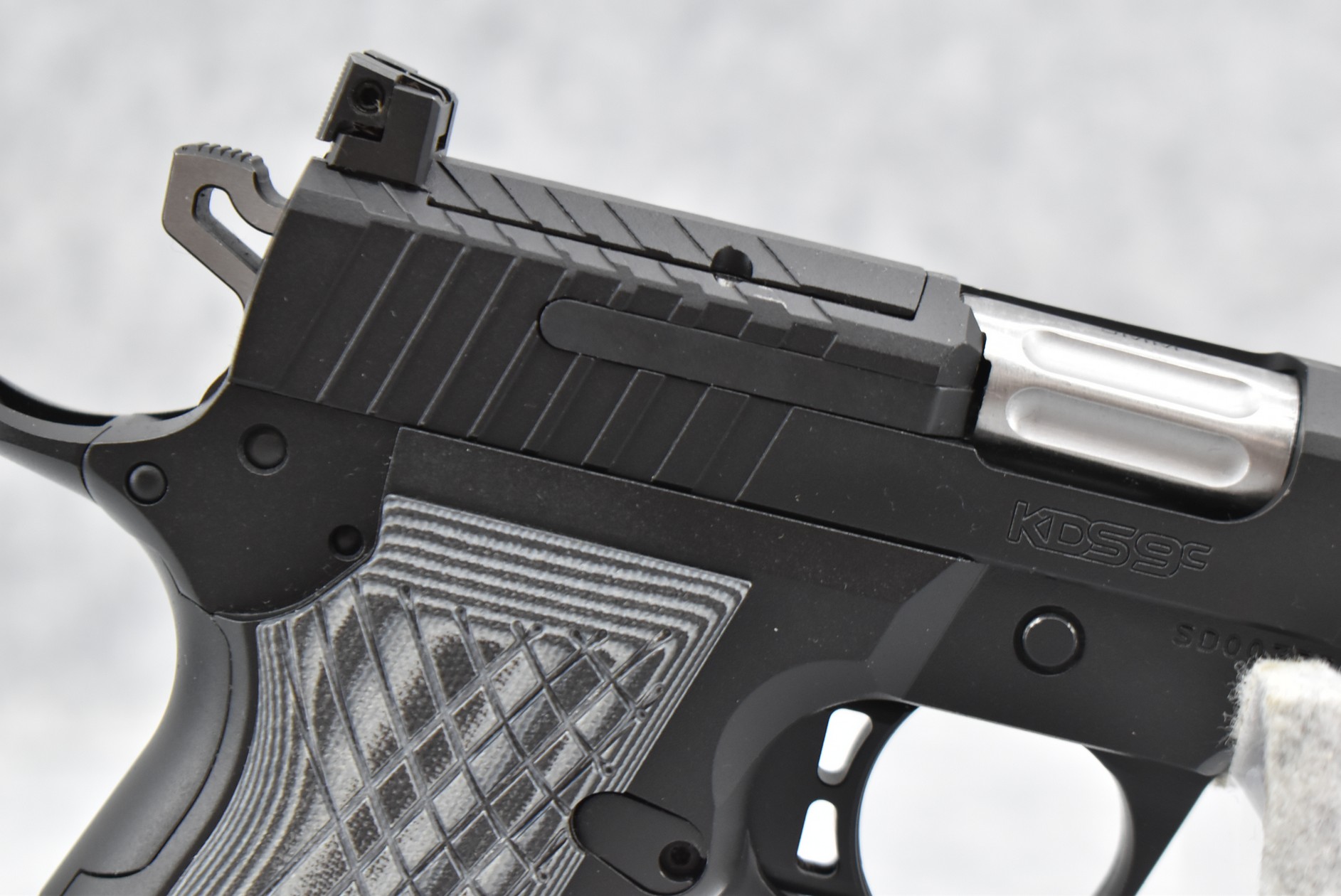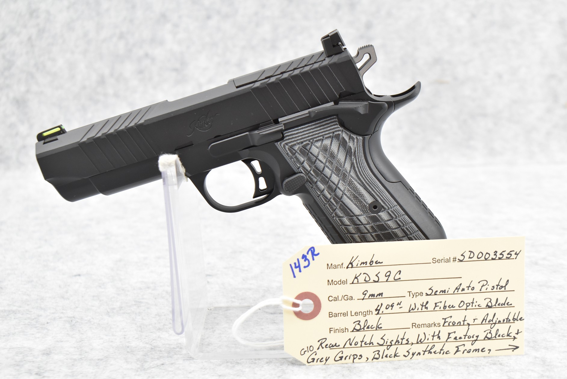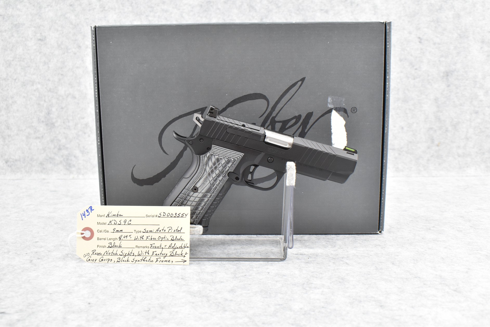 143R. Kimber – Mod. KDS9C – 9mm Cal. Semi-Auto Pistol – w/4.09” Barrel w/Fiber Optic Blade Front & Adj. Rear Notch Sights – Matte Black Finish – w/Factory Black & Gray G10 Grips – As New w/Factory Box, Soft Case, Manuals & 2 Detachable Magazines