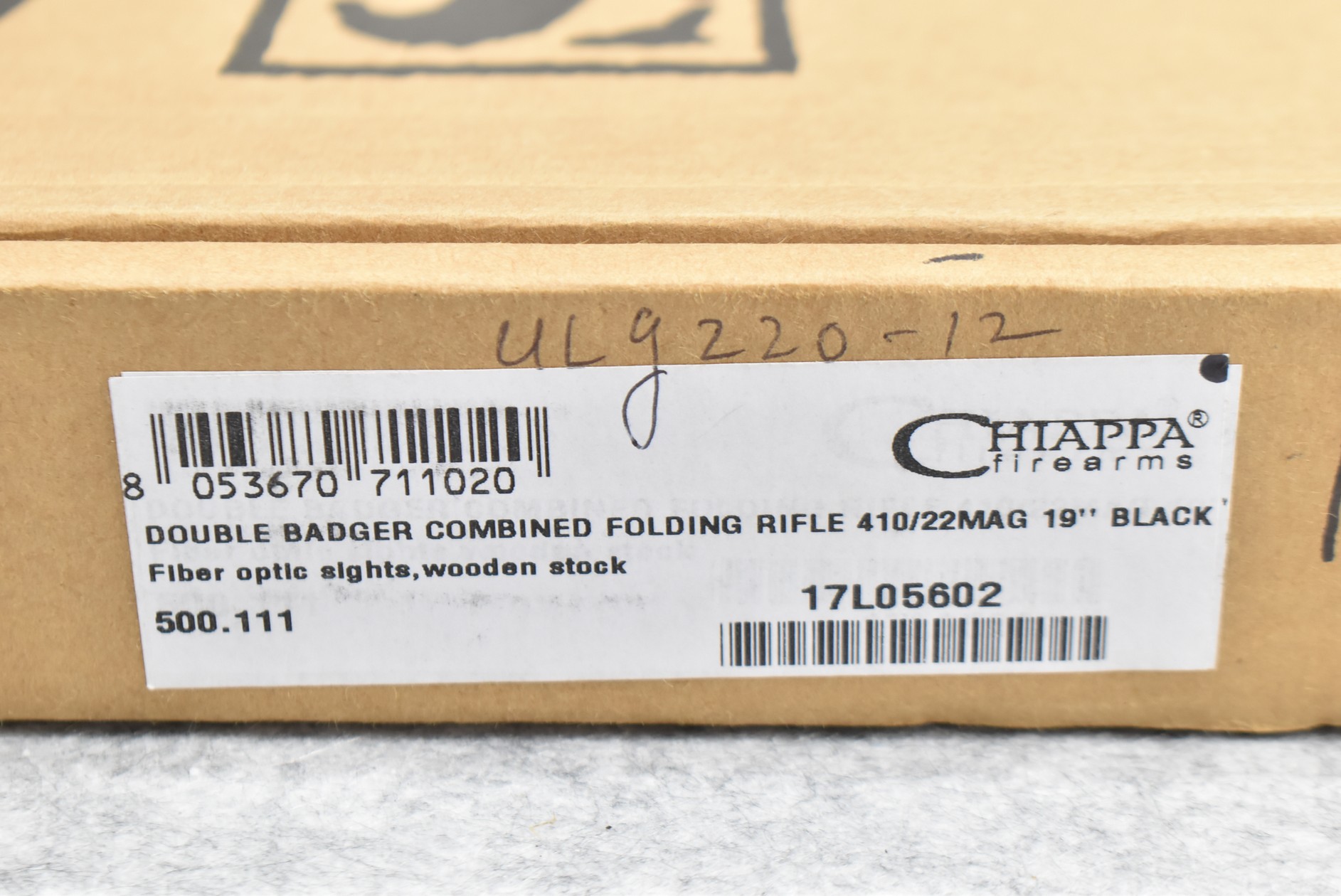 144R. Chiappa – Mod. Double Badger – 22 Mag/410ga. Over-Under Rifle/Shotgun Combo – w/19 1/8” Barrel w/Fiber Optic Blade Front & Adj. Rear Peep Sights – Blued Finish w/Case Hardened Lever – w/Checkered Round Knob Pistol Grip Wood Stocks w/Checkered Butt Plate – New w/Factory Box & Manuals
