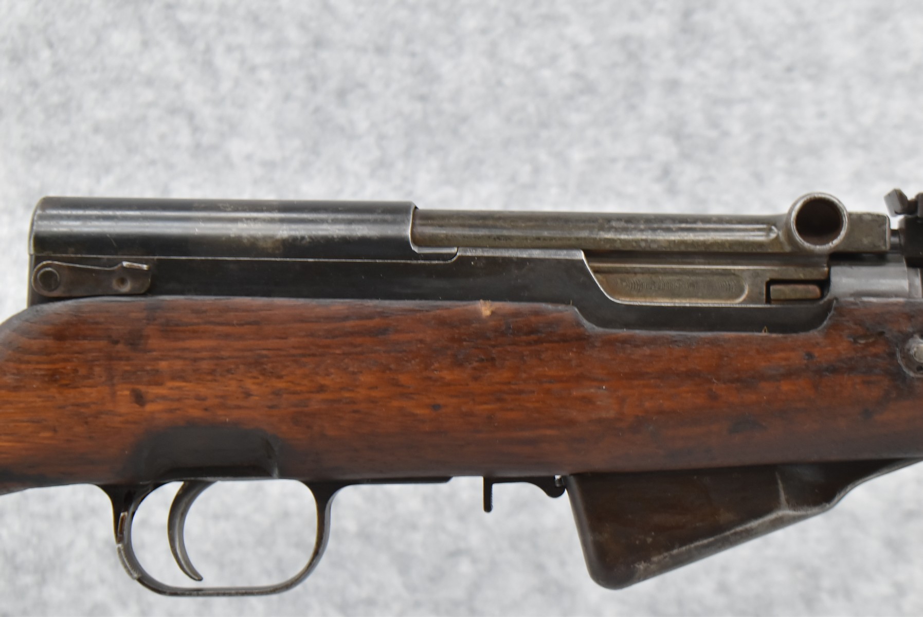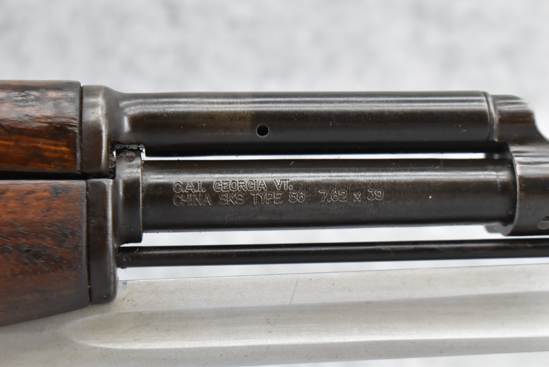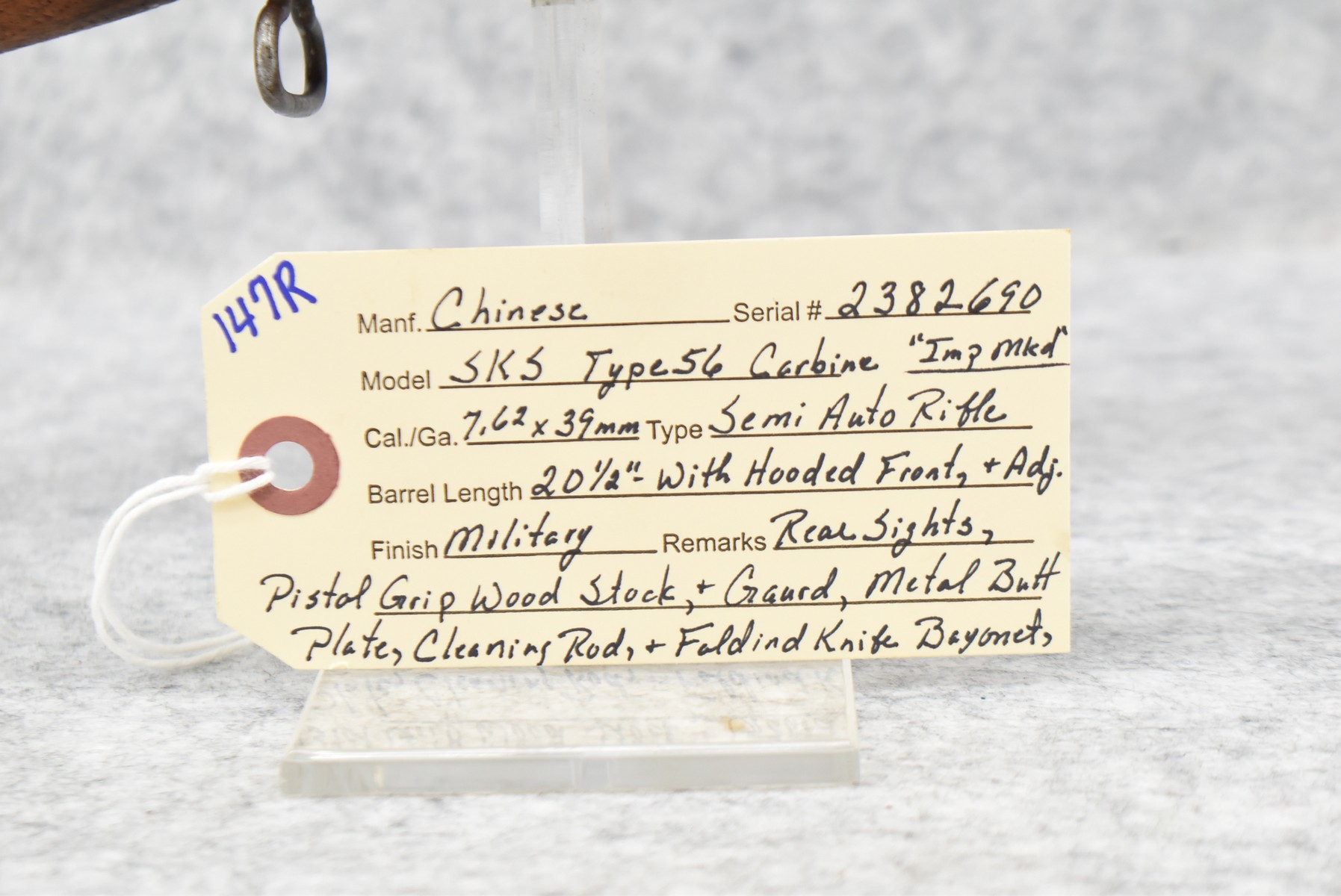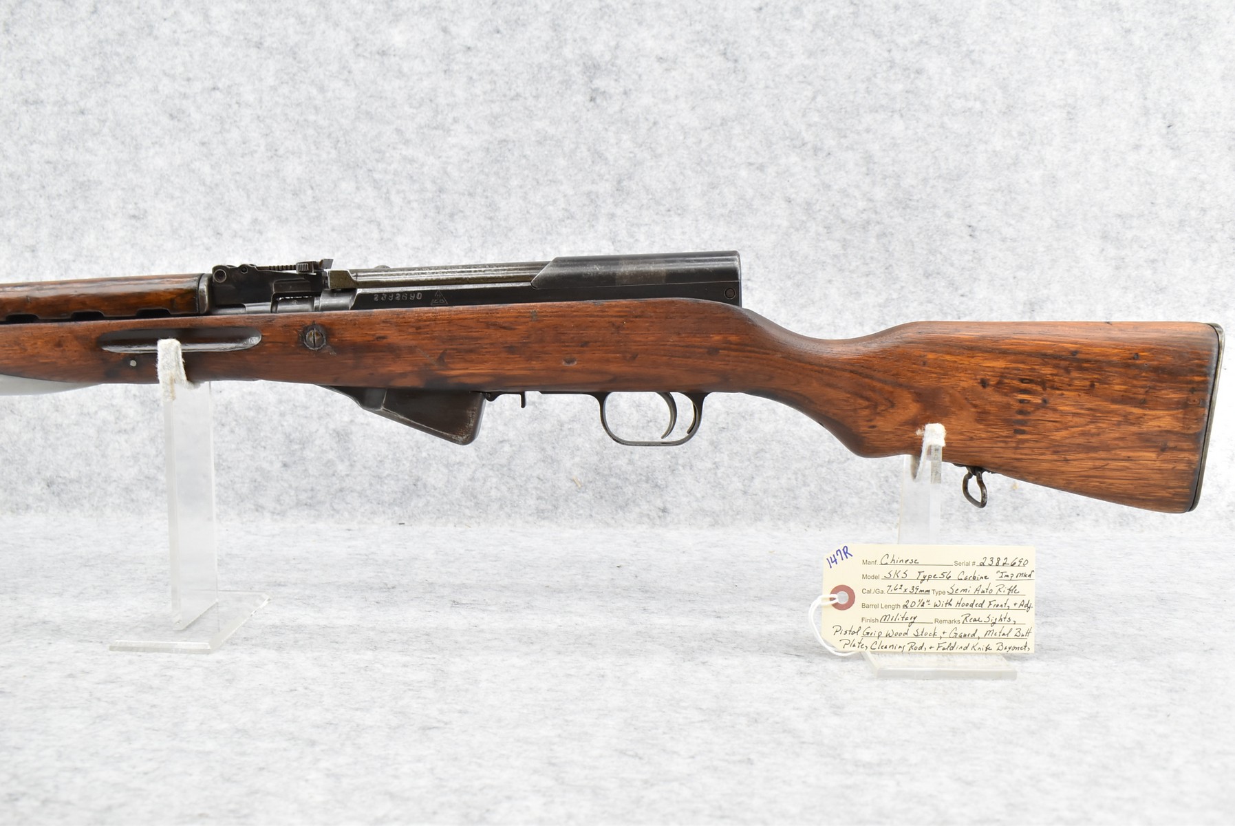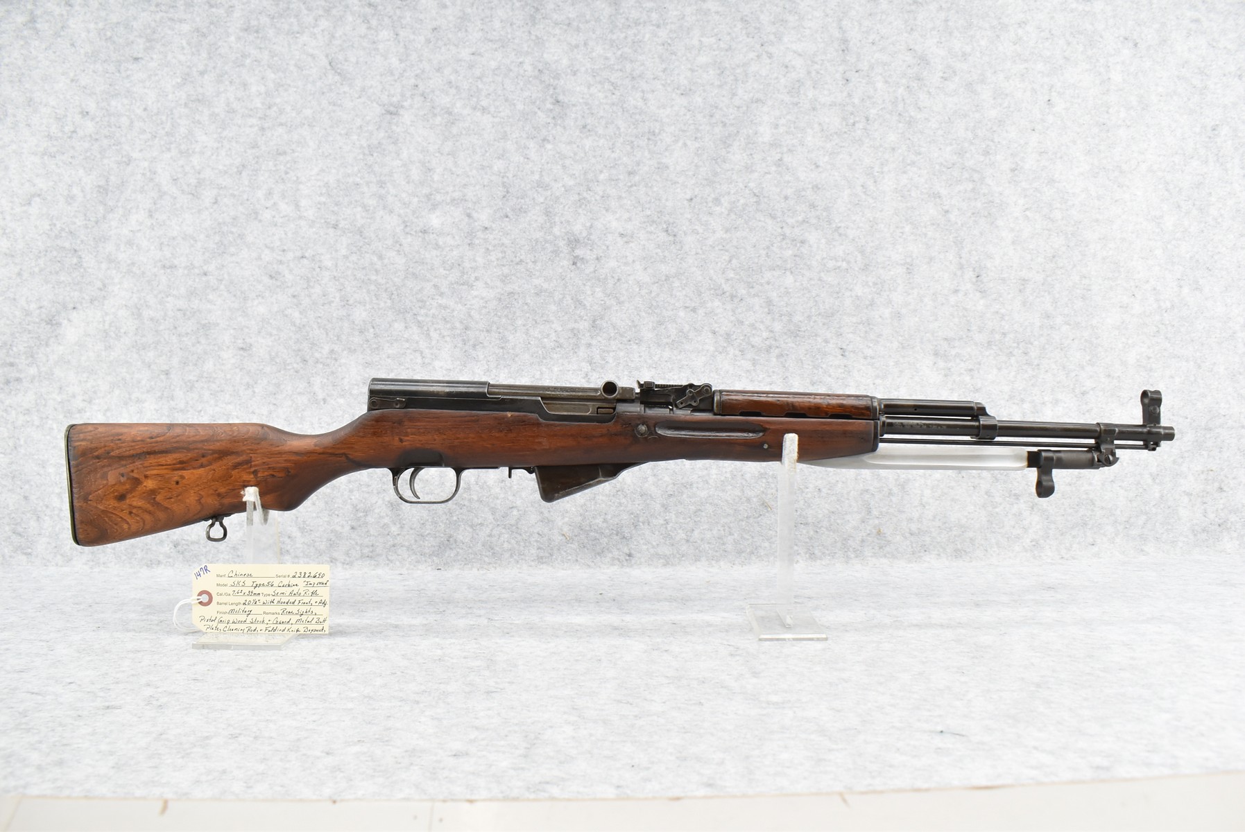 147R. Chinese – Mod. SKS Type 56 Carbine – 7.62x39mm Cal. Semi-Auto Rifle – w/20 ½” Barrel w/Hooded Front & Adj. Rear Sights – Military Finish – w/Pistol Grip Wood Stocks w/Metal Butt Plate – w/Cleaning Rod – w/Folding Knife Bayonet – Import Marked