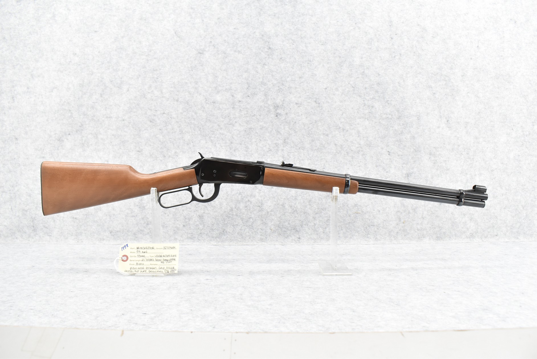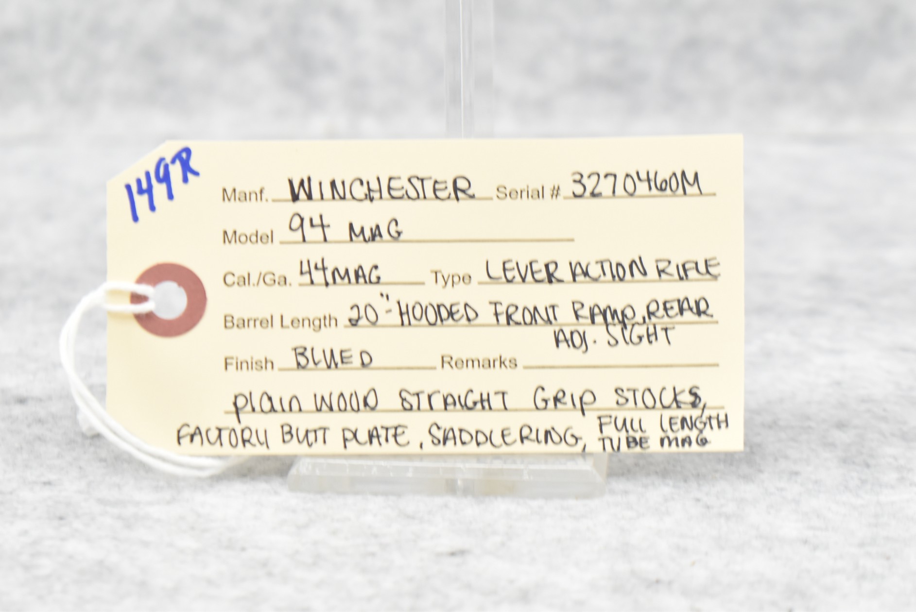 149R. Winchester – Mod. 94 – 44 Mag. Cal. Lever Action Rifle – w/20” Barrel w/Hooded Front Ramp & Rear Adj. Sights w/Full Length Tube Mag – Blued Finish – w/Plain Wood Straight Grip Stocks w/Factory Butt Plate – w/Saddle Ring