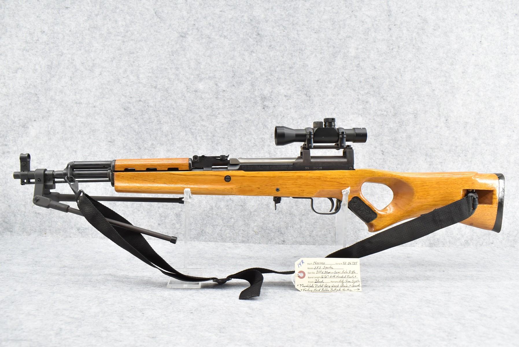 14R. Norinco – Mod. SKS Sporter – 7.62×39 Cal. Semi-Auto Rifle – w/16 ½” Barrel w/Hooded Front & Adj. Rear Sights – Blued Finish – w/Thumb-Hole Pistol Grip Wood Stocks w/Factory Hard Rubber Butt Pad – No Mag – w/Nylon Sling – w/Bipod – w/Red Dot Scope & Mounts (CANNOT GO TO MARYLAND!)