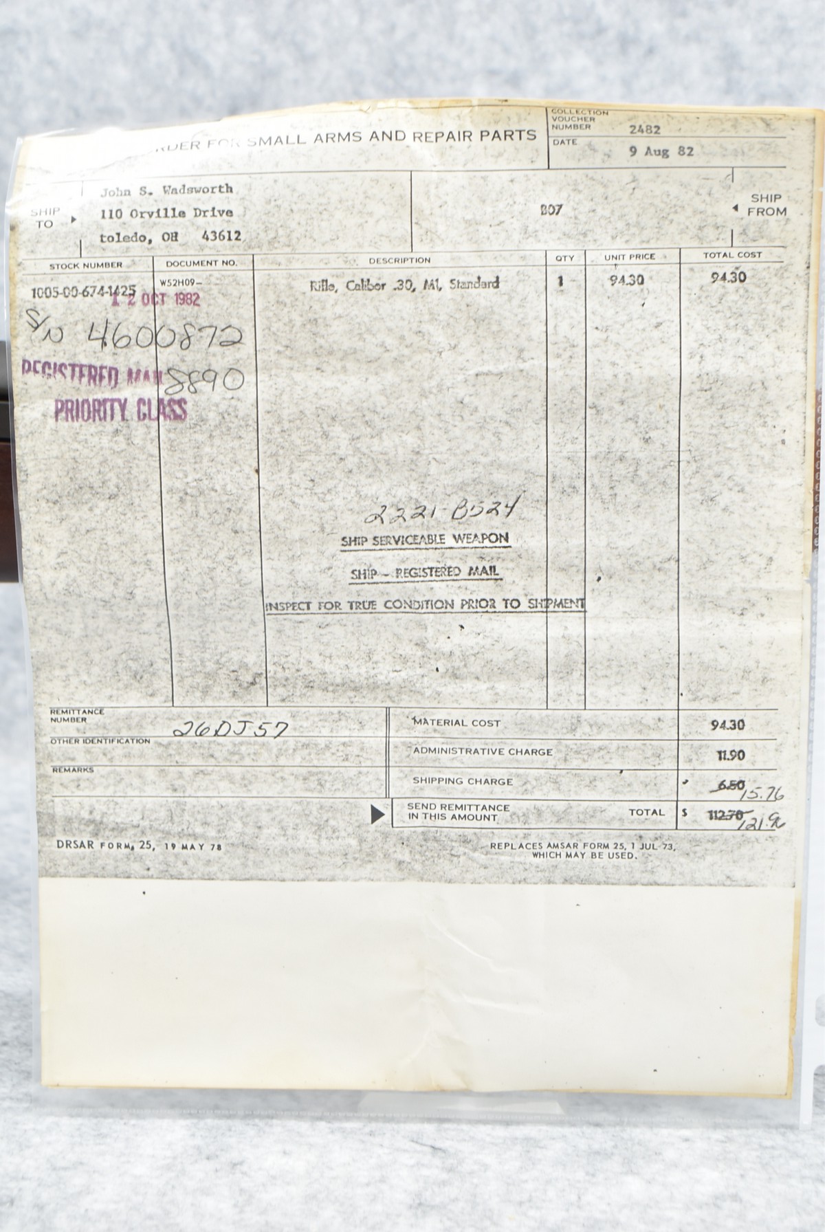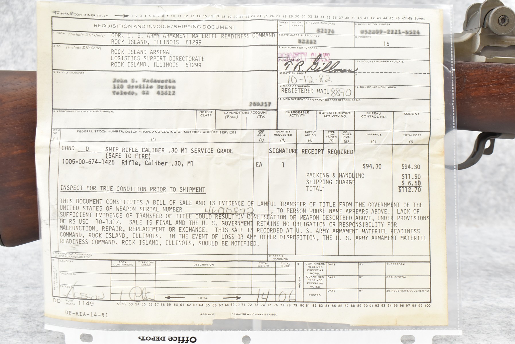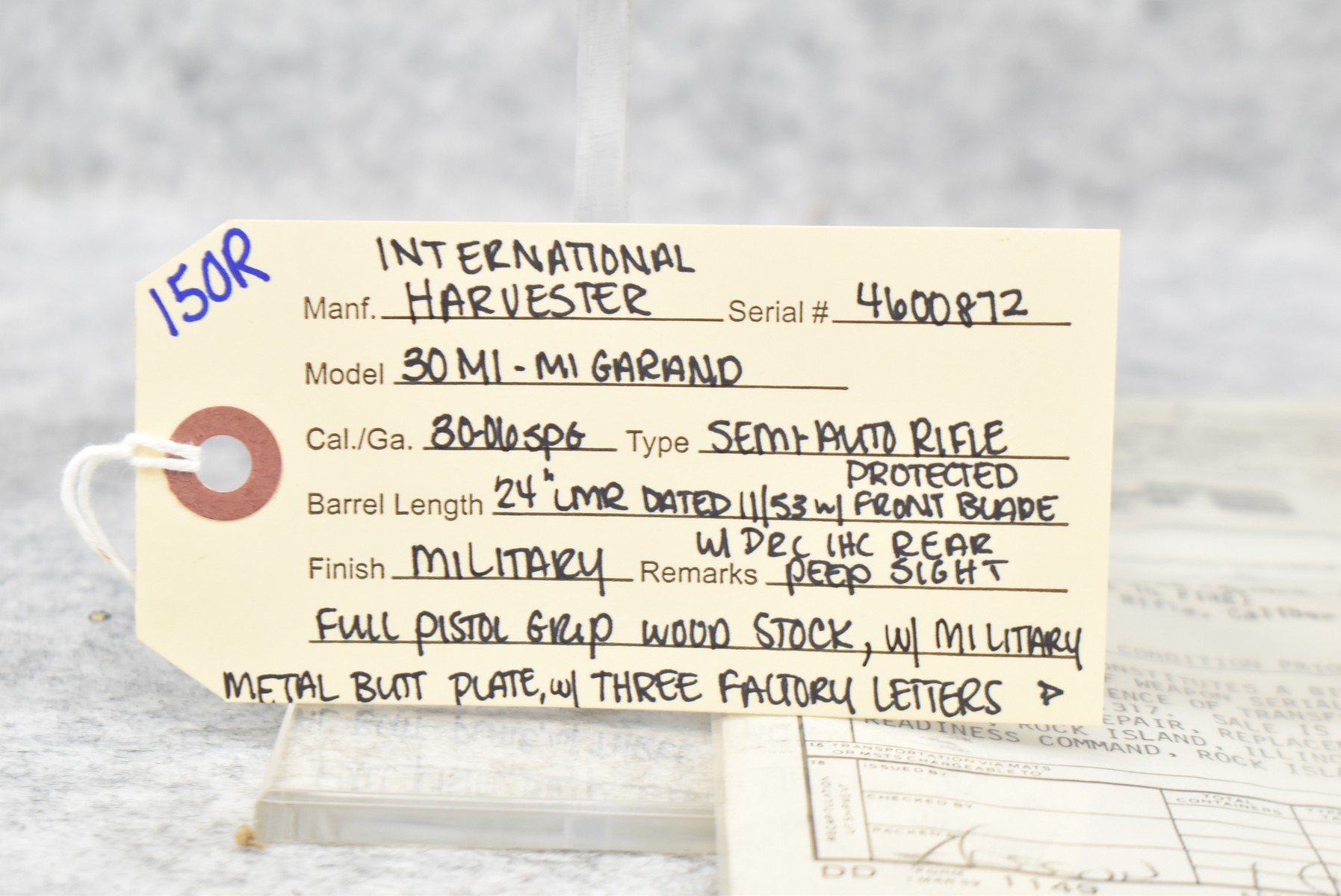 150R. International Harvester – Mod. M1 Garand – 30-06 Cal. Semi-Auto Rifle – w/24” LMR 11-53 Dated Barrel w/Protected Front Blade & DRC ICH Rear Peep Sights – Military Finish – w/Full Pistol Grip Wood Stock w/Military Metal Butt Plate – w/3 Factory Letters From Rock Island Arsenal Stating the Transfer & Sale of This Firearm Dating From Aug. to Oct. 1982 – Letters Found in Butt Plate Trapdoor