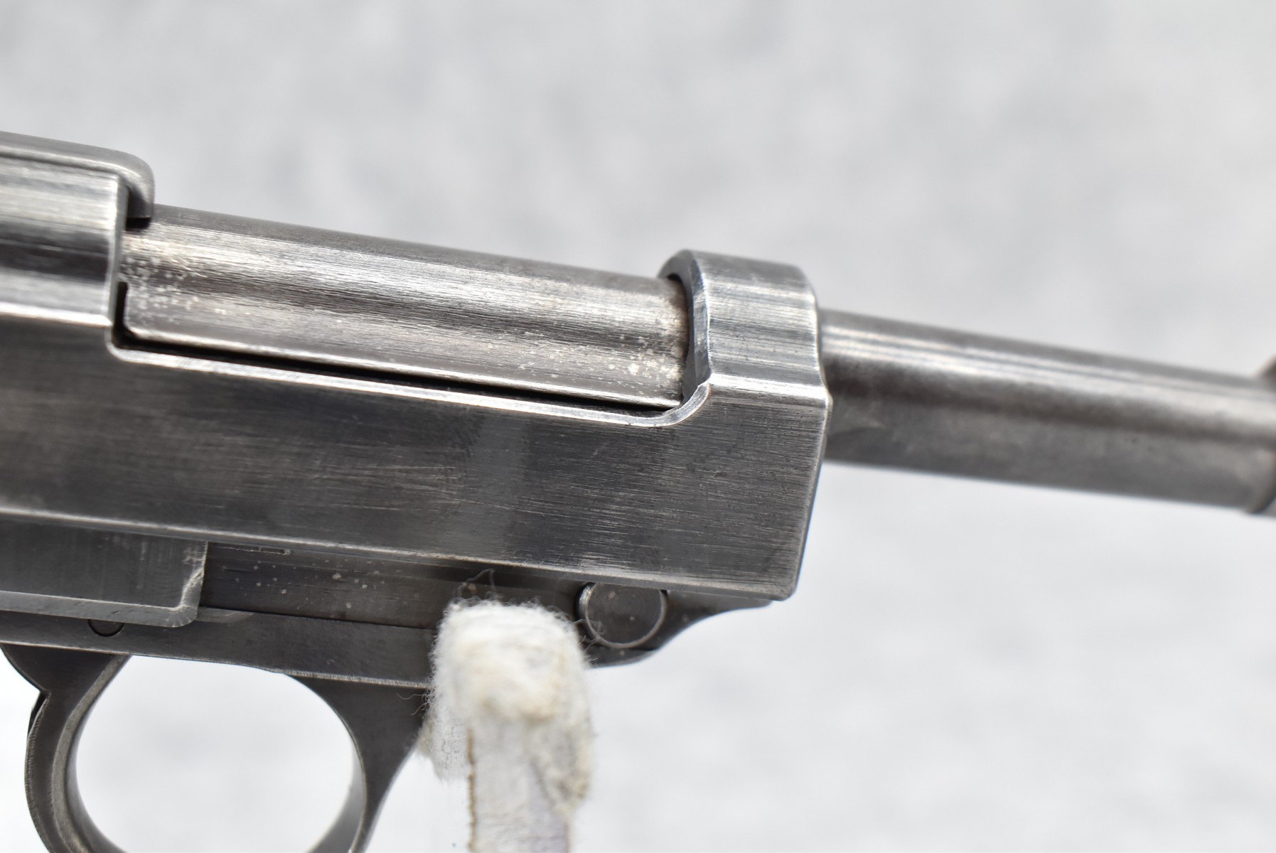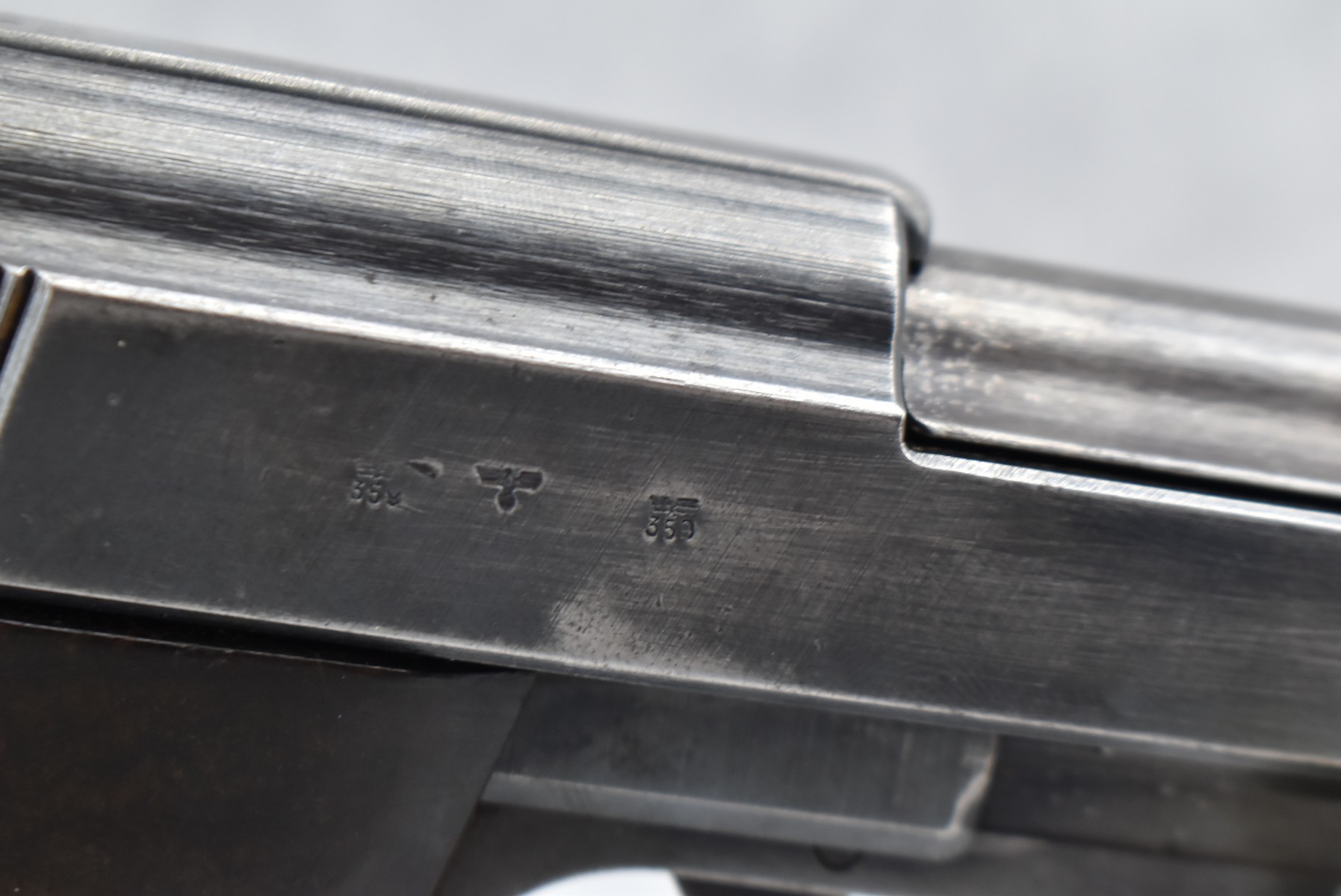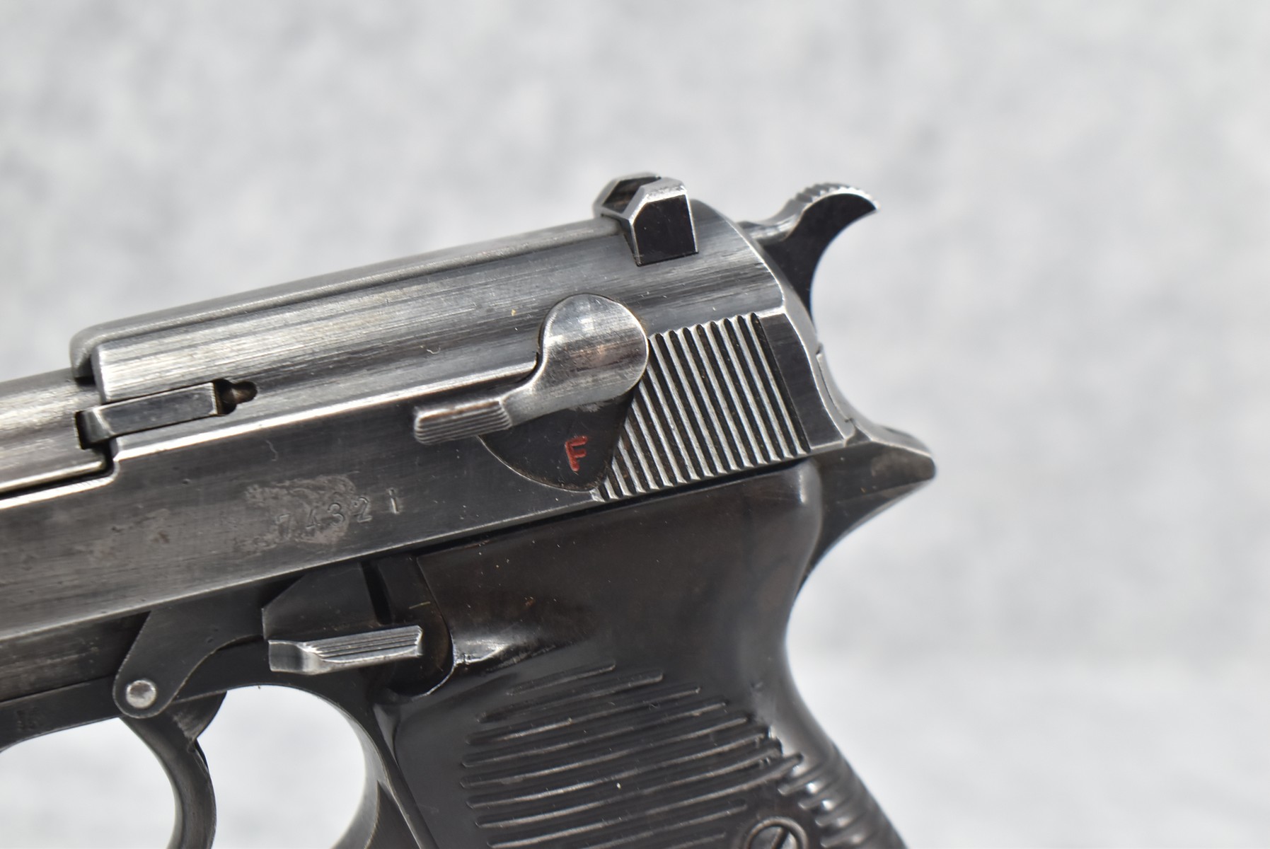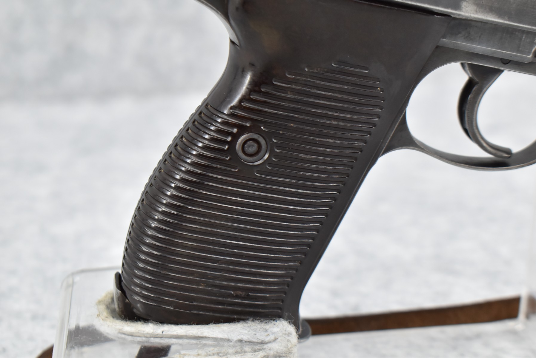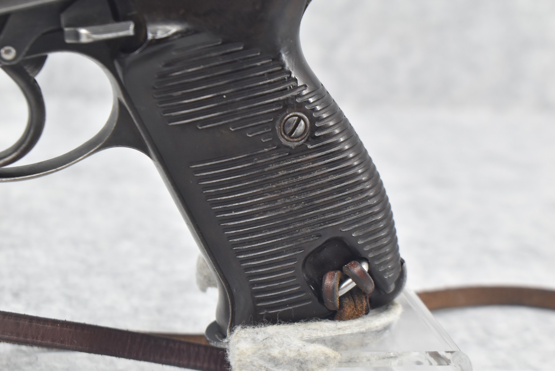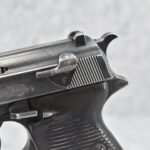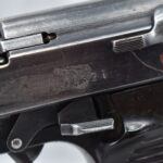 150R. Walther – Mod. P-38 – 9mm Cal. Semi-Auto Pistol – w/5” Barrel w/Front Blade & Rear Iron Sights – Blued Finish – w/Factory Ribbed Brown Bakelite Grip – w/Factory Magazine – w/Period Leather Lanyard – German Proof Marked – Mfg. Code: AC – Dated 1942
