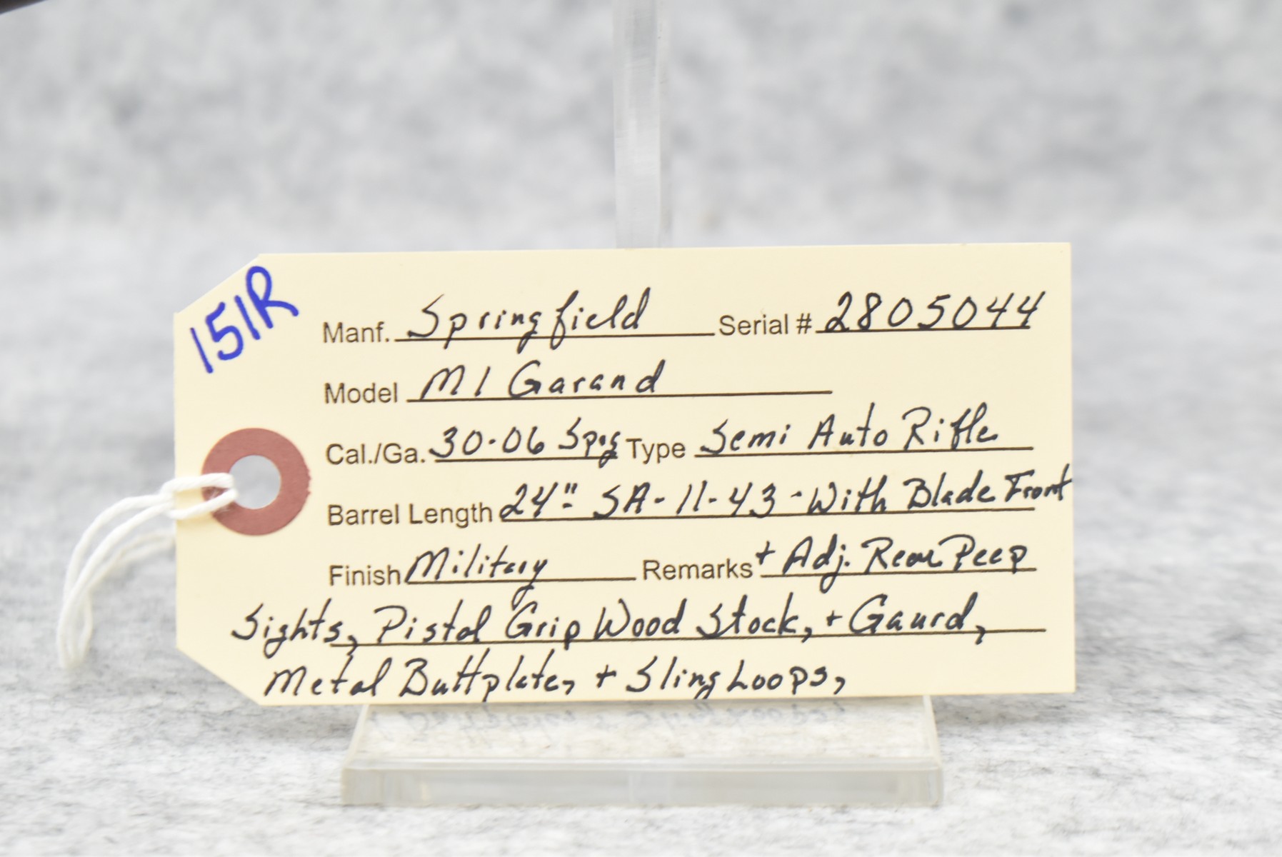 151R. Springfield – Mod. M1 Garand – 30-06 Cal. Semi-Auto Rifle – w/24” SA 11-43 Dated Barrel w/Blade front & Adj. Rear Peep Sights – Military Finish – w/Pistol Grip Wood Stocks w/Metal Butt Plate & Sling Loop