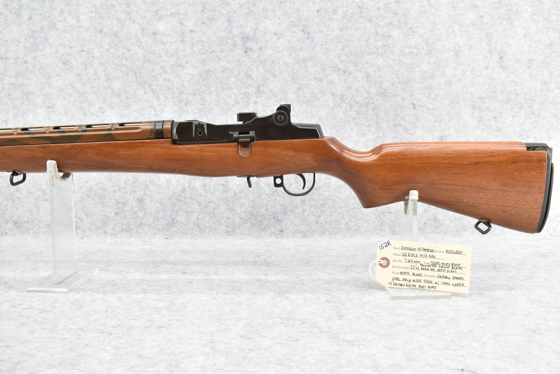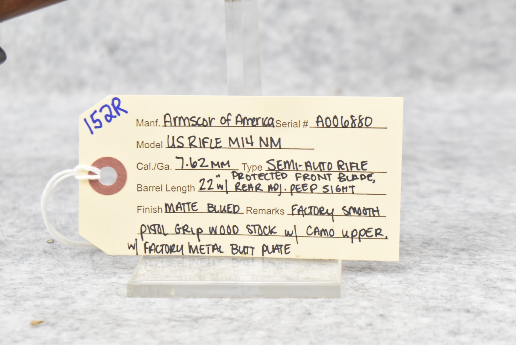 152R. Armscor of America – Mod. US Rifle M14 NM – 7.62mm Cal. Semi-Auto Rifle – w/22” Barrel w/Protected Front Blade & Rear Adj. Peep Sight – Matte Blued Finish – w/Factory Smooth Pistol Grip Wood Stock w/Factory Metal Butt Plate & Camo Hand Guard (CANNOT GO MARYLAND!)