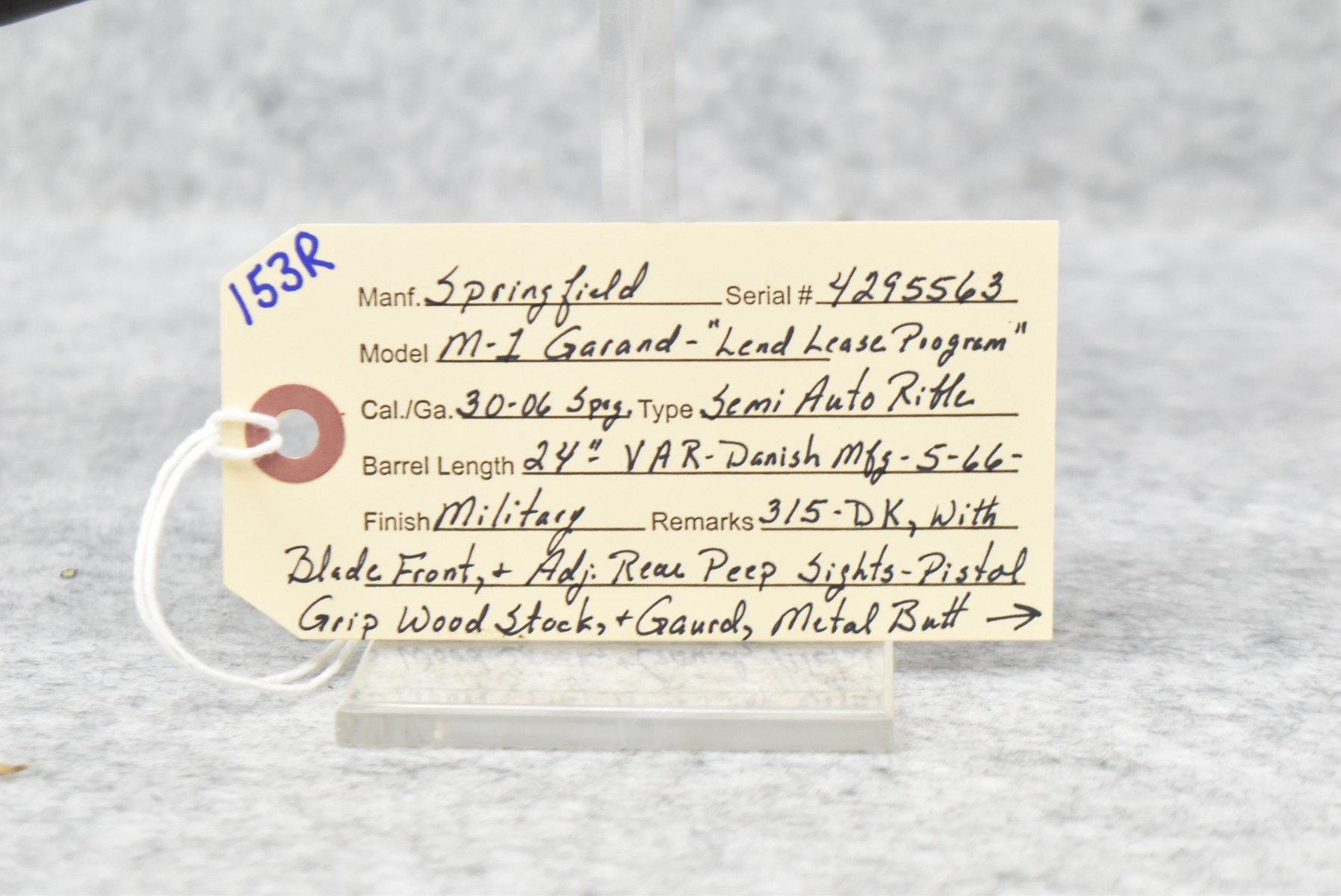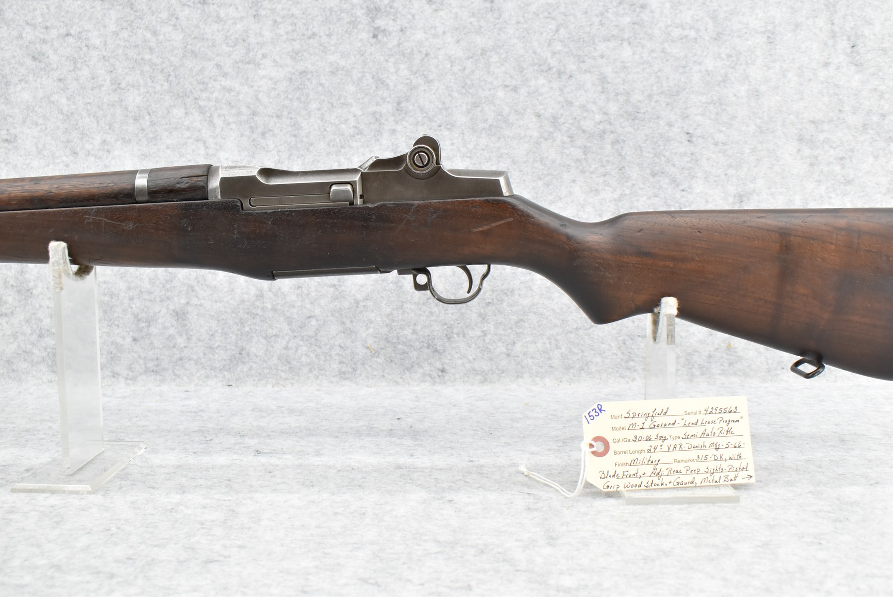 153R. Springfield – Mod. M1 Garand – “Lend Lease Program” – 30-06 Cal. Semi-Auto Rifle – w/24” VAR (Danish Mfg.) 5-66-315-DK Marked Barrel w/Blade Front & Adj. Rear Peep Sights – Military Finish – w/Pistol Grip Wood Stocks w/Metal Butt Plate & Sling Loops