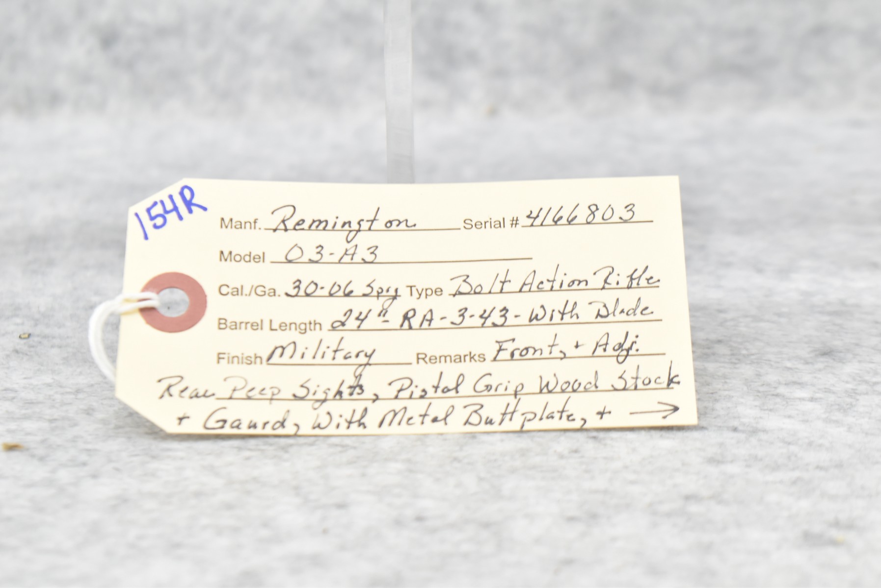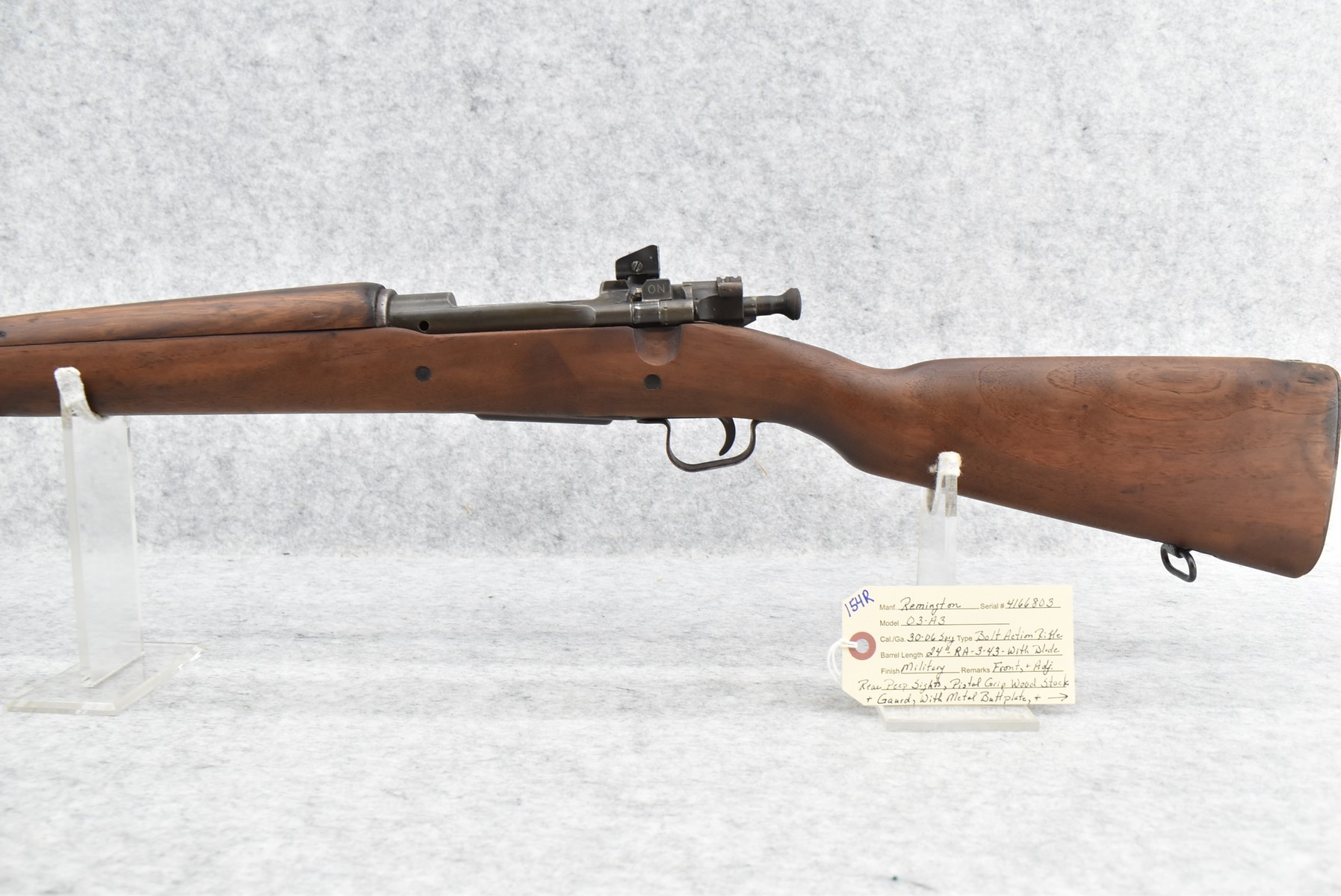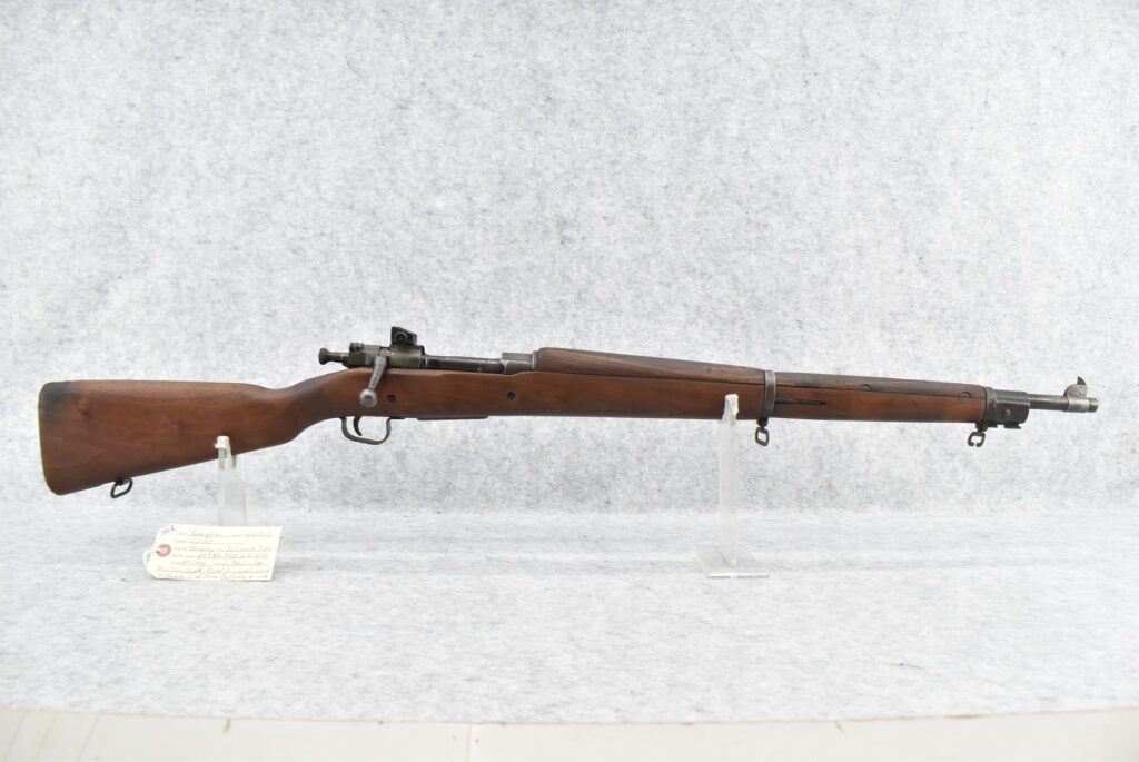 154R. Remington – Mod. 03-A3 – 30-06 Cal. Bolt Action Rifle – w/24” RA 3-43 Dated Barrel w/Blade Front & Adj. Rear Peep Sights – Military Finish – w/Pistol Grip Wood Stocks w/Metal Butt Plate & Sling Loops