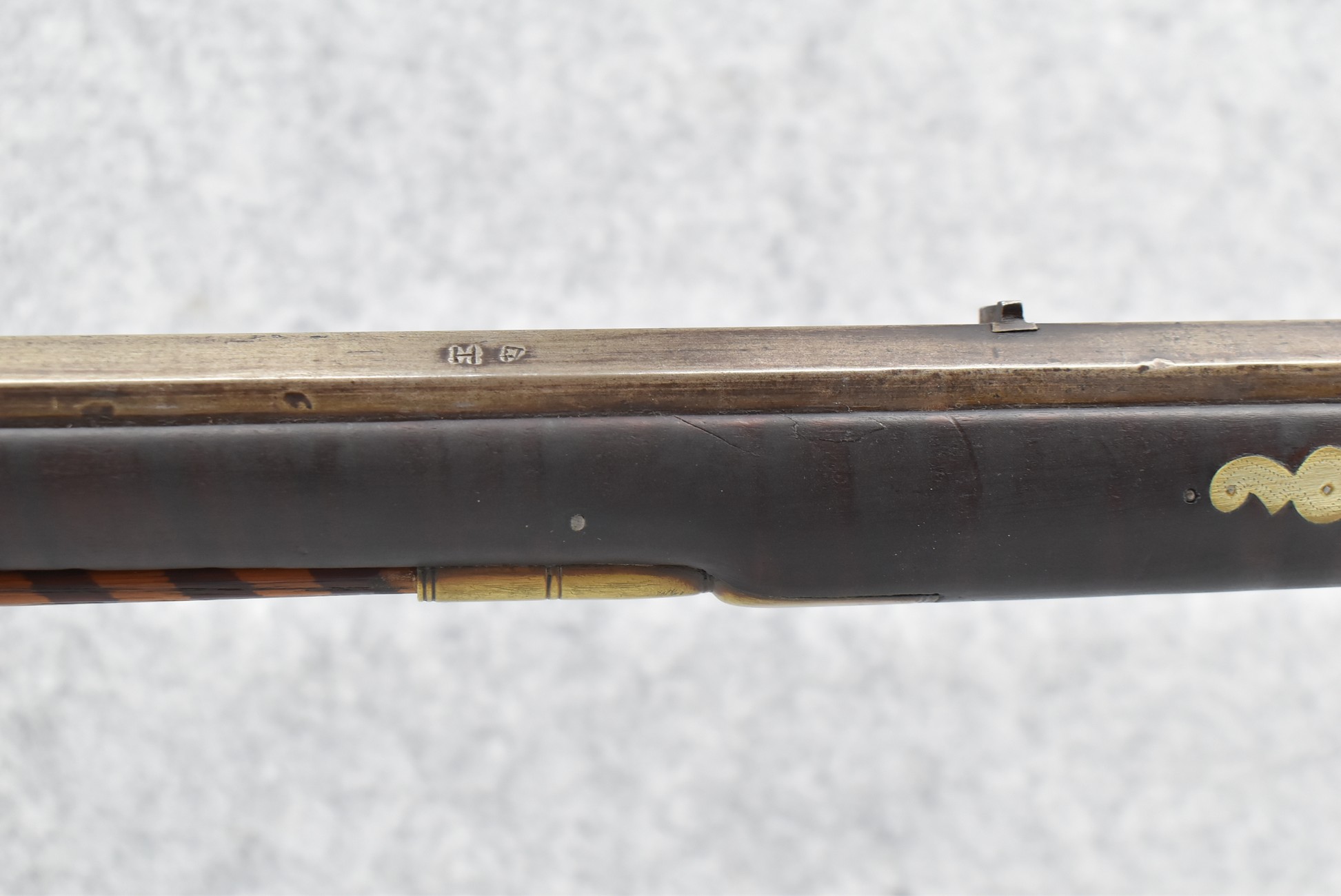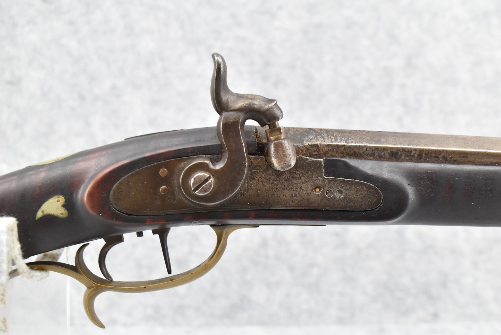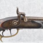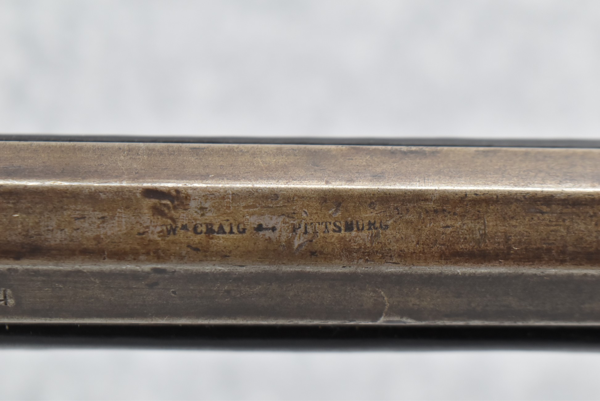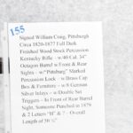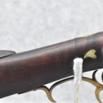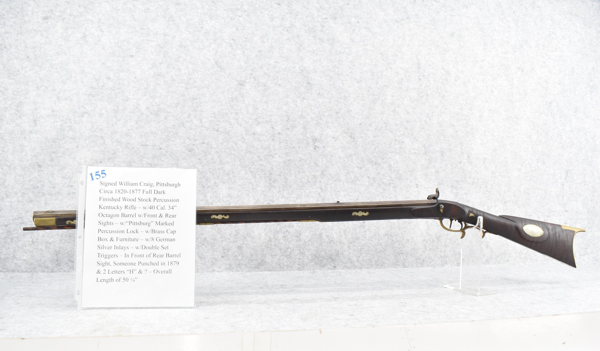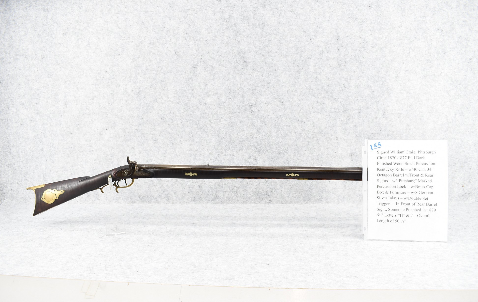 155. Signed William Craig, Pittsburgh Circa 1820-1877 Full Dark Finished Wood Stock Percussion Kentucky Rifle – w/40 Cal. 34” Octagon Barrel w/Front & Rear Sights – w/“Pittsburg” Marked Percussion Lock – w/Brass Cap Box & Furniture – w/8 German Silver Inlays – w/Double Set Triggers – In Front of Rear Barrel Sight, Someone Punched in 1879 & 2 Letters “H” & ? – Overall Length of 50 ¼”