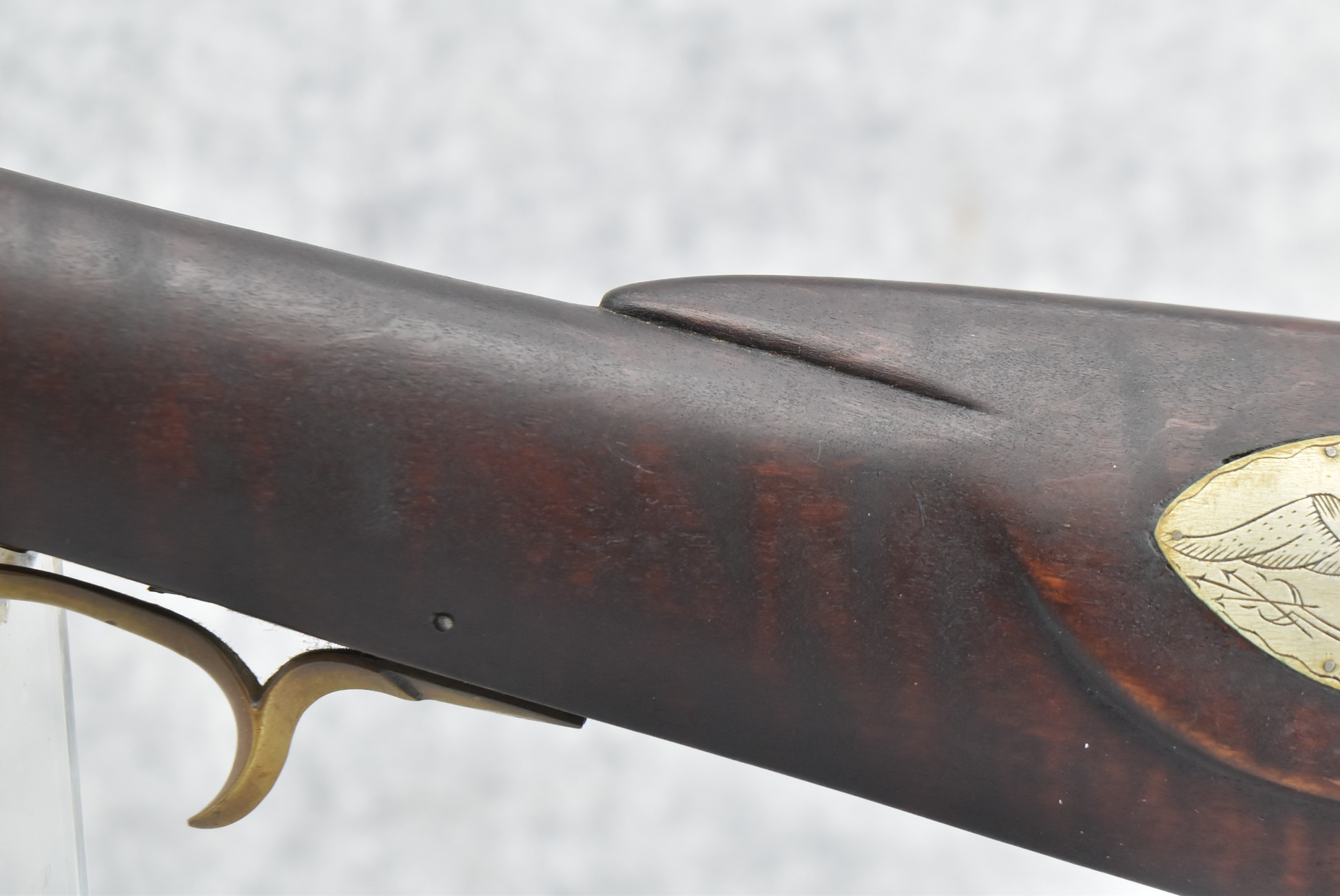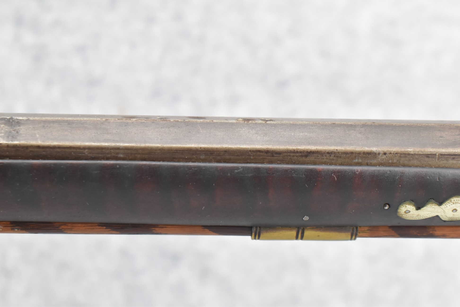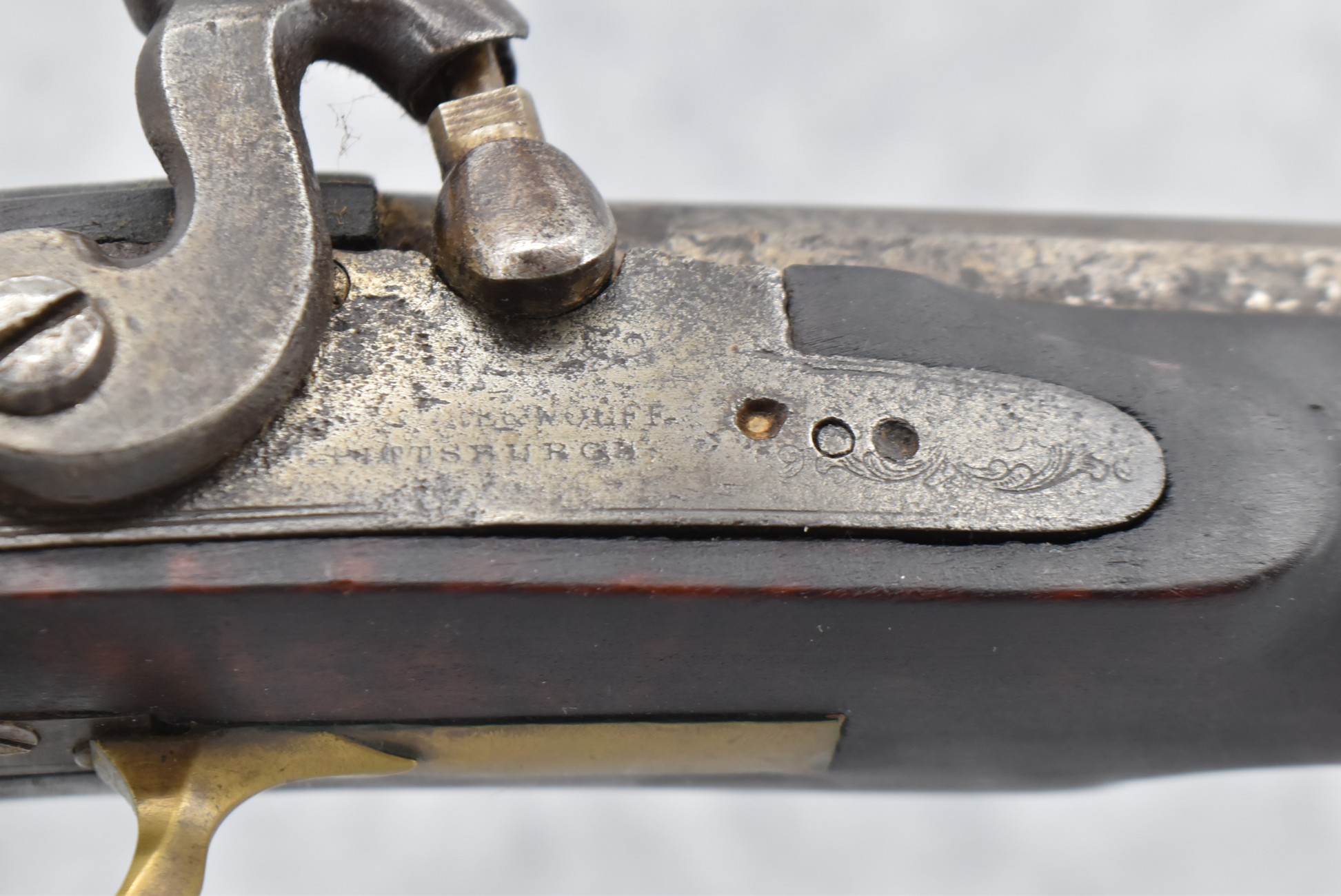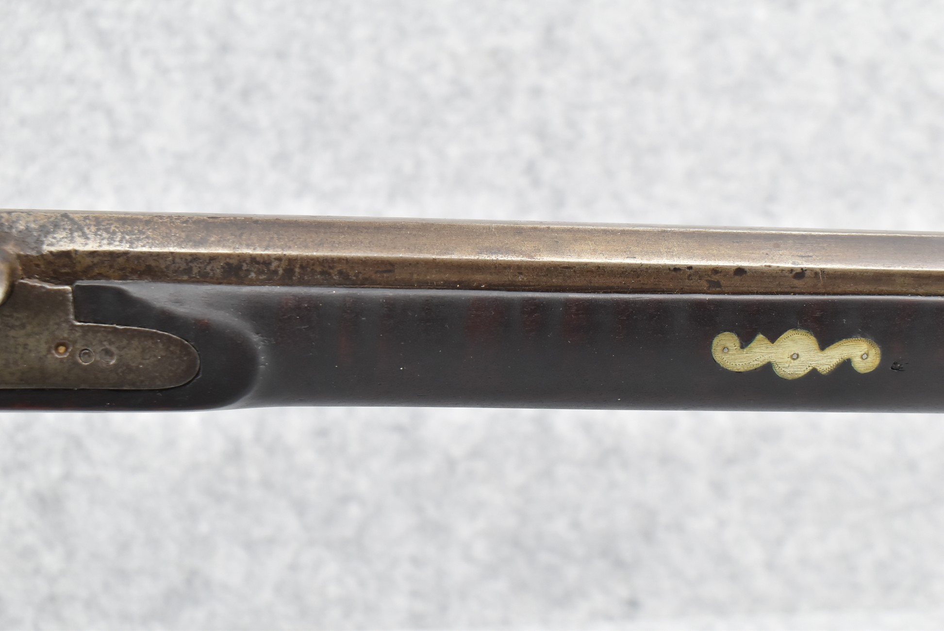 155. Signed William Craig, Pittsburgh Circa 1820-1877 Full Dark Finished Wood Stock Percussion Kentucky Rifle – w/40 Cal. 34” Octagon Barrel w/Front & Rear Sights – w/“Pittsburg” Marked Percussion Lock – w/Brass Cap Box & Furniture – w/8 German Silver Inlays – w/Double Set Triggers – In Front of Rear Barrel Sight, Someone Punched in 1879 & 2 Letters “H” & ? – Overall Length of 50 ¼”