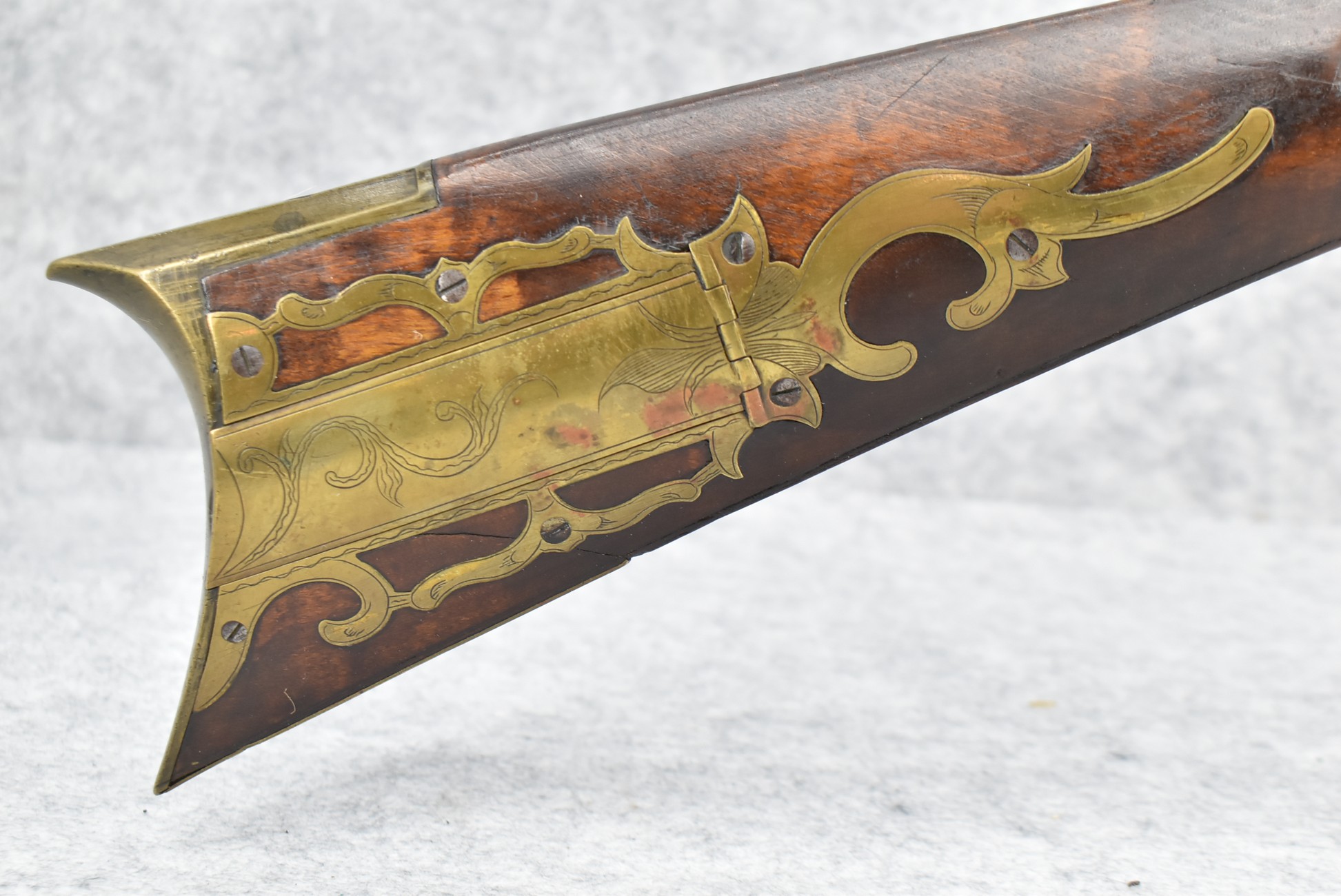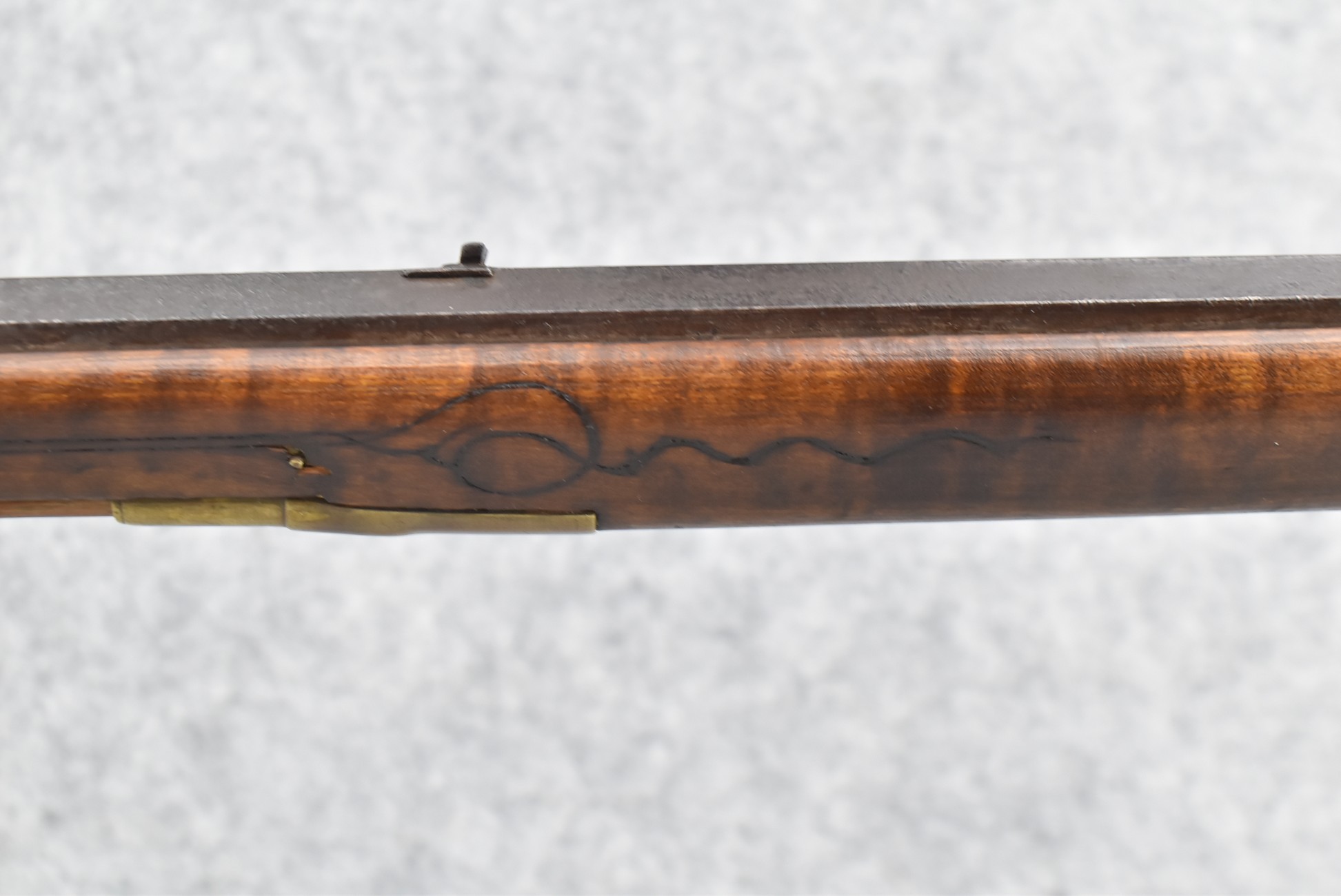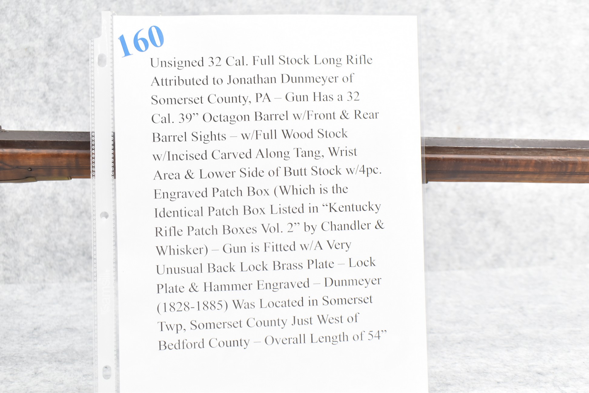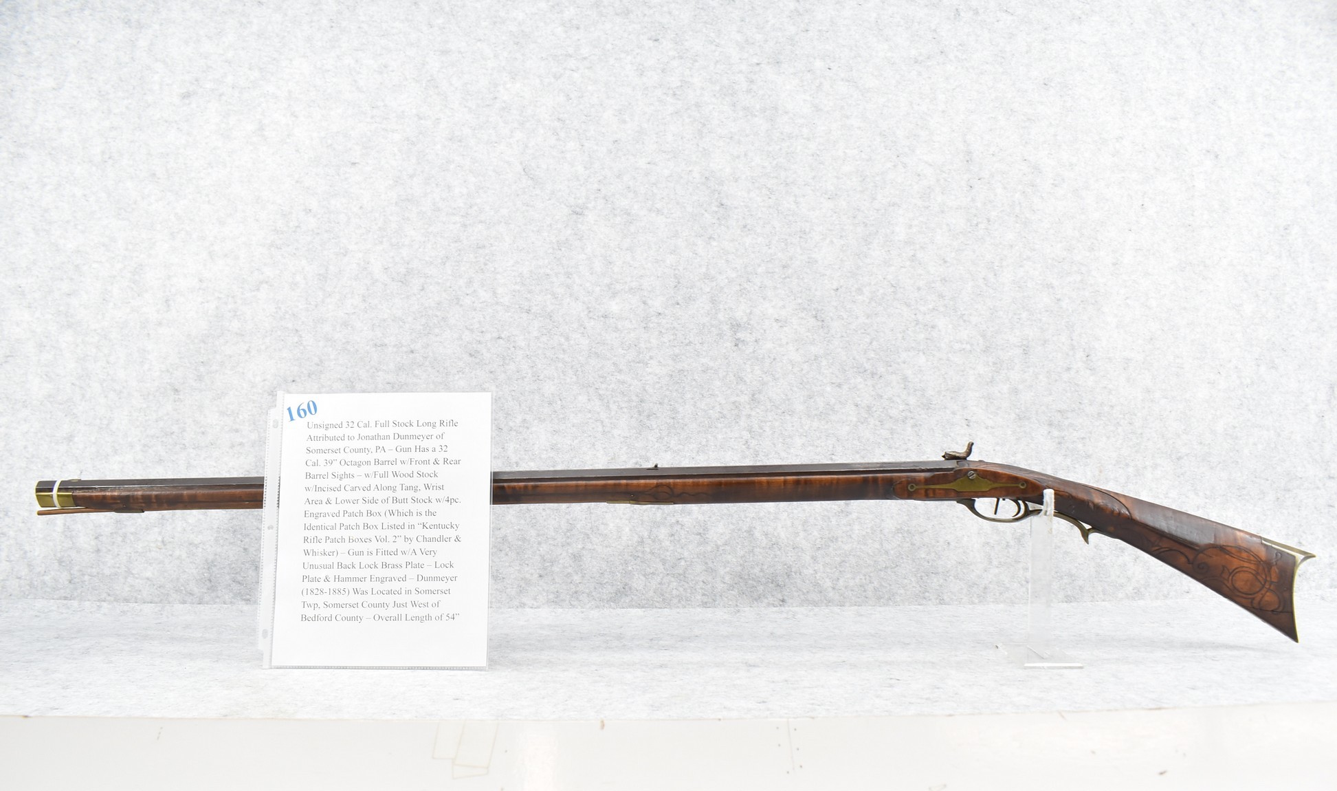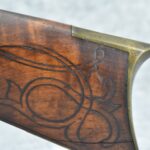 160.        Unsigned 32 Cal. Full Stock Long Rifle Attributed to Jonathan Dunmeyer of Somerset County, PA – Gun Has a 32 Cal. 39” Octagon Barrel w/Front & Rear Barrel Sights – w/Full Wood Stock w/Incised Carved Along Tang, Wrist Area & Lower Side of Butt Stock w/4pc. Engraved Patch Box (Which is the Identical Patch Box Listed in “Kentucky Rifle Patch Boxes Vol. 2” by Chandler & Whisker) – Gun is Fitted w/A Very Unusual Back Lock Brass Plate – Lock Plate & Hammer Engraved – Dunmeyer (1828-1885) Was Located in Somerset Twp, Somerset County Just West of Bedford County – Overall Length of 54”
