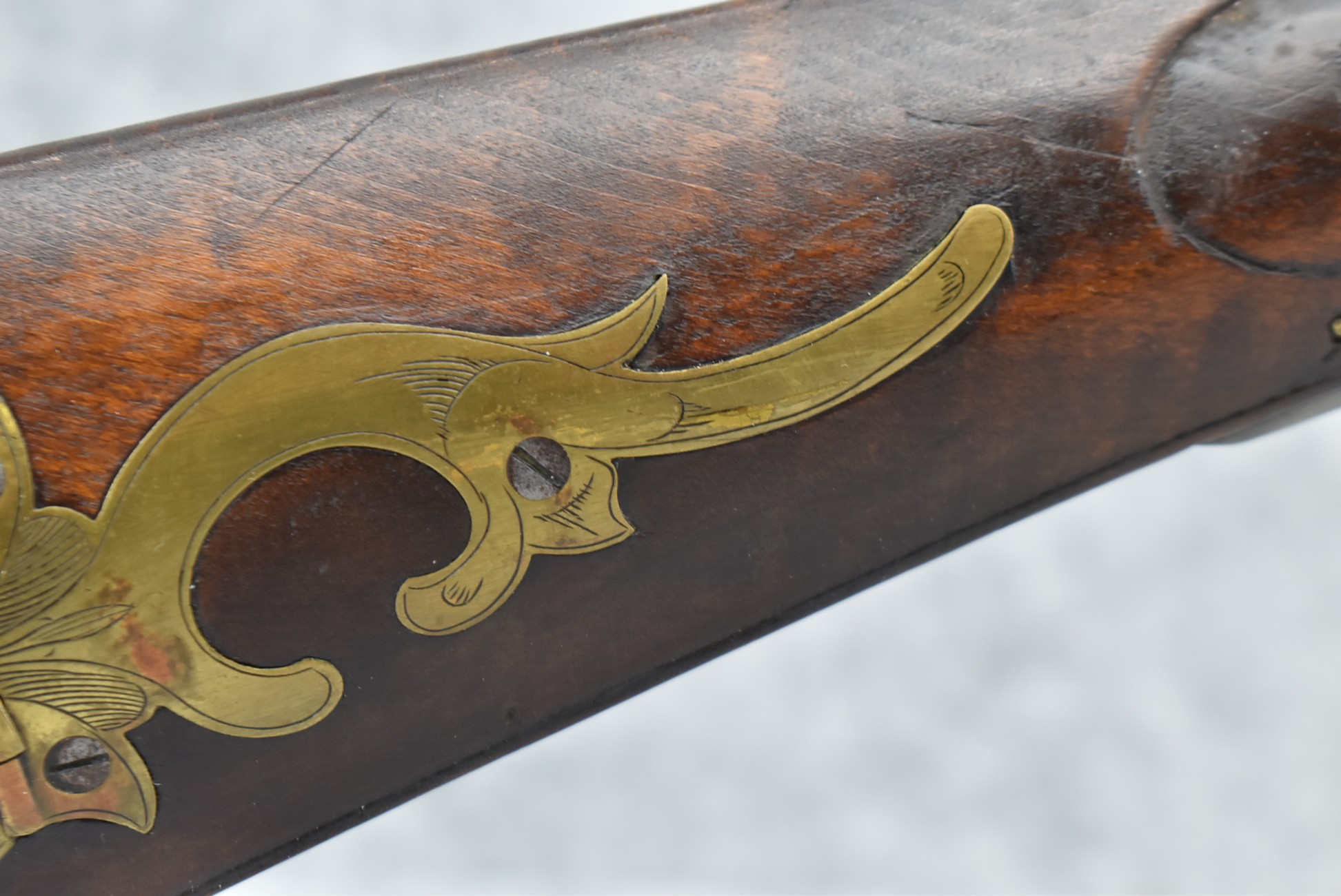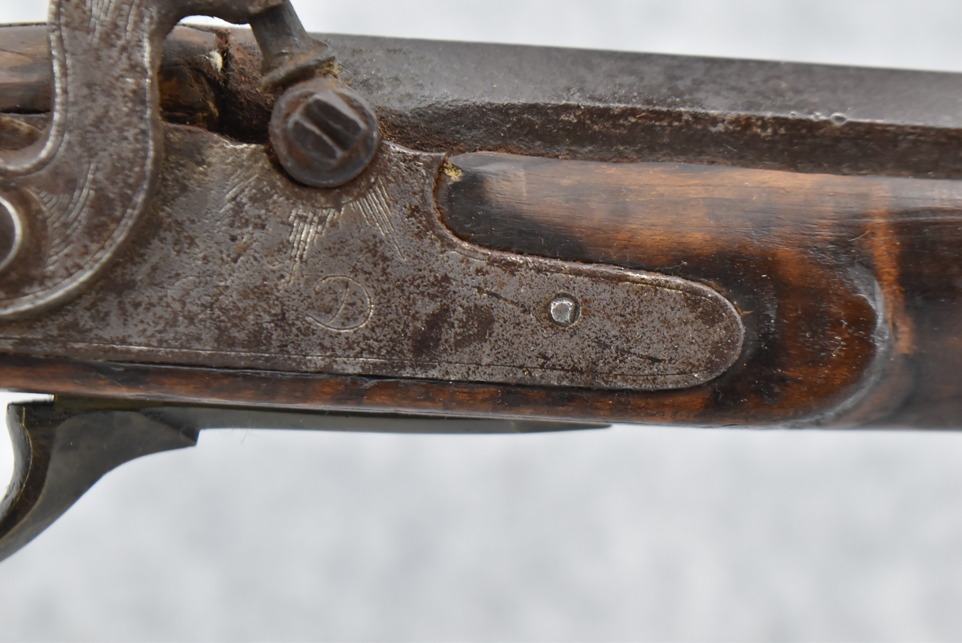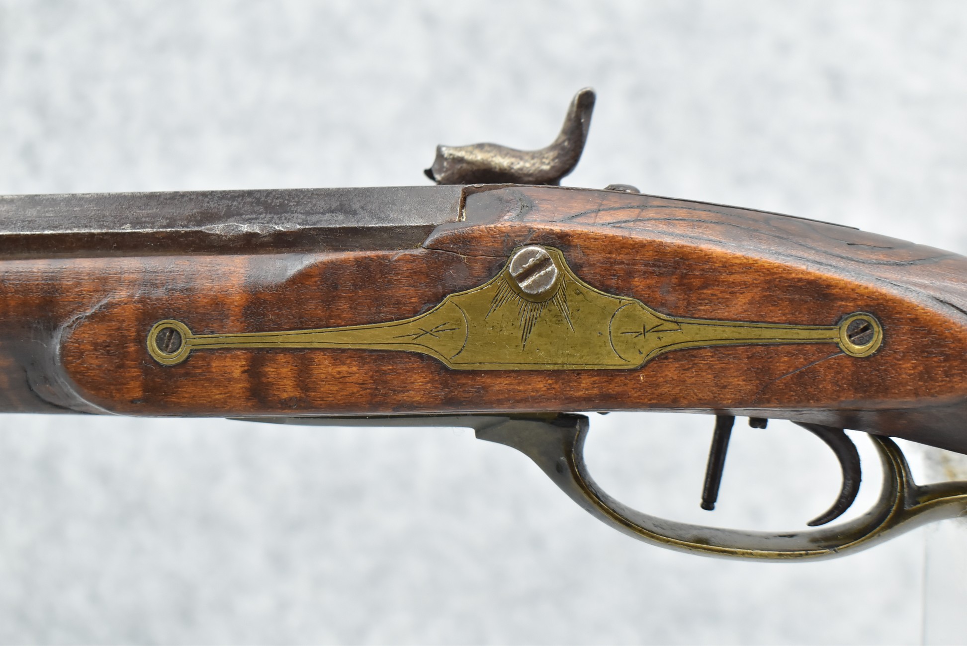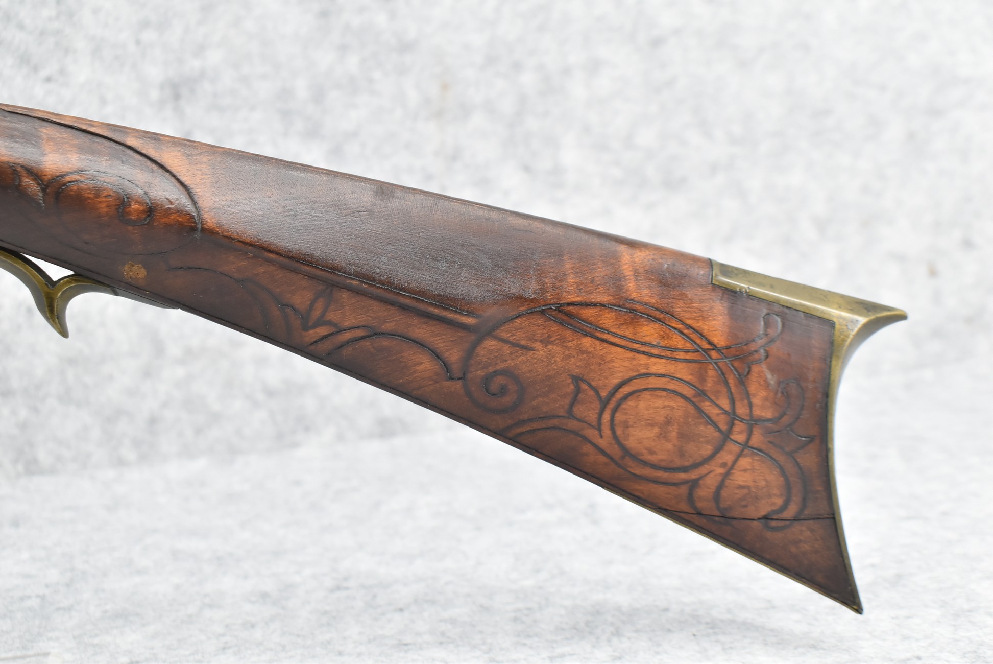 160.        Unsigned 32 Cal. Full Stock Long Rifle Attributed to Jonathan Dunmeyer of Somerset County, PA – Gun Has a 32 Cal. 39” Octagon Barrel w/Front & Rear Barrel Sights – w/Full Wood Stock w/Incised Carved Along Tang, Wrist Area & Lower Side of Butt Stock w/4pc. Engraved Patch Box (Which is the Identical Patch Box Listed in “Kentucky Rifle Patch Boxes Vol. 2” by Chandler & Whisker) – Gun is Fitted w/A Very Unusual Back Lock Brass Plate – Lock Plate & Hammer Engraved – Dunmeyer (1828-1885) Was Located in Somerset Twp, Somerset County Just West of Bedford County – Overall Length of 54”