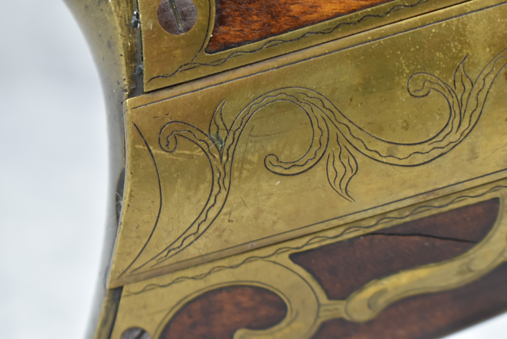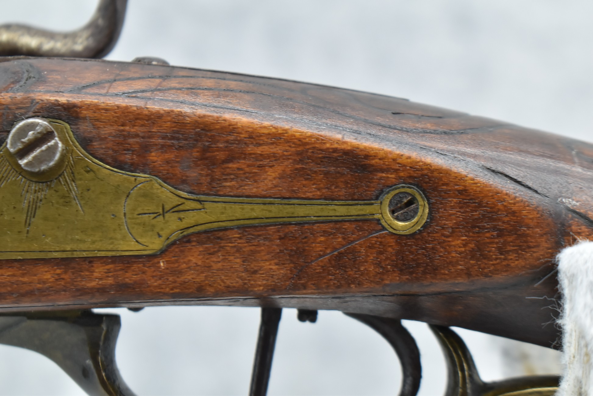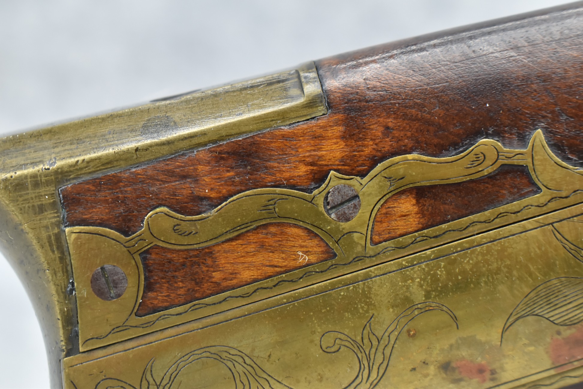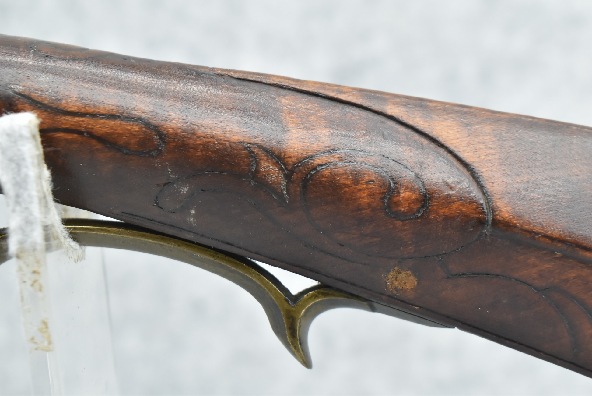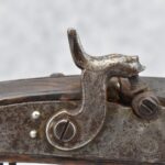 160.        Unsigned 32 Cal. Full Stock Long Rifle Attributed to Jonathan Dunmeyer of Somerset County, PA – Gun Has a 32 Cal. 39” Octagon Barrel w/Front & Rear Barrel Sights – w/Full Wood Stock w/Incised Carved Along Tang, Wrist Area & Lower Side of Butt Stock w/4pc. Engraved Patch Box (Which is the Identical Patch Box Listed in “Kentucky Rifle Patch Boxes Vol. 2” by Chandler & Whisker) – Gun is Fitted w/A Very Unusual Back Lock Brass Plate – Lock Plate & Hammer Engraved – Dunmeyer (1828-1885) Was Located in Somerset Twp, Somerset County Just West of Bedford County – Overall Length of 54”
