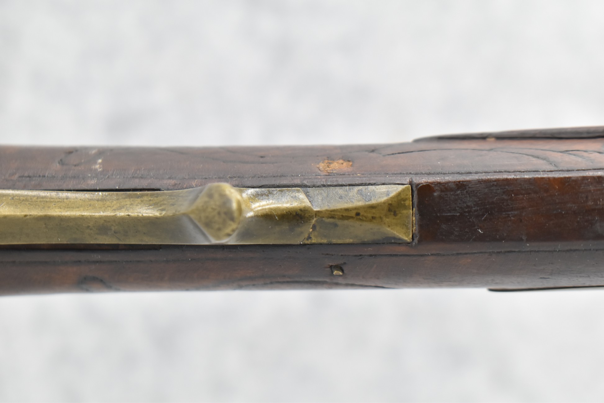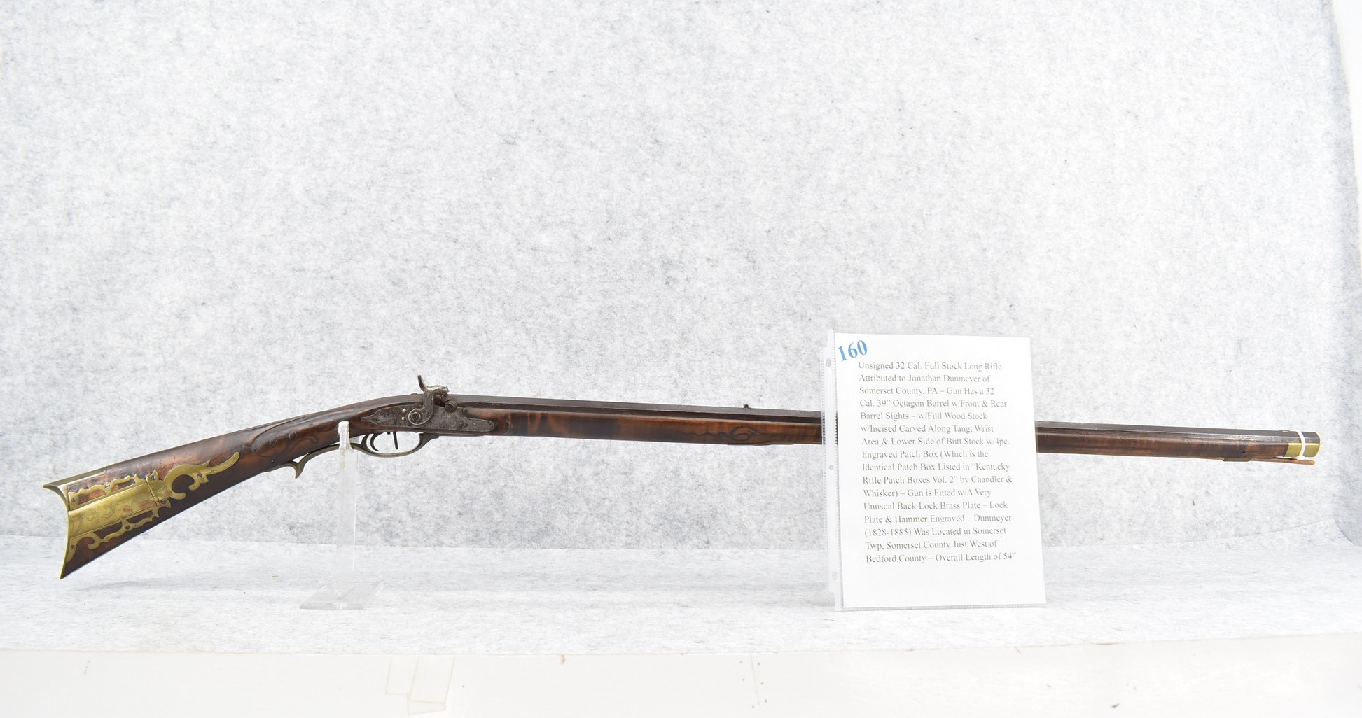 160.        Unsigned 32 Cal. Full Stock Long Rifle Attributed to Jonathan Dunmeyer of Somerset County, PA – Gun Has a 32 Cal. 39” Octagon Barrel