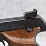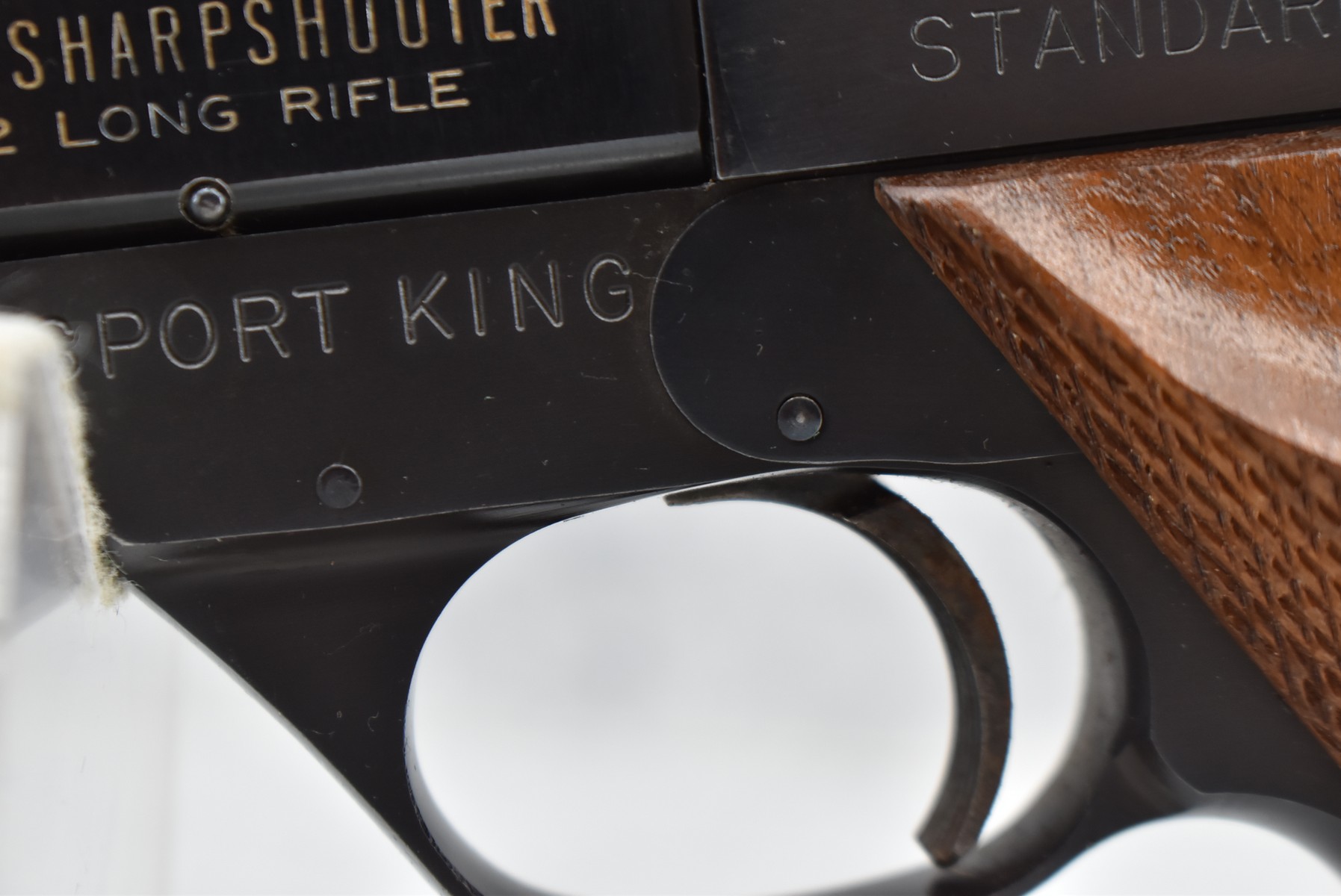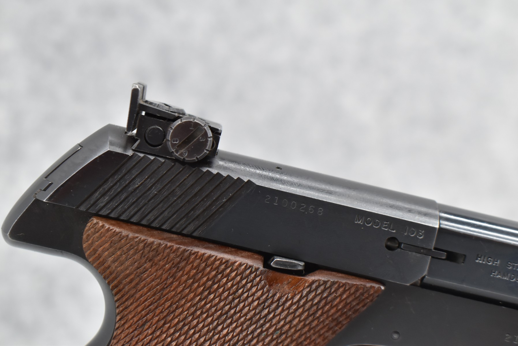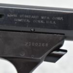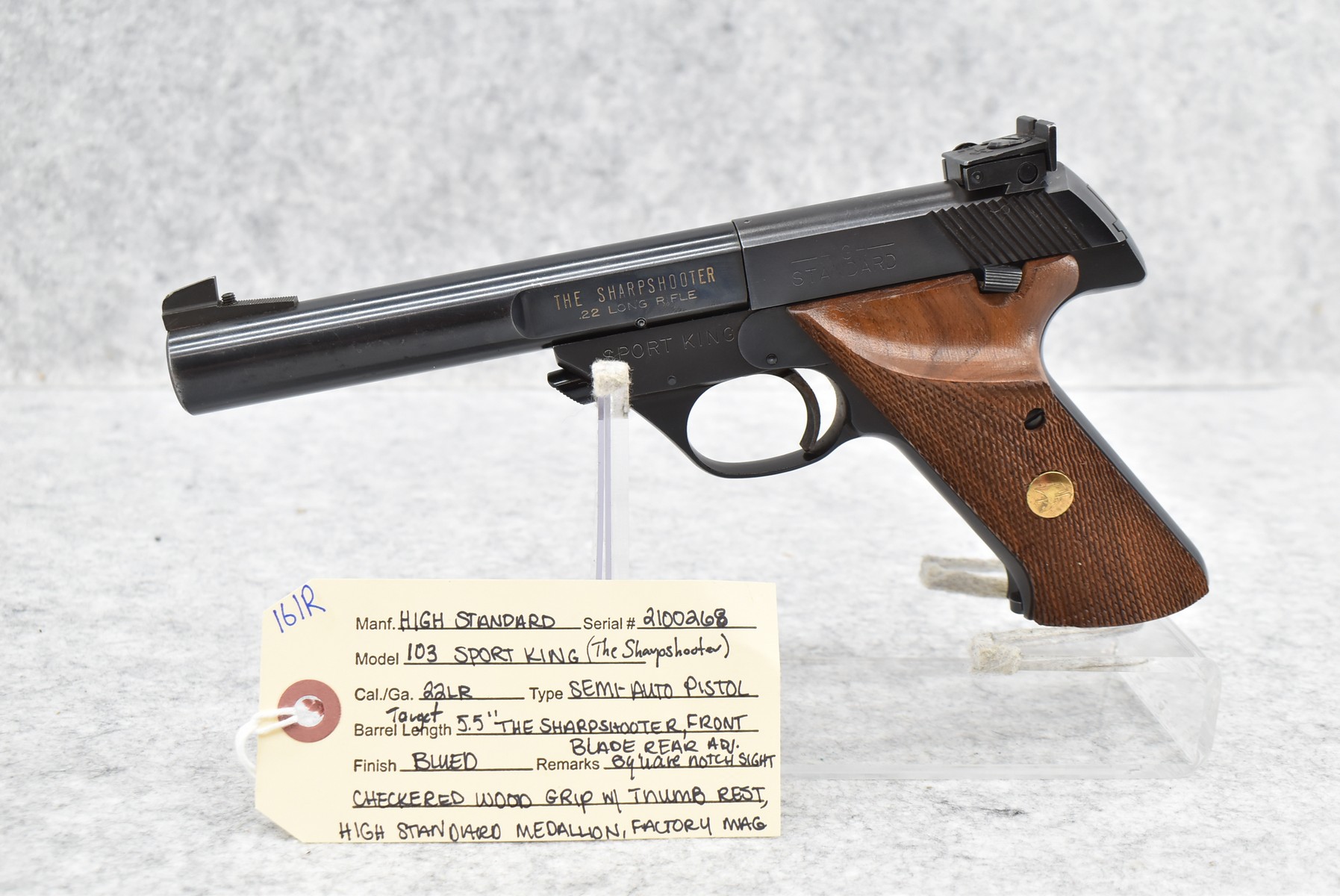 161R. High Standard – Mod. 103 Sport King (The Sharpshooter) – 22LR Cal. Semi-Auto Pistol – w/5.5” Target Barrel w/Front Blade & Rear Adj. Square Notch Sights – Blued Finish – w/Checked Wood Grip w/Thumb Rest & High Standard Medallion – w/Factory Mag