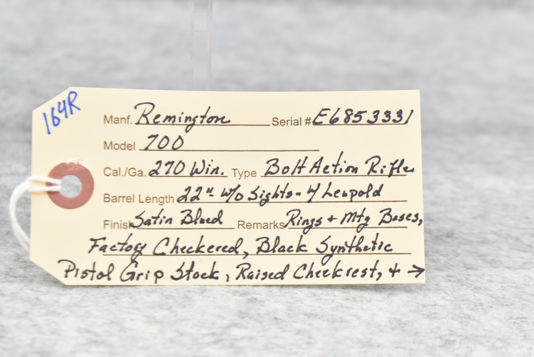 164R. Remington – Mod. 700 ADL – 270 Win. Cal. Bolt Action Rifle – w/22” Barrel (No Sights) – Satin Blued Finish – w/Factory Checkered Black Synthetic Pistol Grip Stock w/Raised Cheek Piece w/Butt Pad – w/Leupold Rings & Mounting Bases