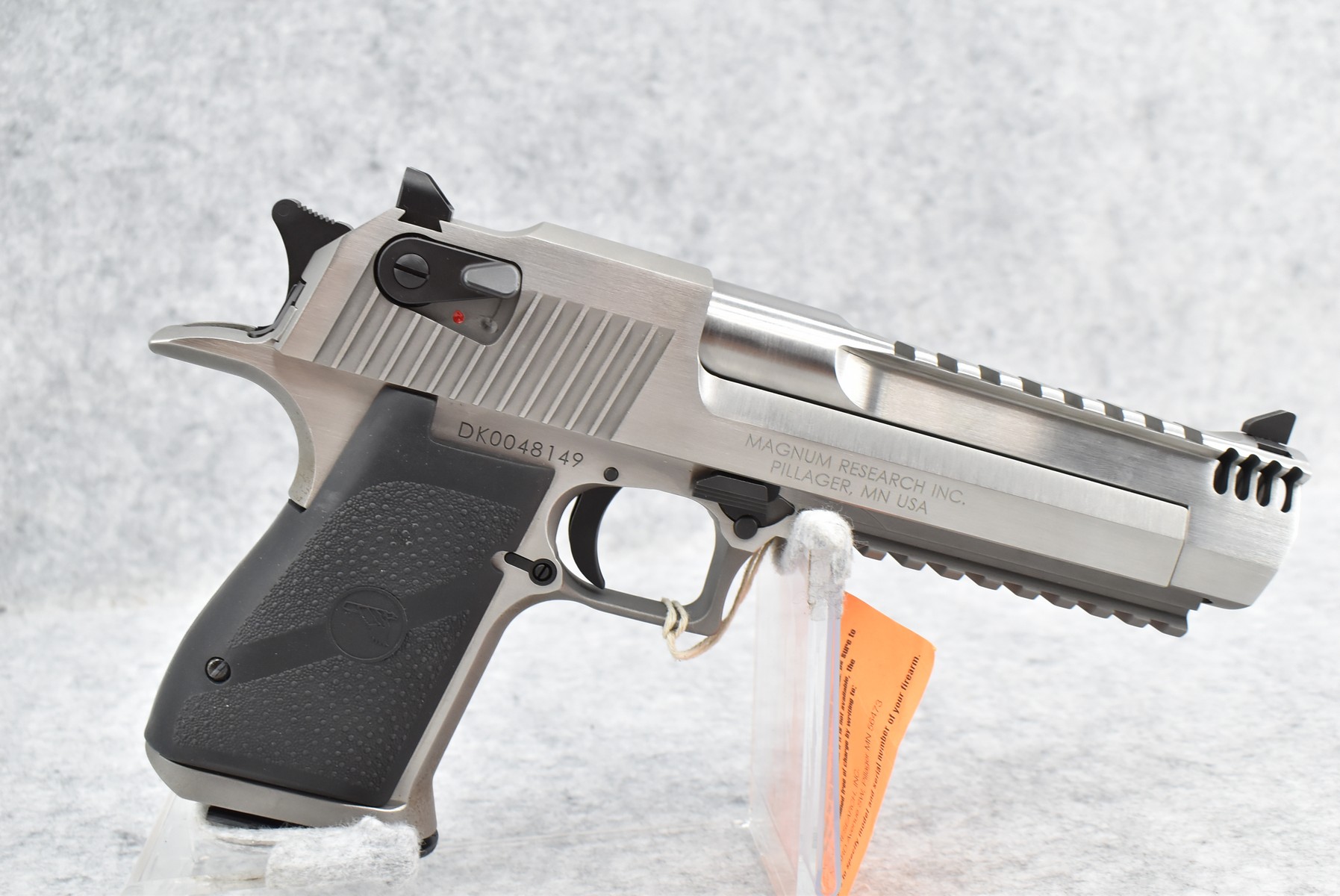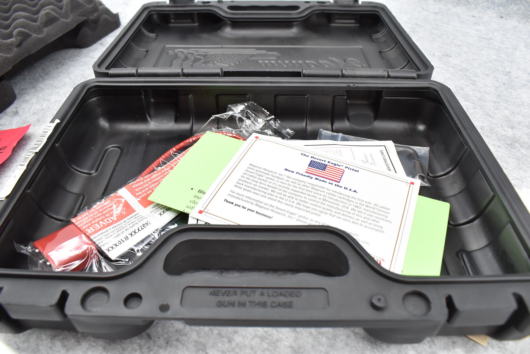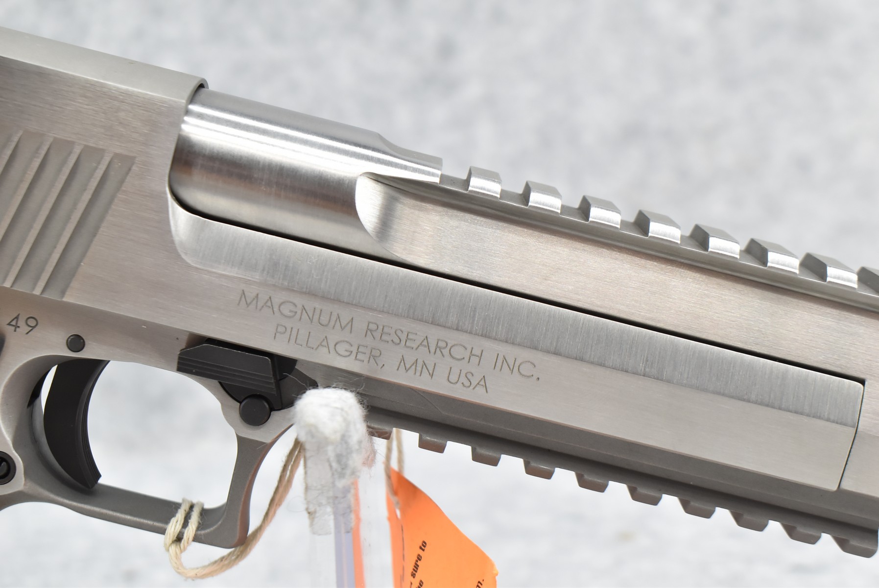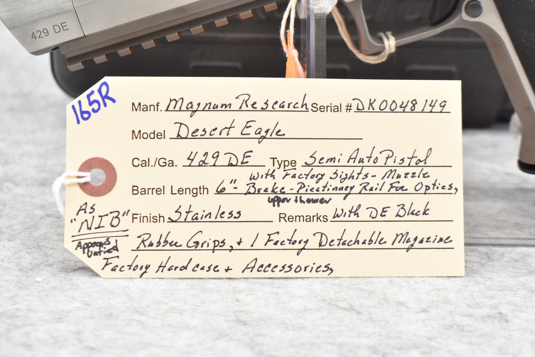 165R. Magnum Research – Mod. Desert Eagle – 429 DE Cal. Semi-Auto Pistol – w/6” Barrel w/Factory Sights & Muzzle Brake – w/Upper & Lower Picatinny Rail for Optics – Stainless Finish – w/Desert Eagle Black Rubber Grips – w/Factory Detachable Magazine – Appears Unfired w/Factory Hard Case & Accessories