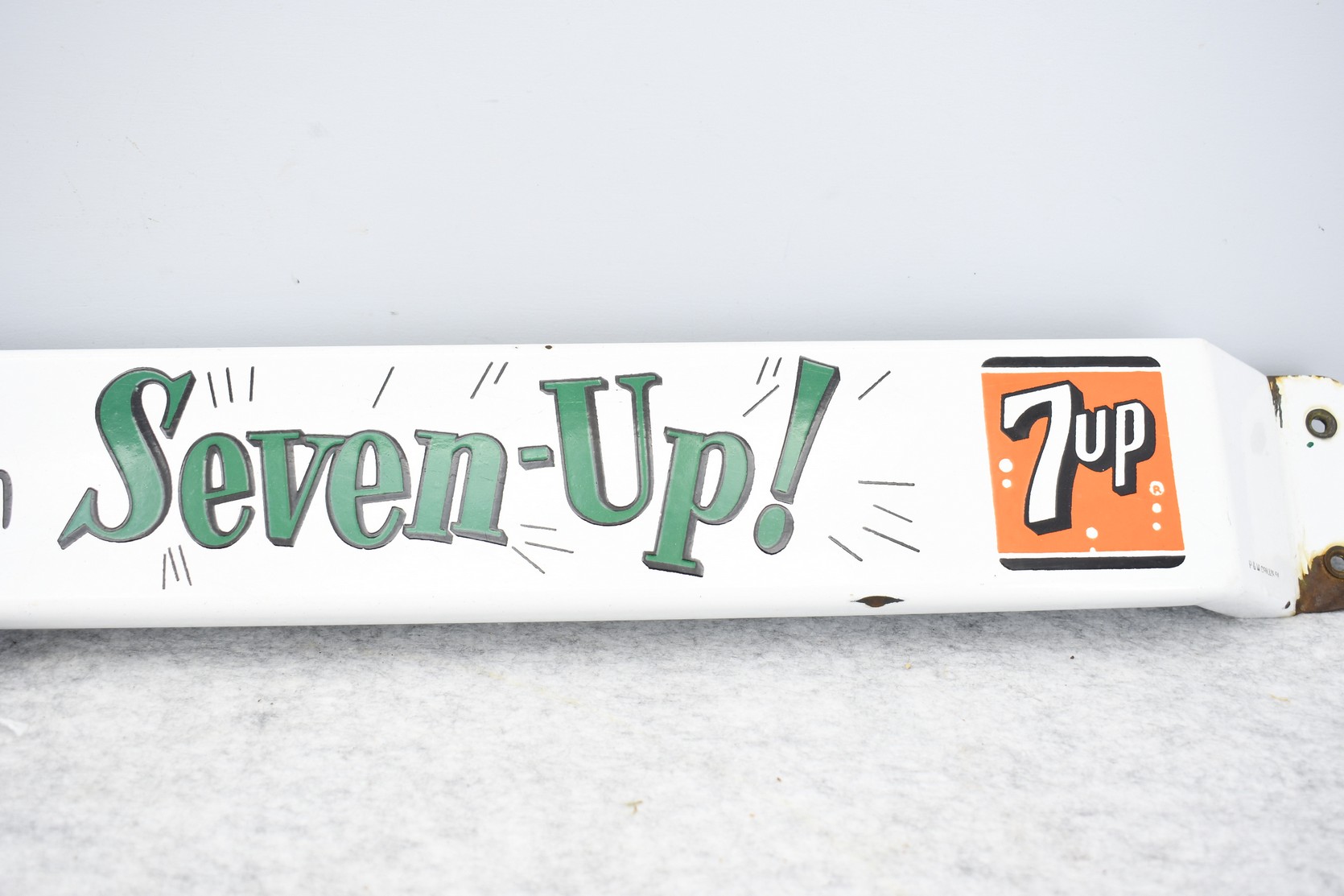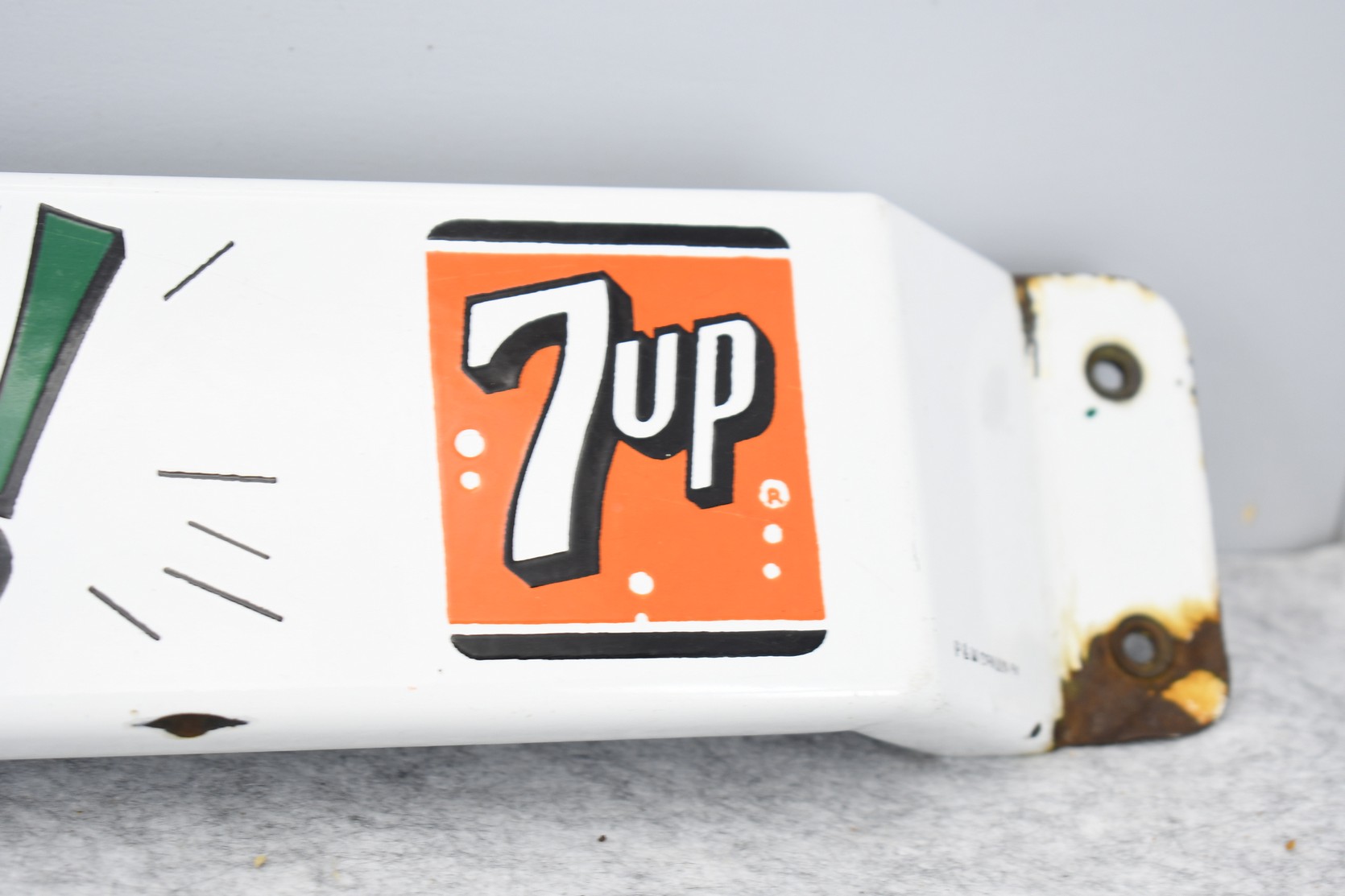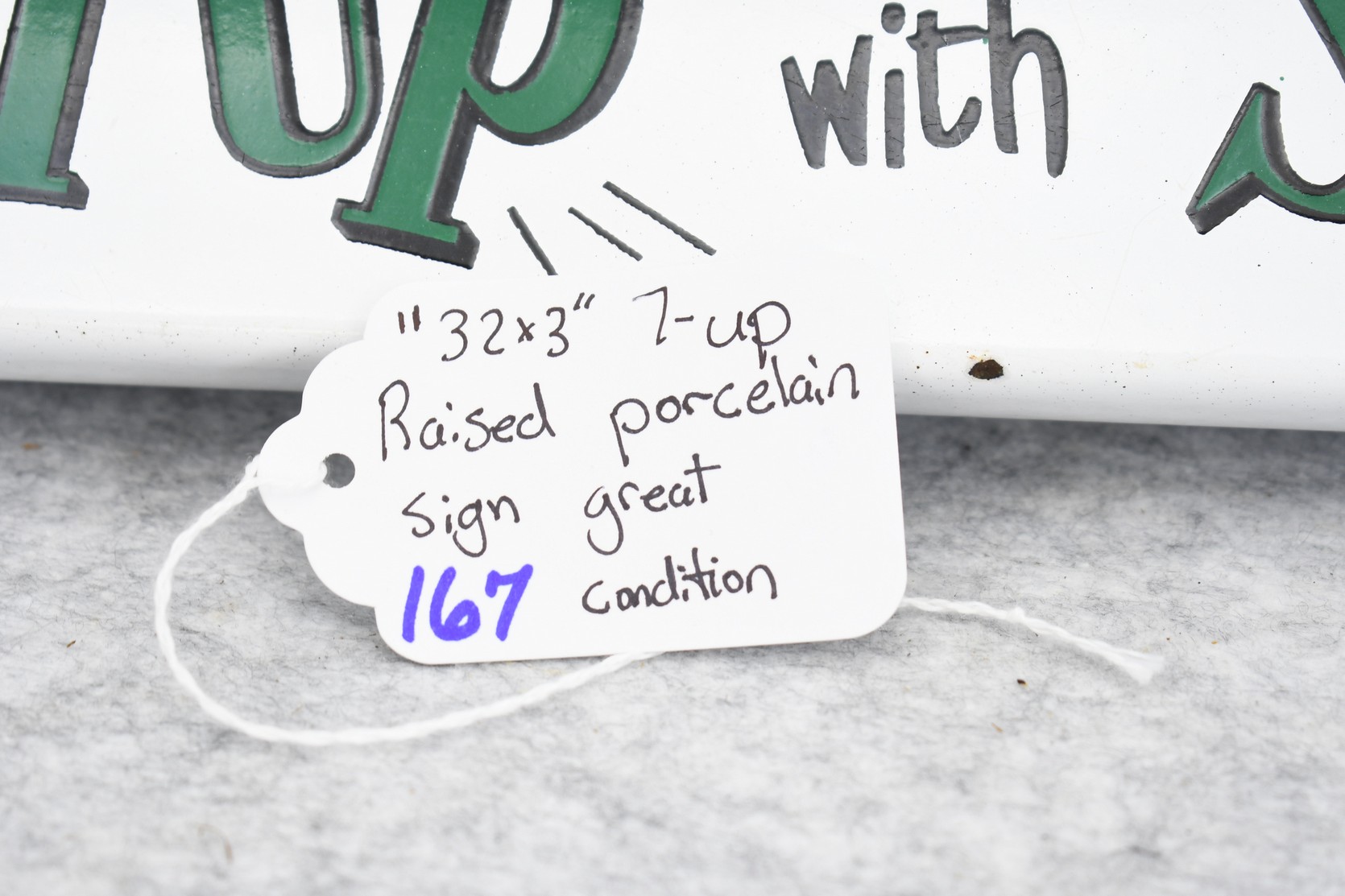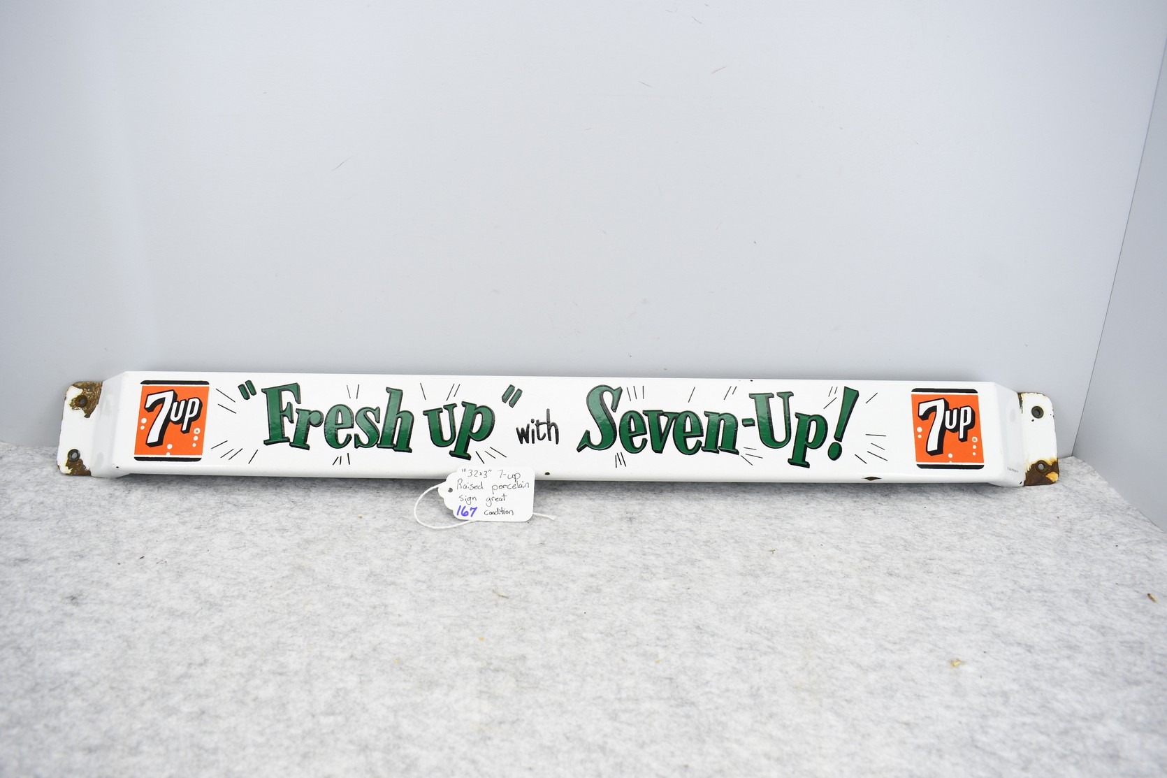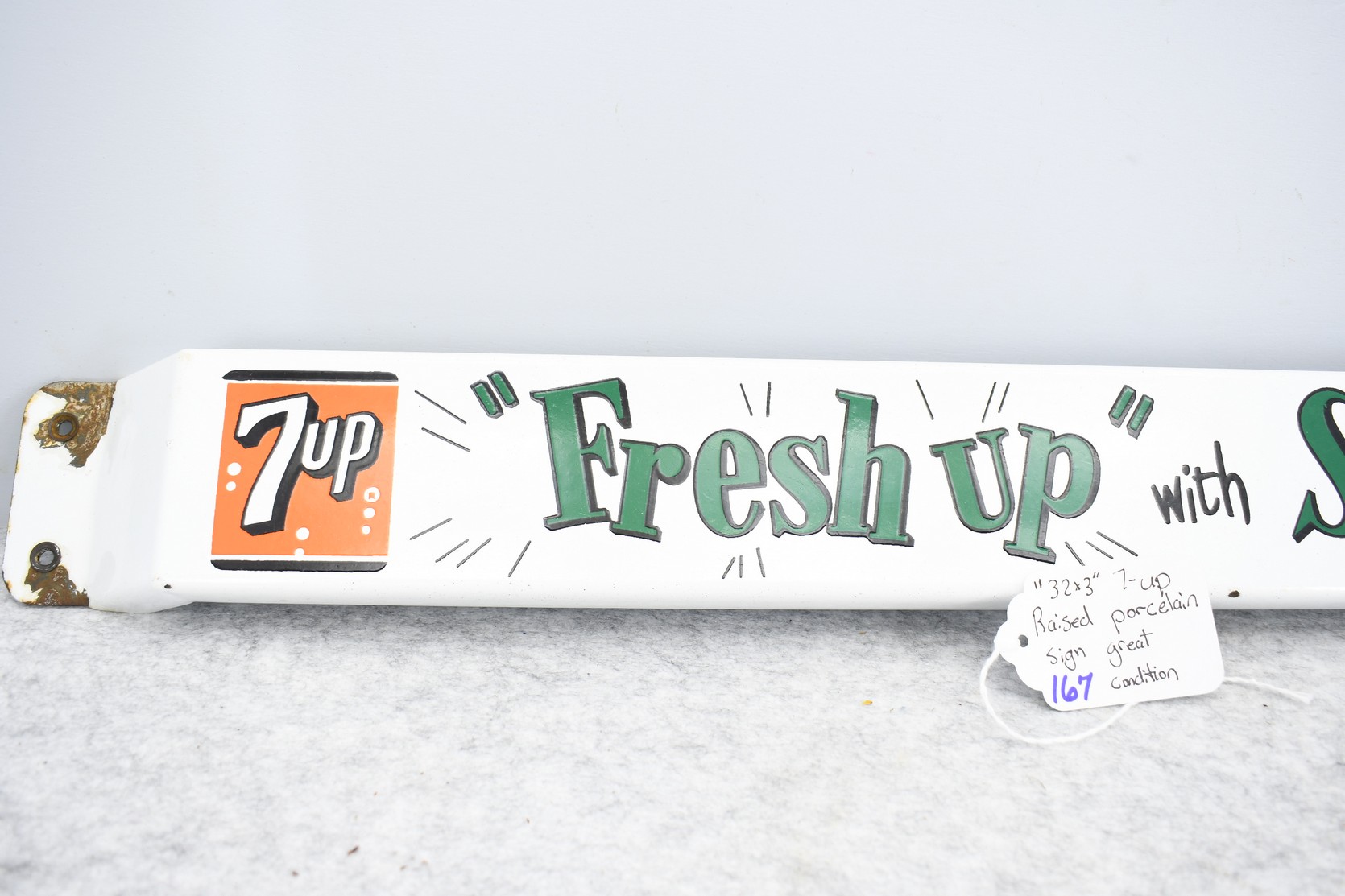 167. 7UP Original Porcelain Shelf Sign – “Fresh Up with Seven Up” – Measures 32” x 3” – In Very Good Condition