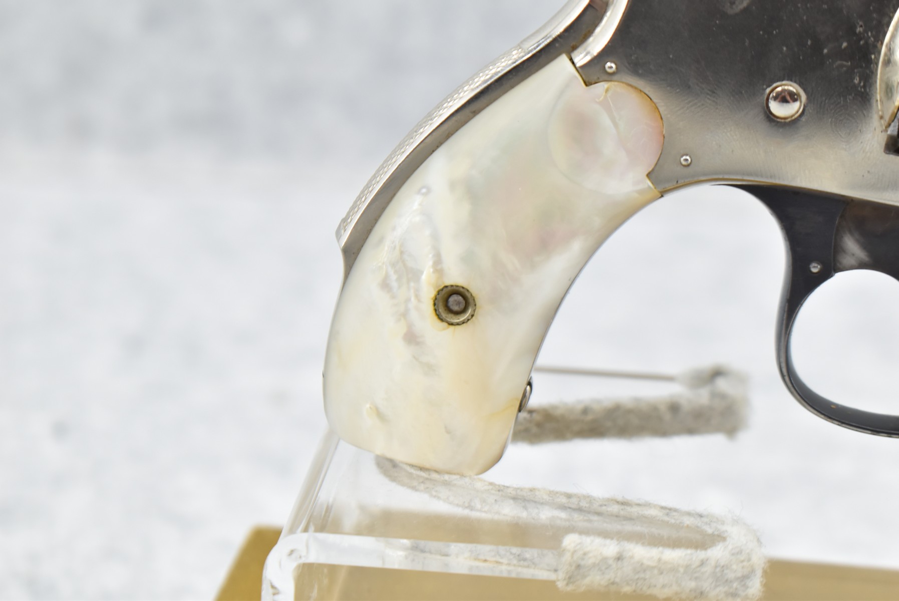 169. Smith & Wesson – Mod. .32 Safety Hammerless-1st Model – 32 S&W Cal. Double Action Revolver – w/3” Barrel w/Pinned Round Blade Front & Notch Rear Sights – Nickel Finish – w/Mother of Pearl Grips – Numbers Match on Butt & Cylinder – Possibly Unfired w/Original Factory Lift Lid Box w/Good Label – Box # Matches Gun Serial Number! – Great Example!