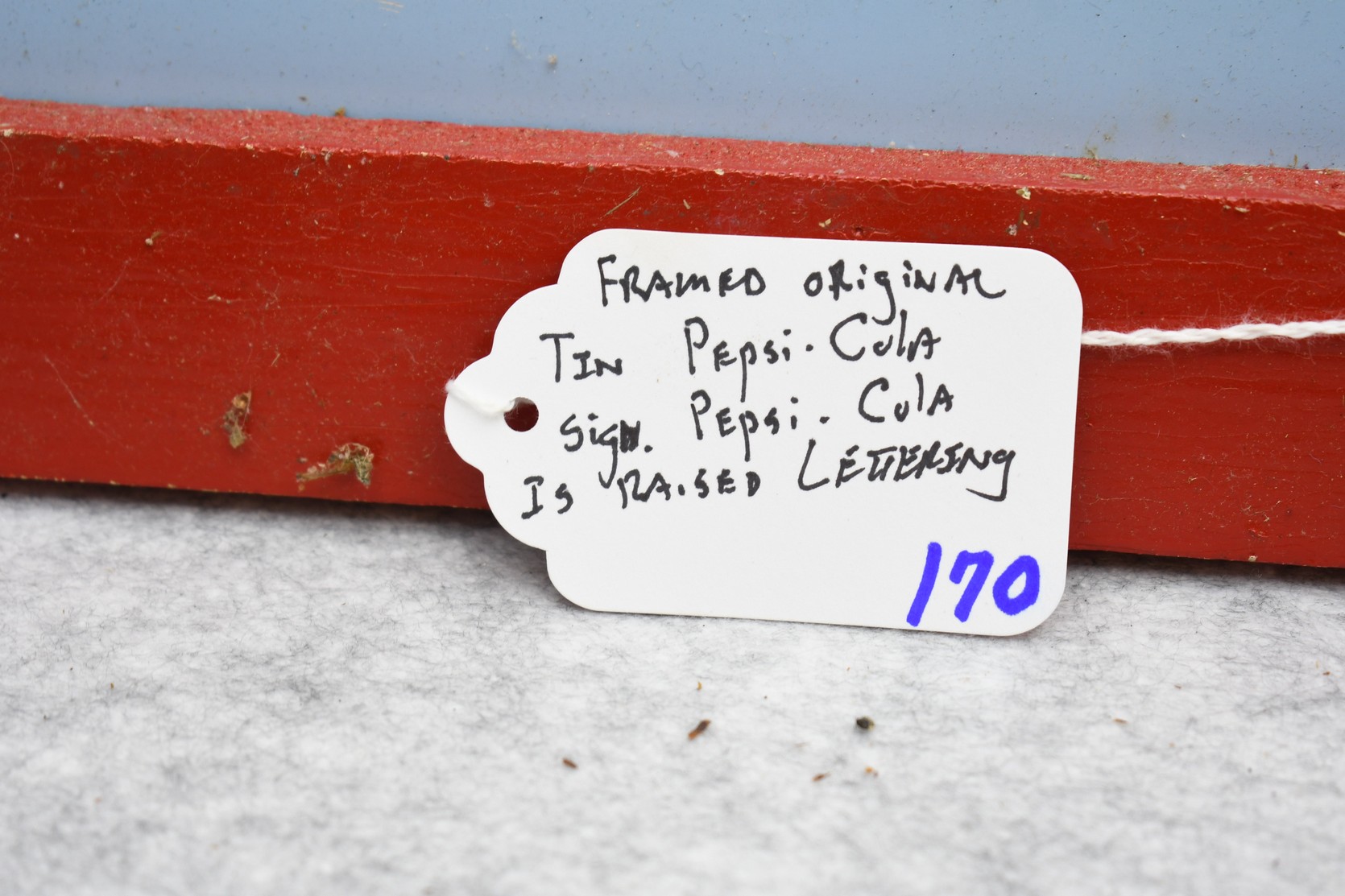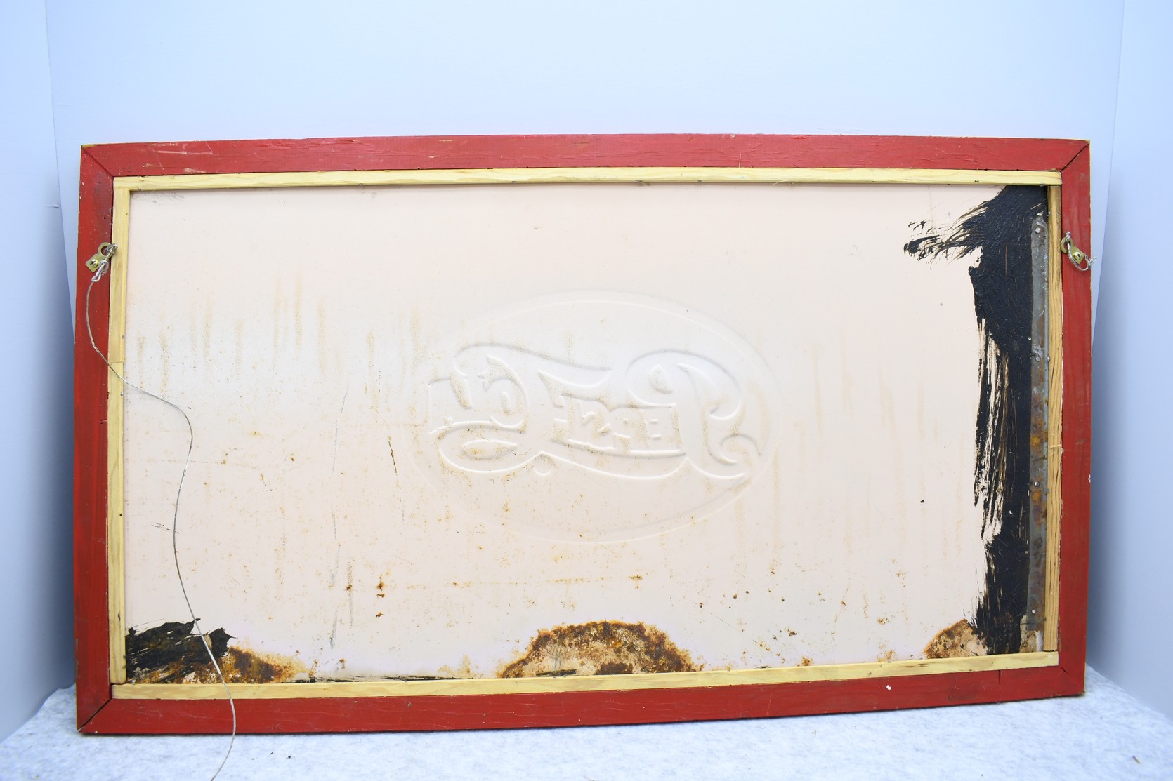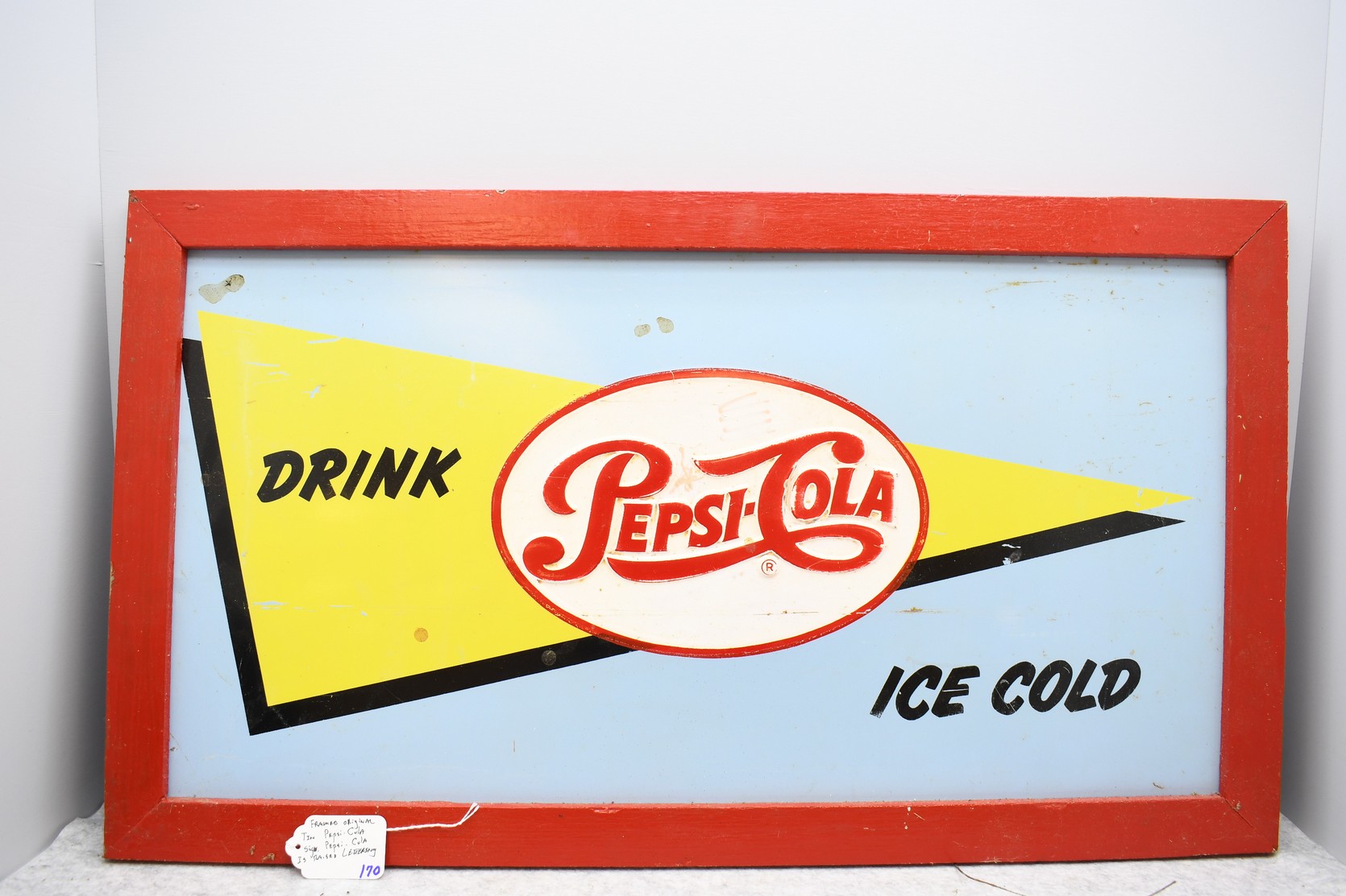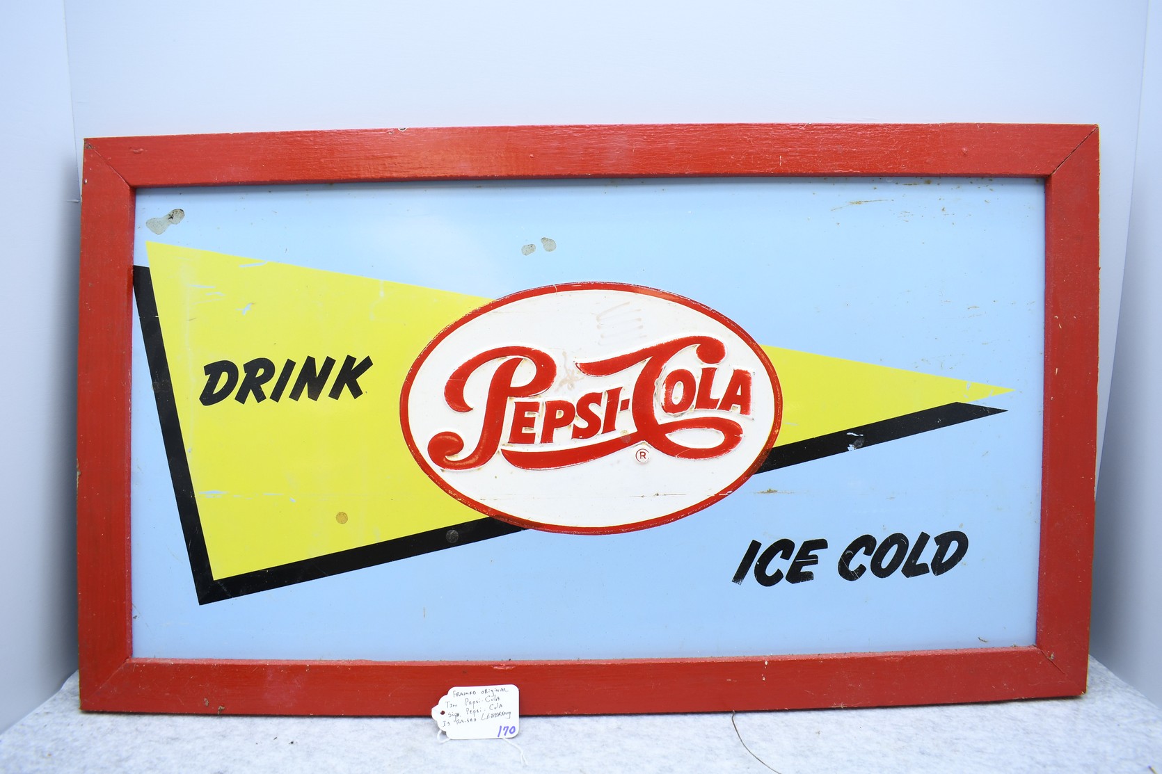 170. Drink Ice Cold Pepsi Cola Framed Advertising Sign – Sign is Original w/Raised Pepsi Cola Lettering – The Sign Measures 31” x 17” – The Overall Width w/Framing is 33½”