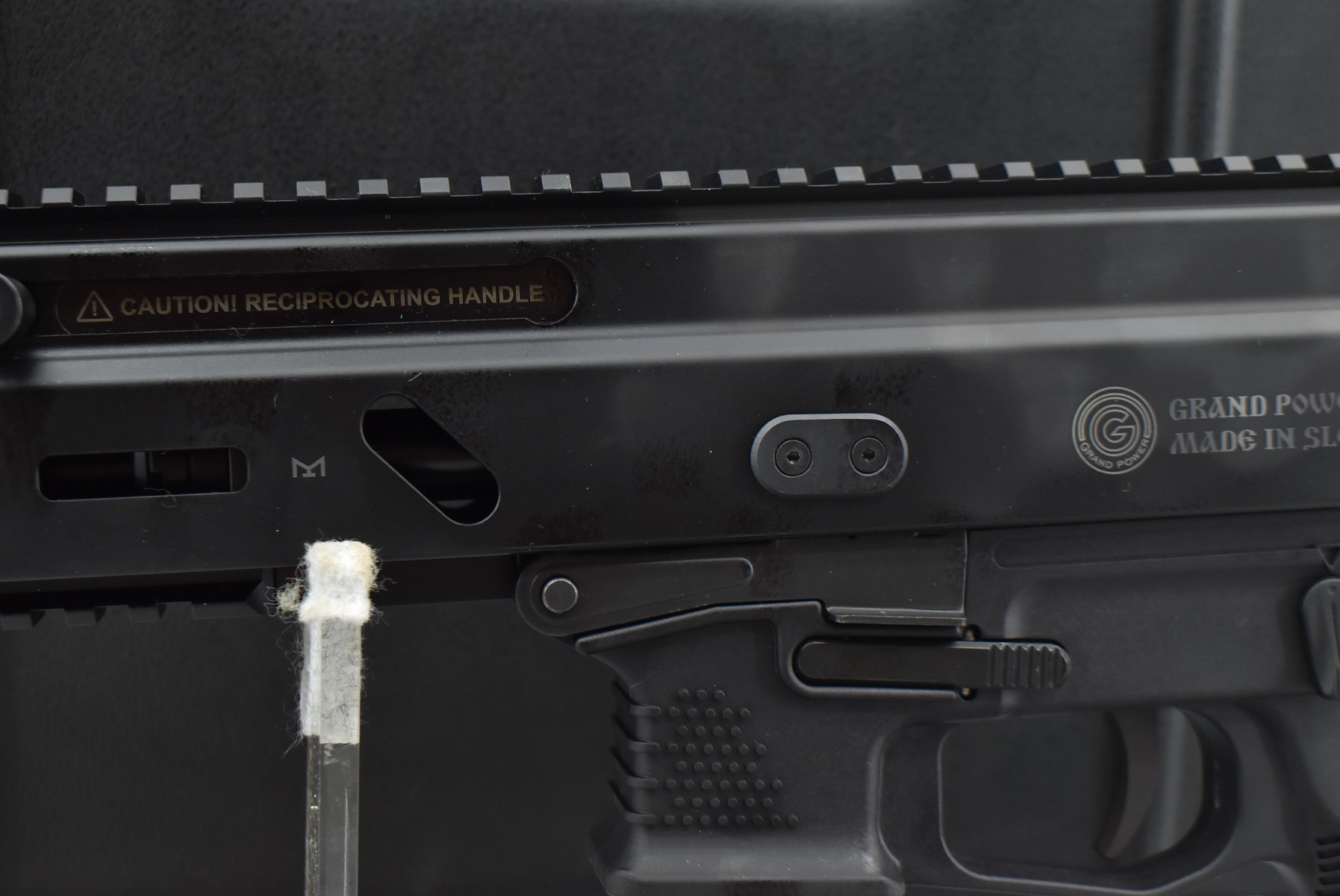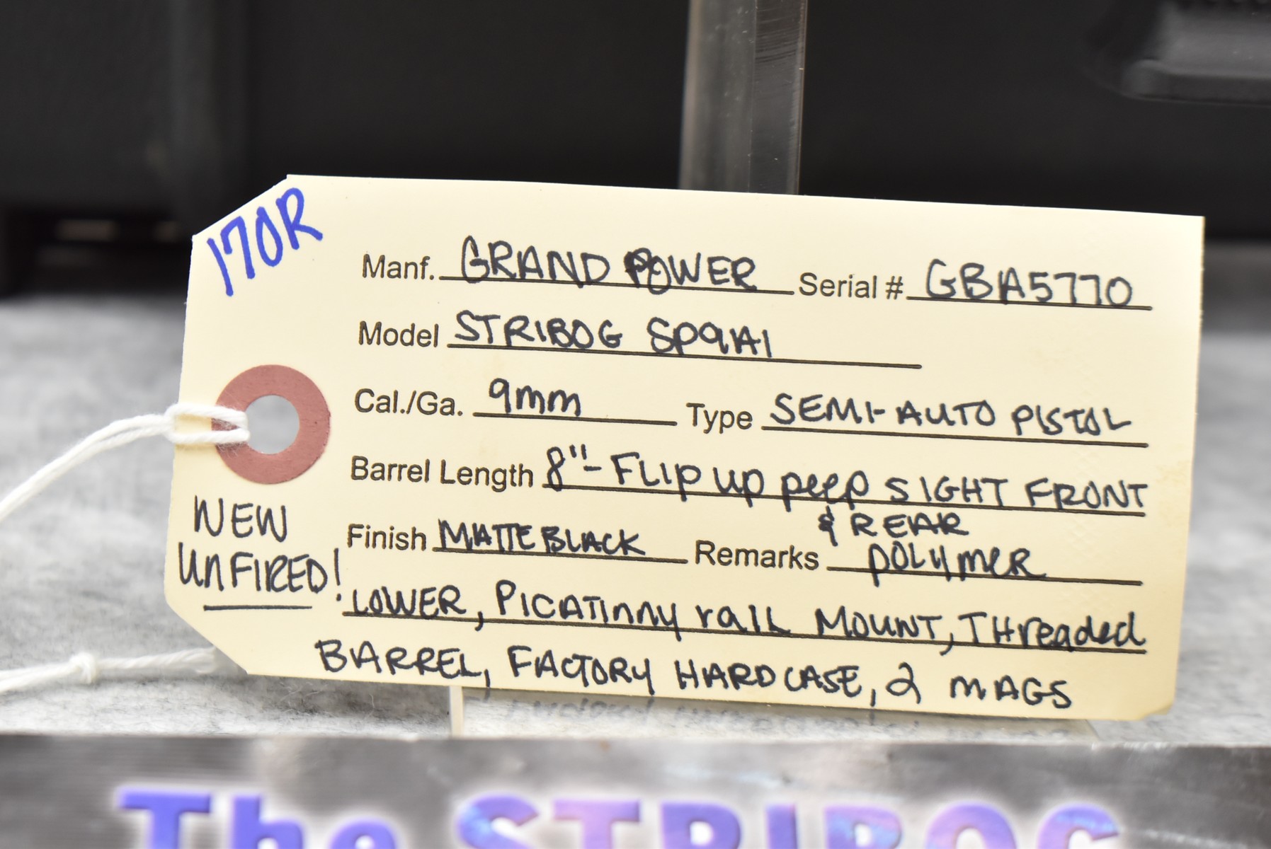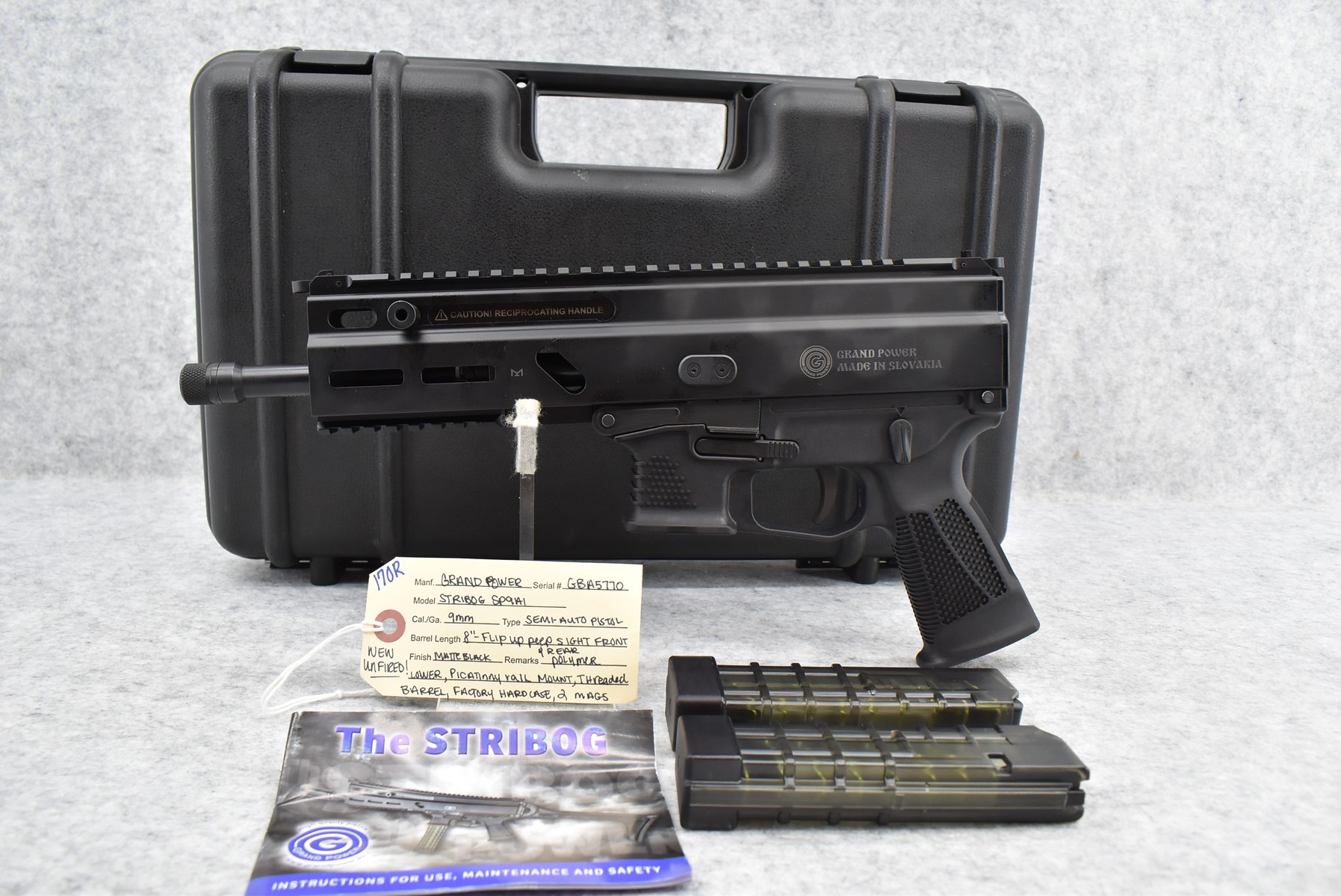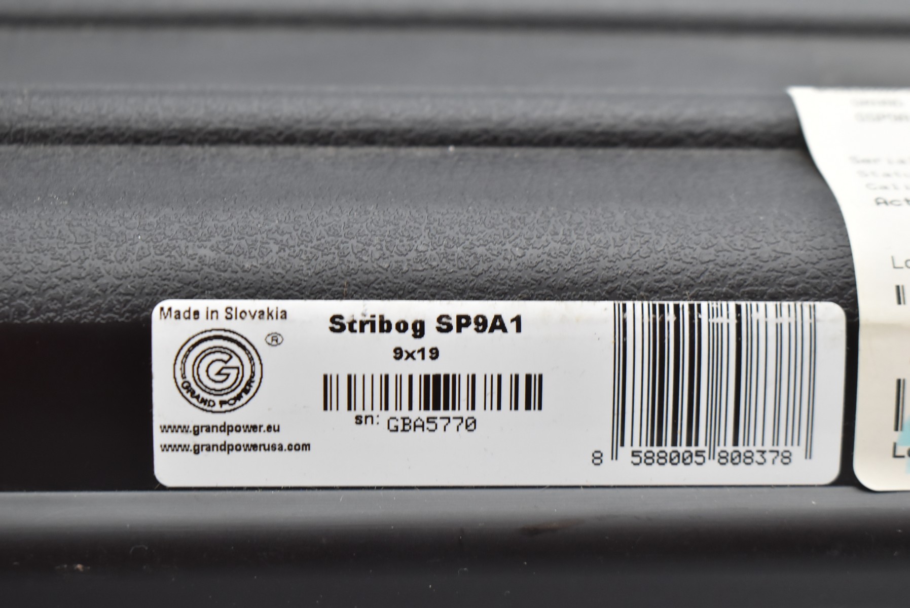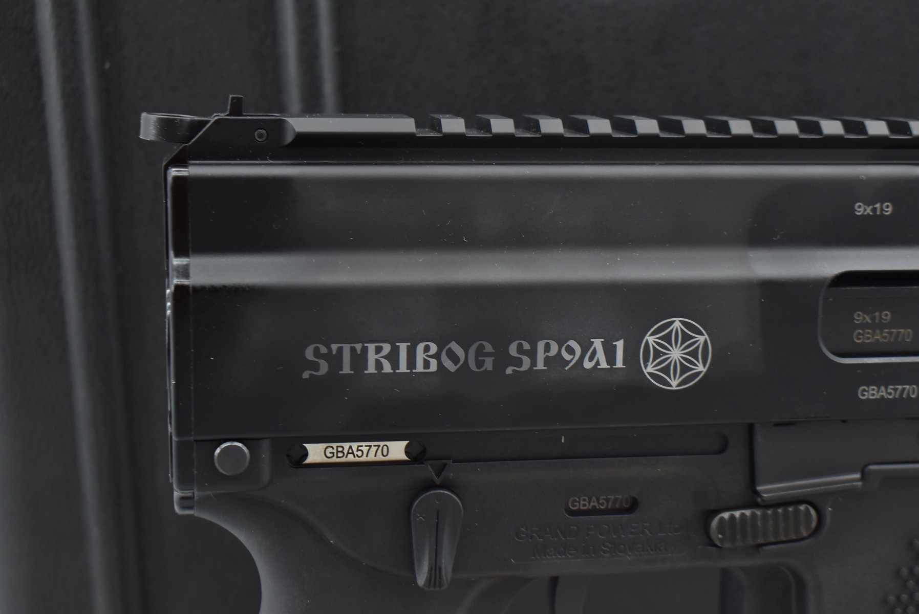 170R. Grand Powder – Mod. STRIBOG SP9A1 – 9mm Cal. Semi-Auto Pistol – w/8” Threaded Barrel w/Flip-Up Peep Sight Front & Rear Sights – Matte Black Finish – w/Polymer Lower – w/Picatinny Rail – New & Unfired w/Factory Hard Case & 2 Mags