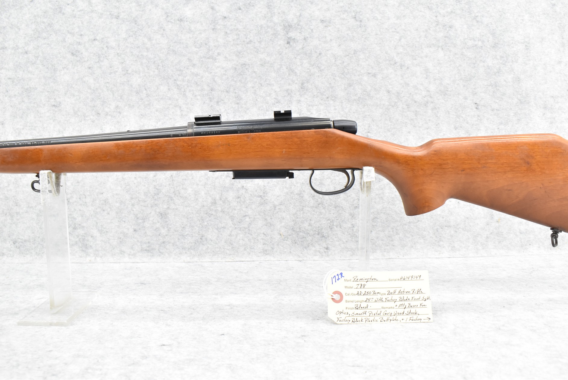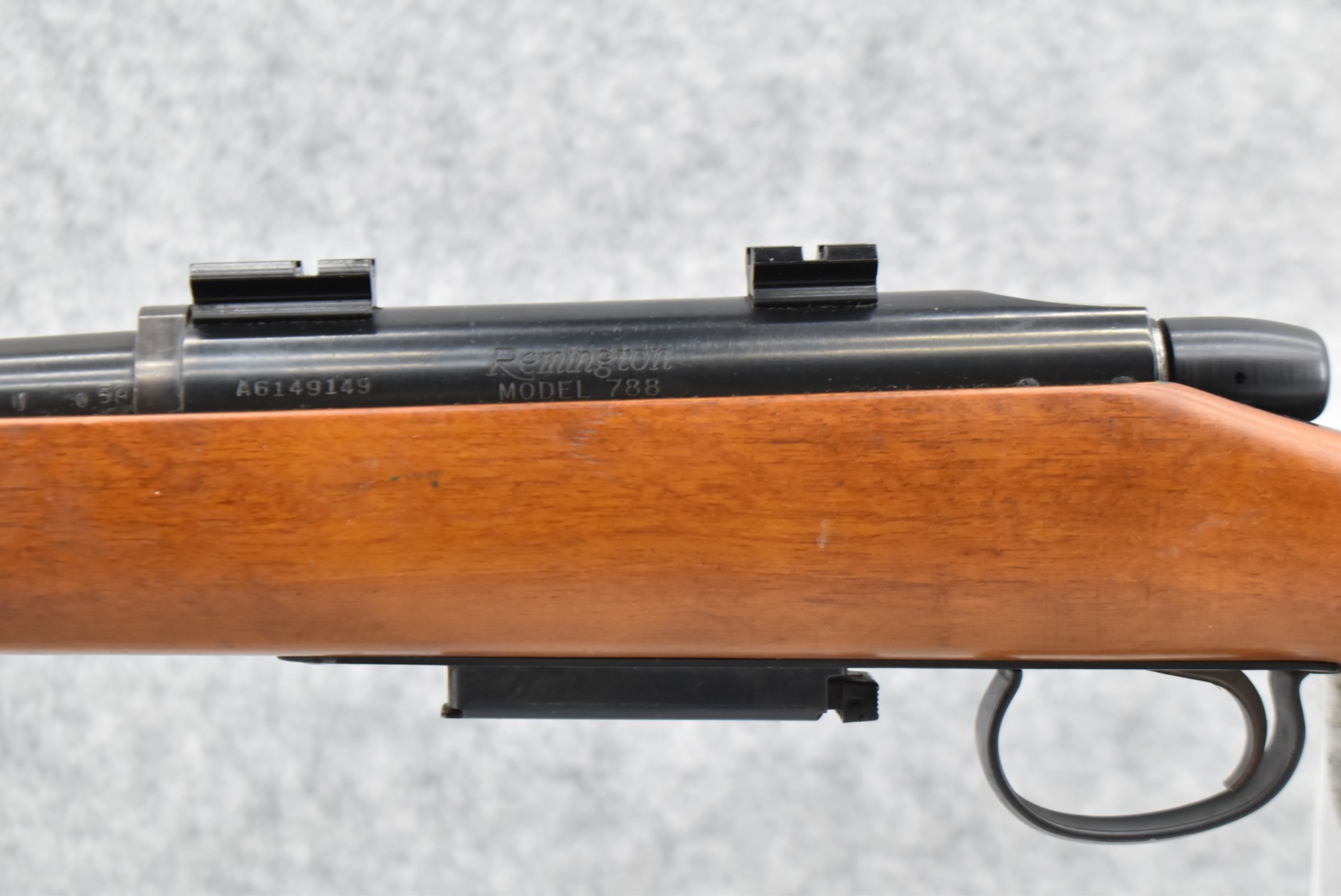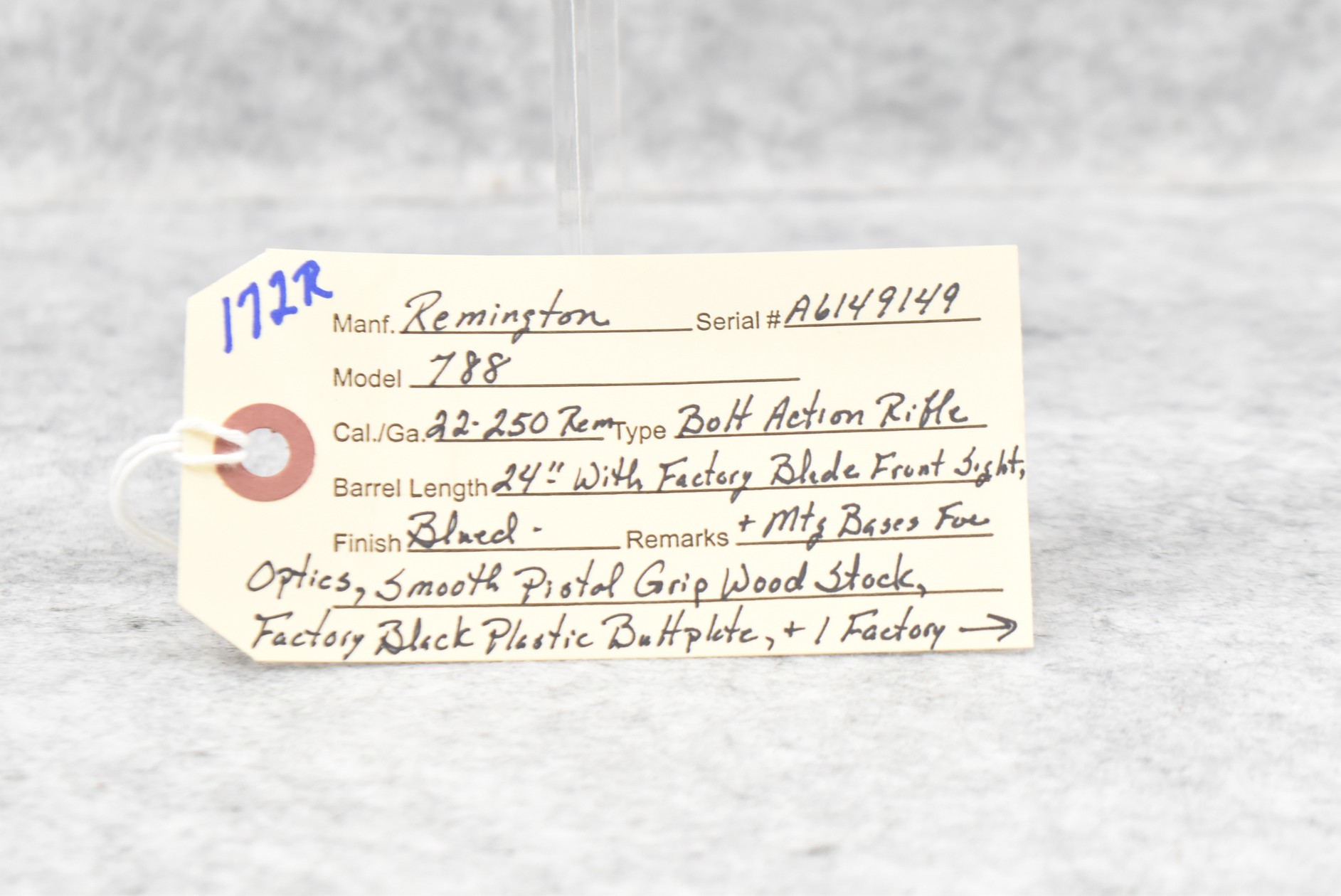 172R. Remington – Mod. 788 – 22-250 Rem. Cal. Bolt Action Rifle – w/24” Barrel w/Factory Blade Front Sight – Blued Finish – w/Smooth Pistol Grip Wood Stock w/Factory Butt Plate – w/Factory Detachable Magazine – w/2 Mounting Bases