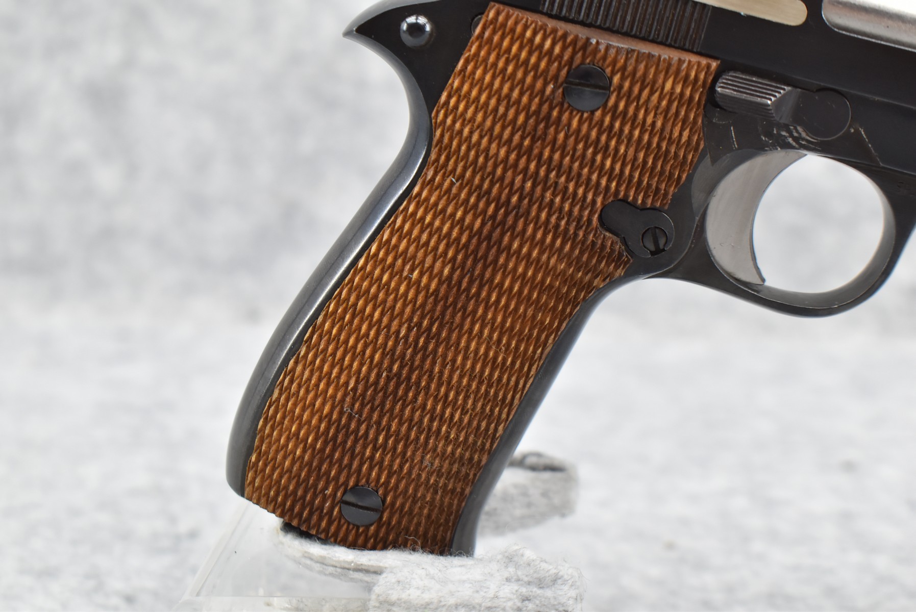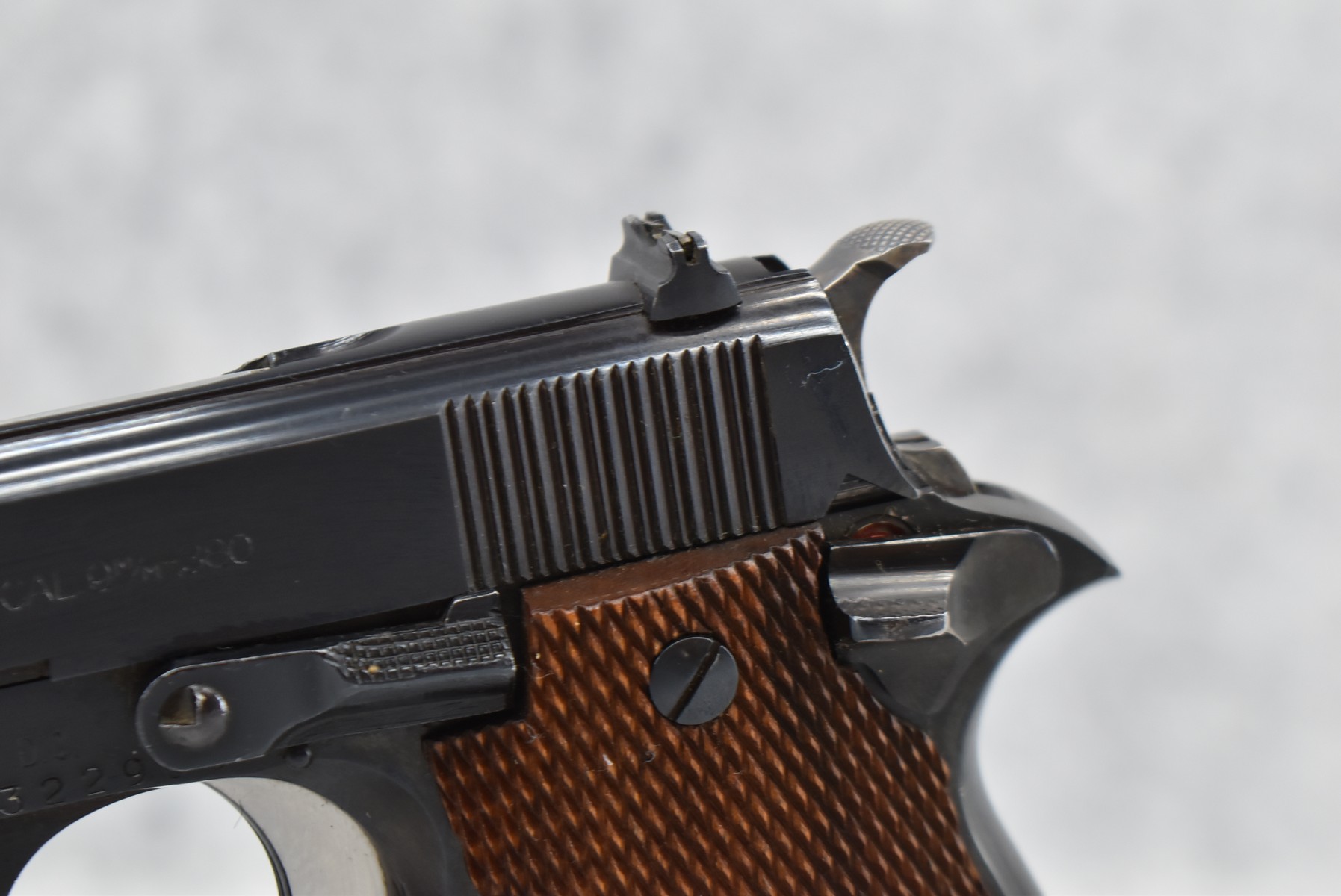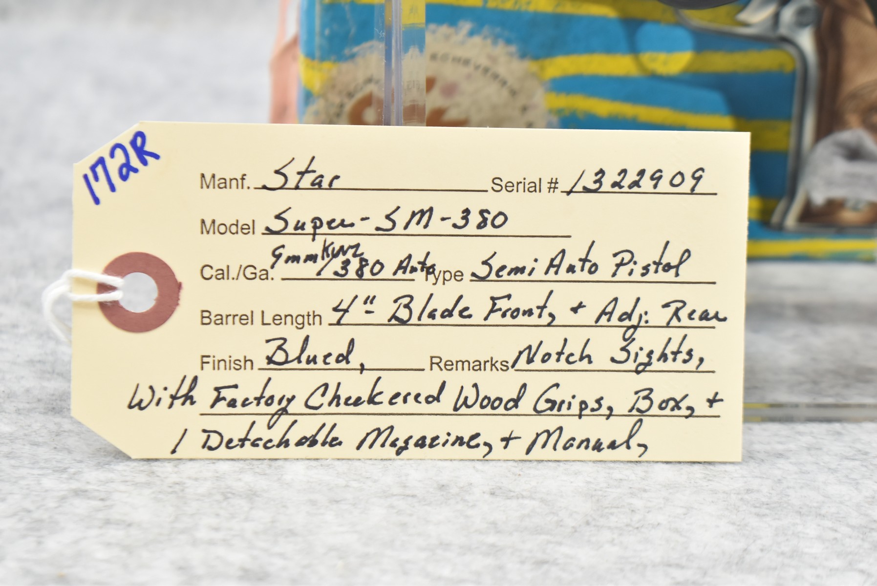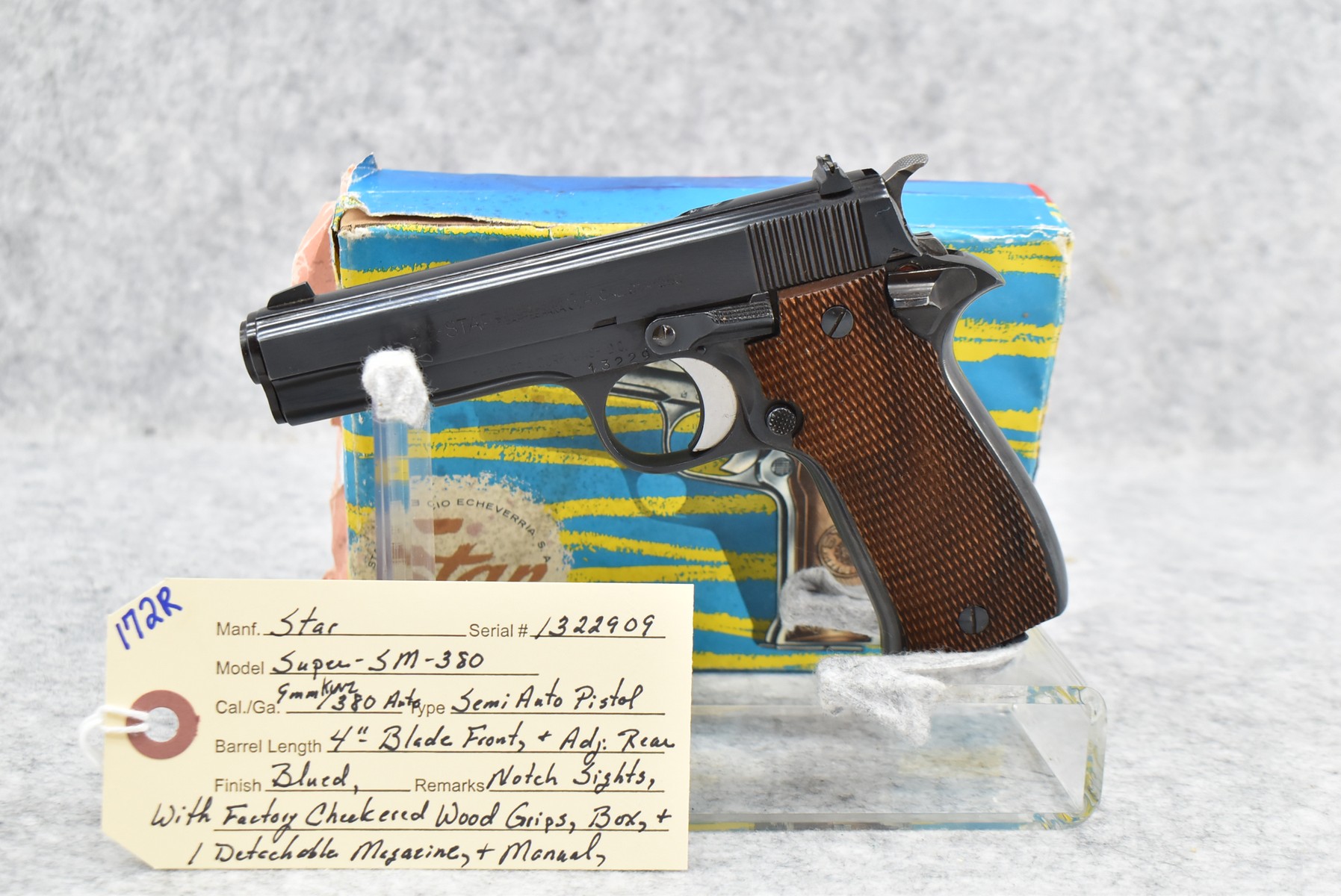 172R. Star – Mod. Super SM 380 – 9mm Kurz/380 Auto Cal. Semi-Auto Pistol – w/4” Barrel w/Blade Front and Adjustable Rear Notch Sights – Blued Finish – w/Factory Checkered Wood Grips – w/Box, Manual, and 1 Detachable Magazine