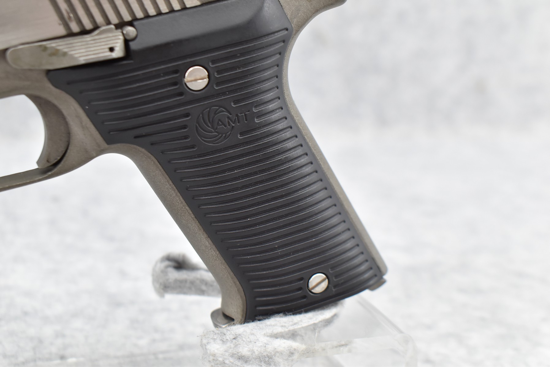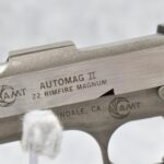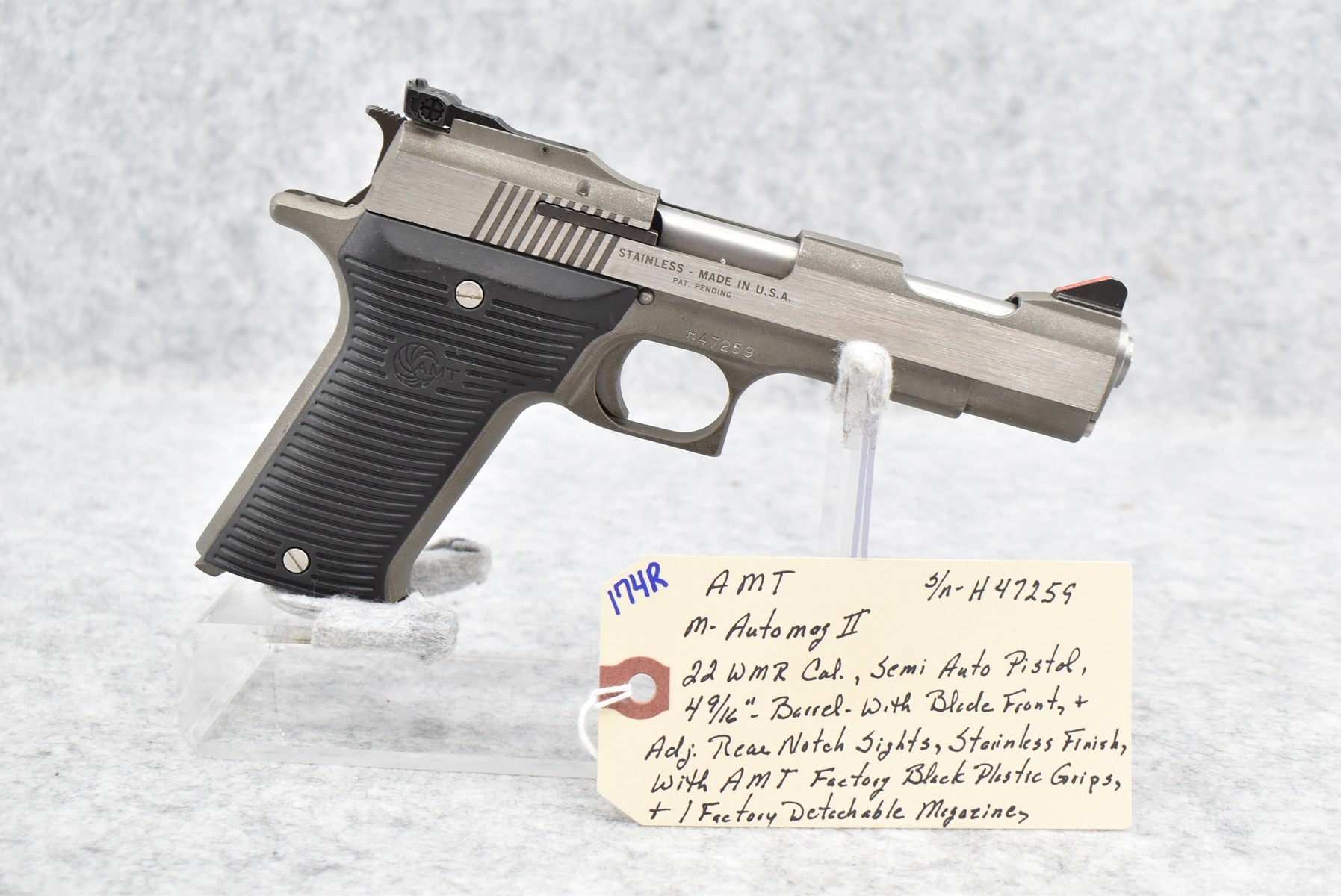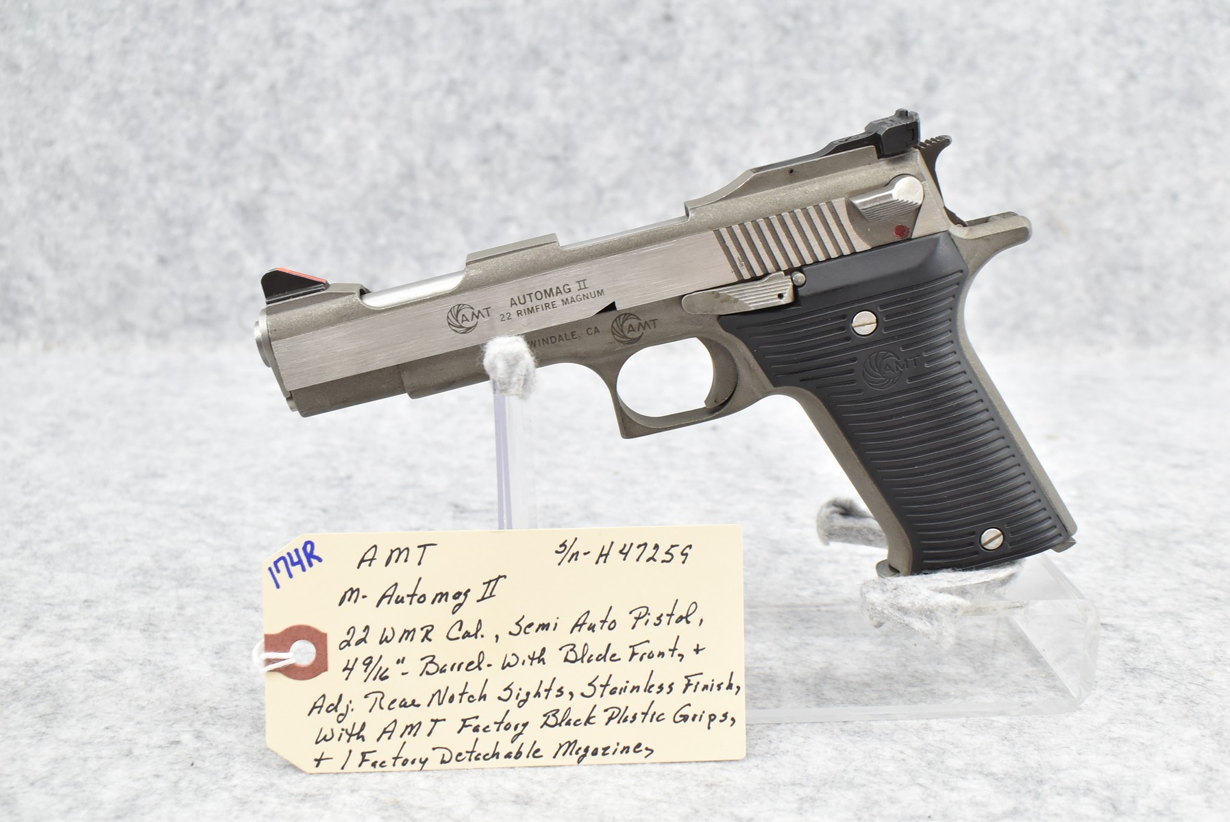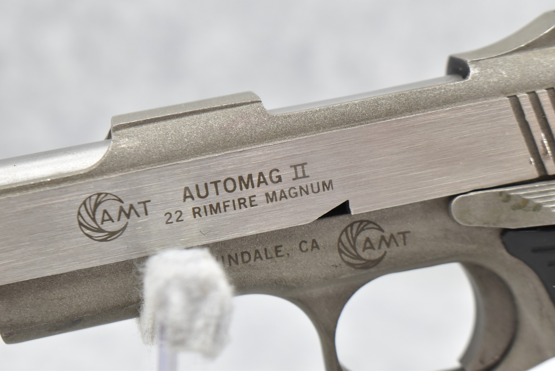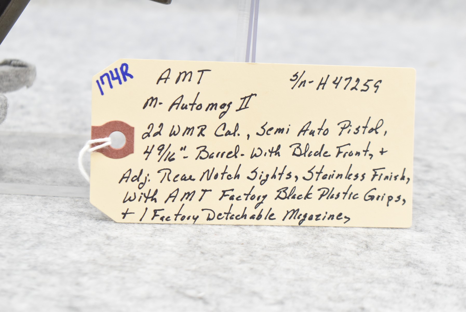 174R. AMT – Mod. Automag II – 22 WMR Cal. Semi-Auto Pistol – w/4 9/16” Barrel w/Blade Front and Adjustable Rear Notch Sights – Stainless Finish – w/AMT Factory Black Plastic Grips – w/1 Factory Detachable Magazine