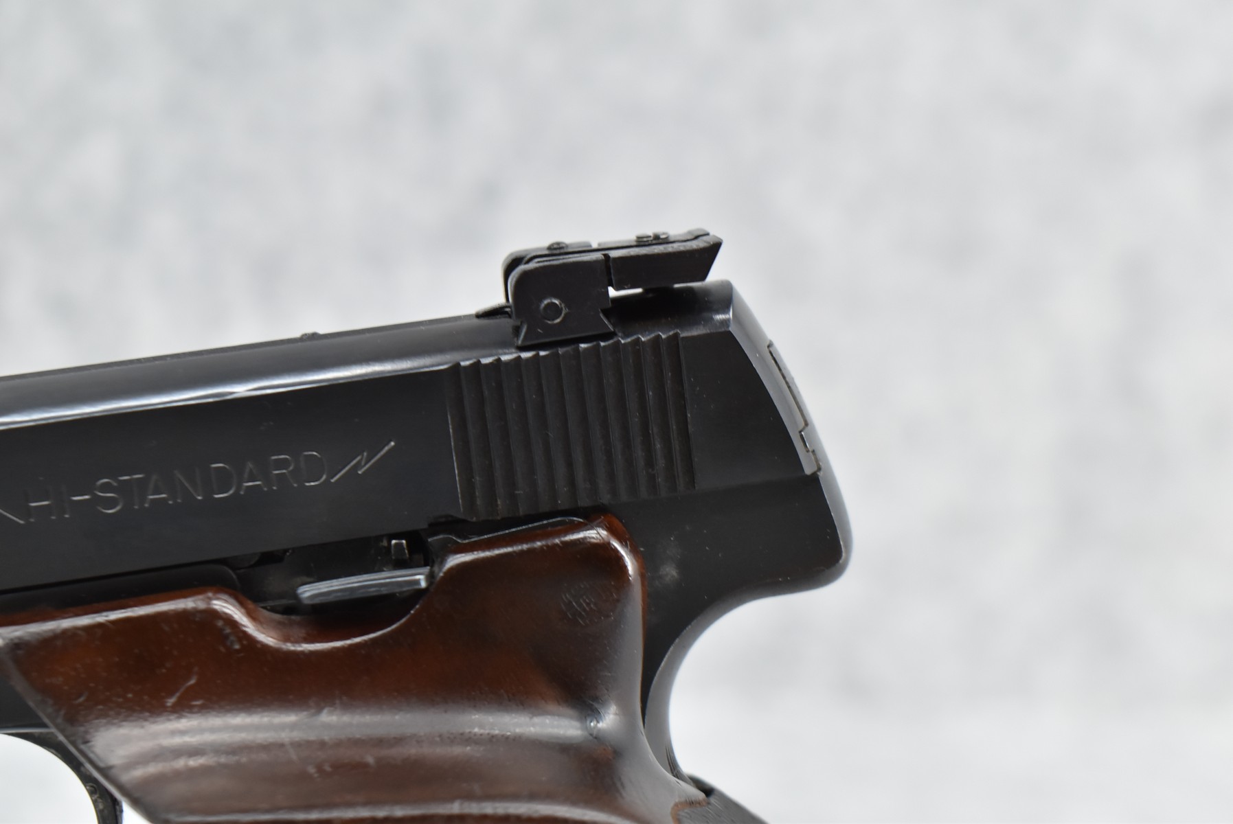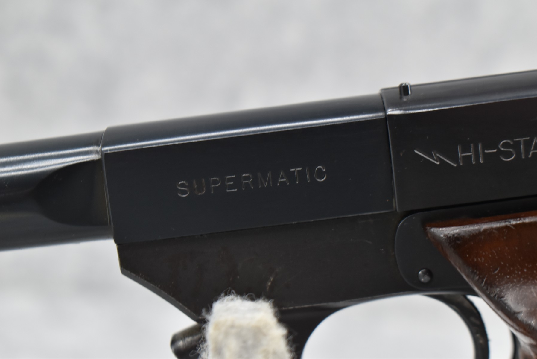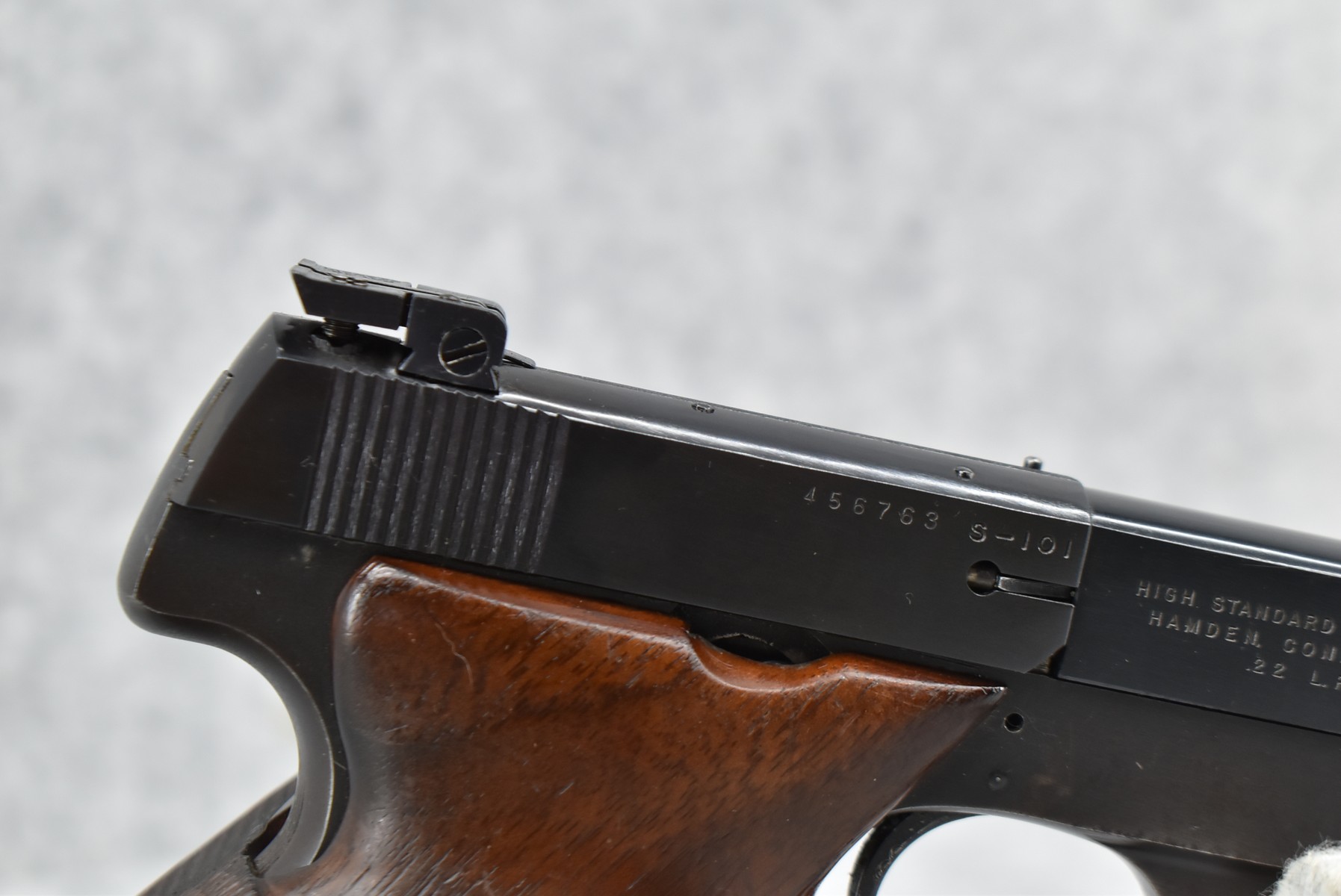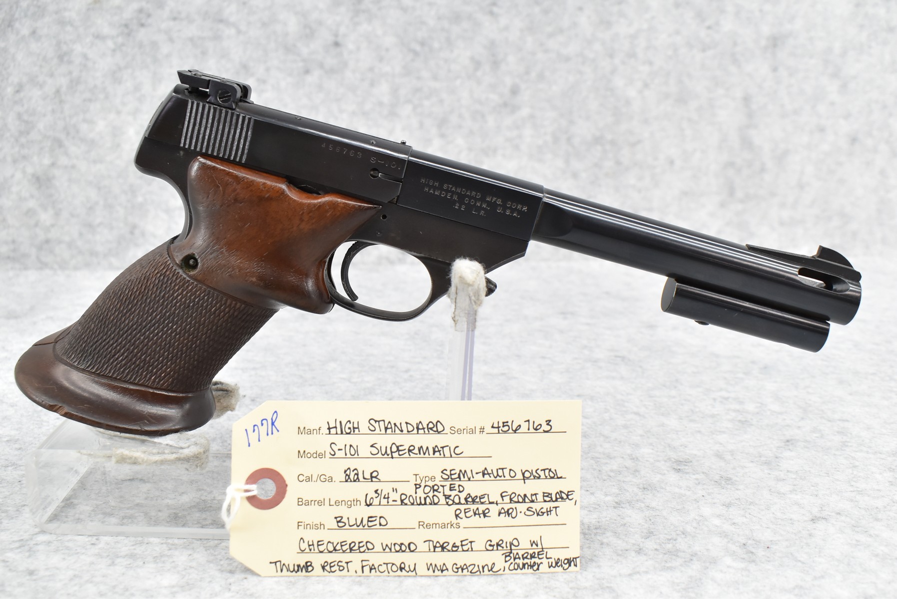 177R. High Standard – Mod. S-101 Supermatic – 22LR Cal. Semi-Auto Pistol – w/6 ¾” Round, Ported Barrel w/Front Blade & Rear Adj. Sights – Blued Finish – w/Checkered Wood Target Grip w/Thumb Rest – w/Factory Magazine – w/Barrel Counterweight