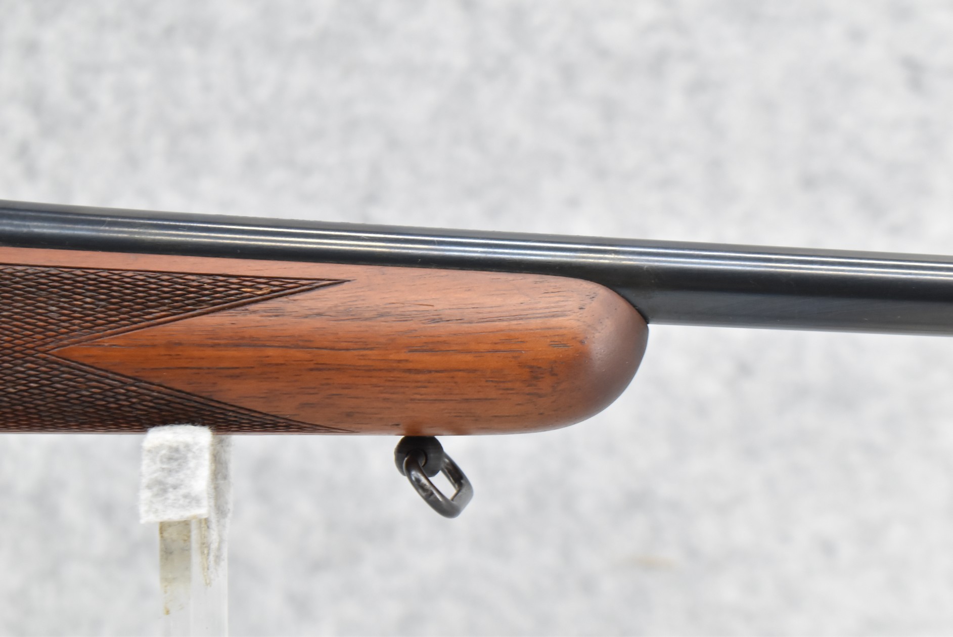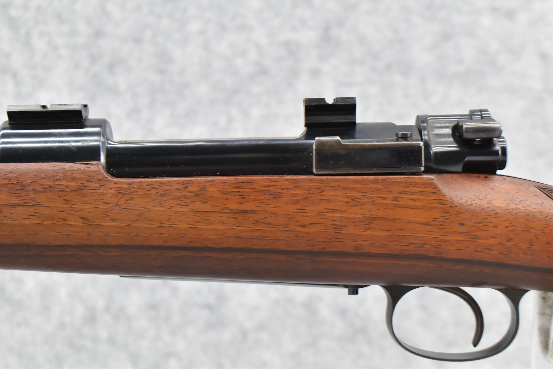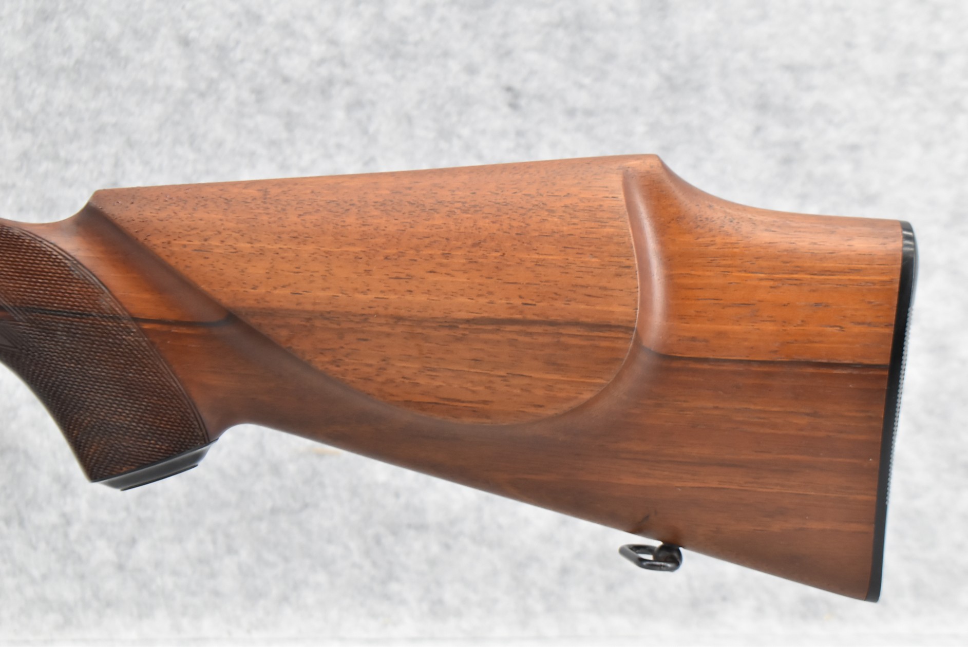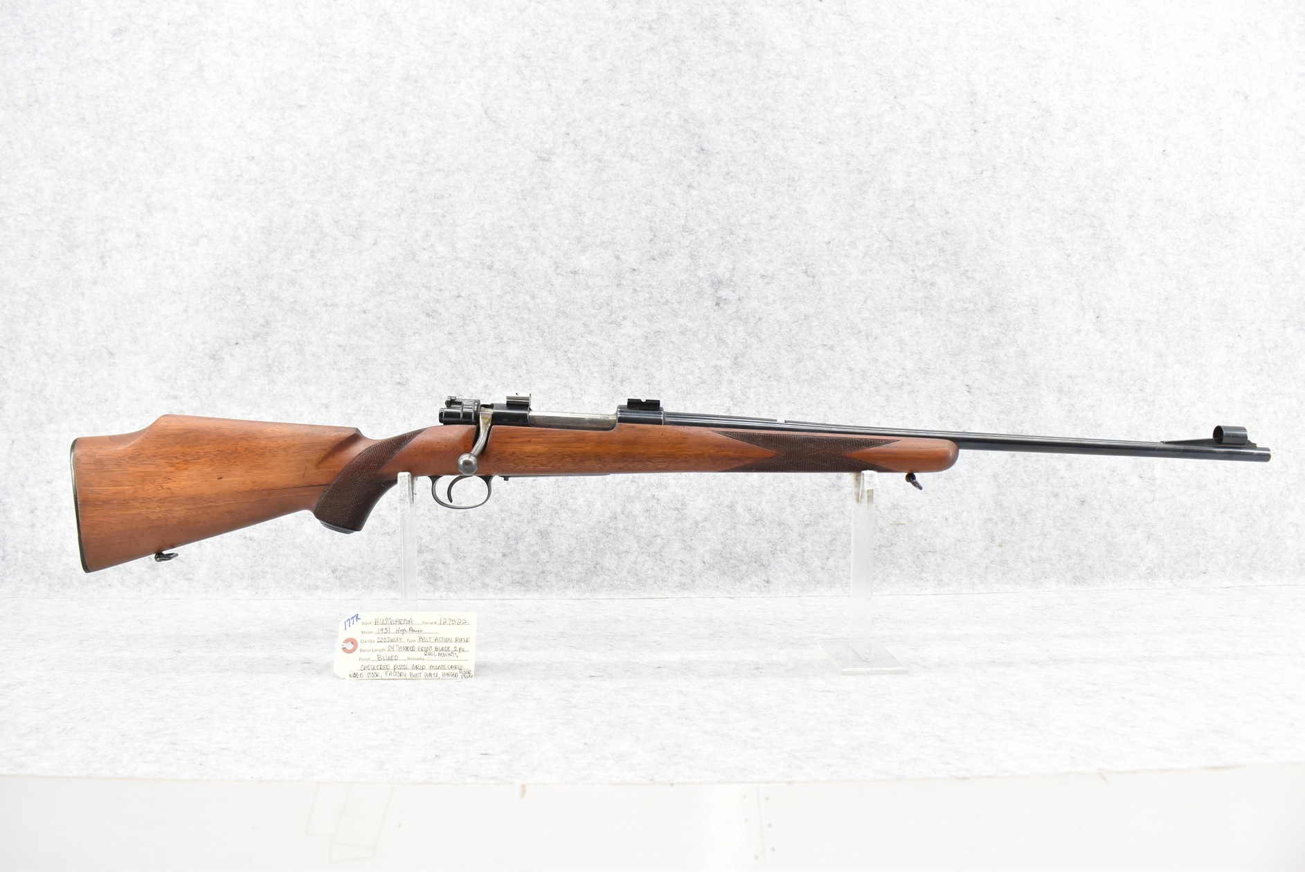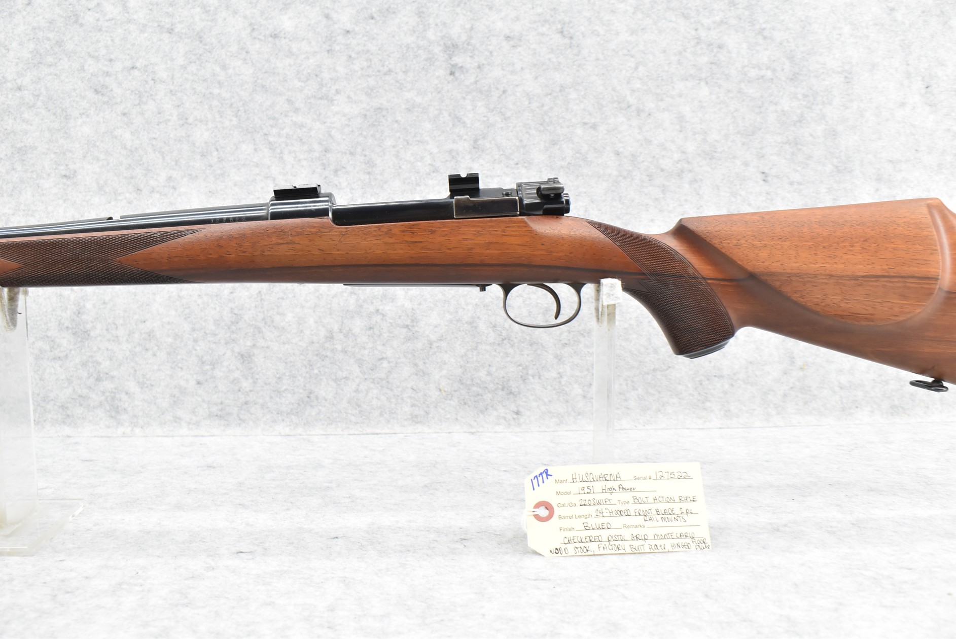 177R. Husqvarna – Mod. 1951 High Power – 220 Swift Cal. Bolt Action Rifle – w/24” Barrel w/Hooded Front Blade Sight – Blued Finish – w/Checkered Pistol Grip Monte Carlo Wood Stock w/Factory Butt Plate – w/Hinged Floor Plate – w/2pc. Bases