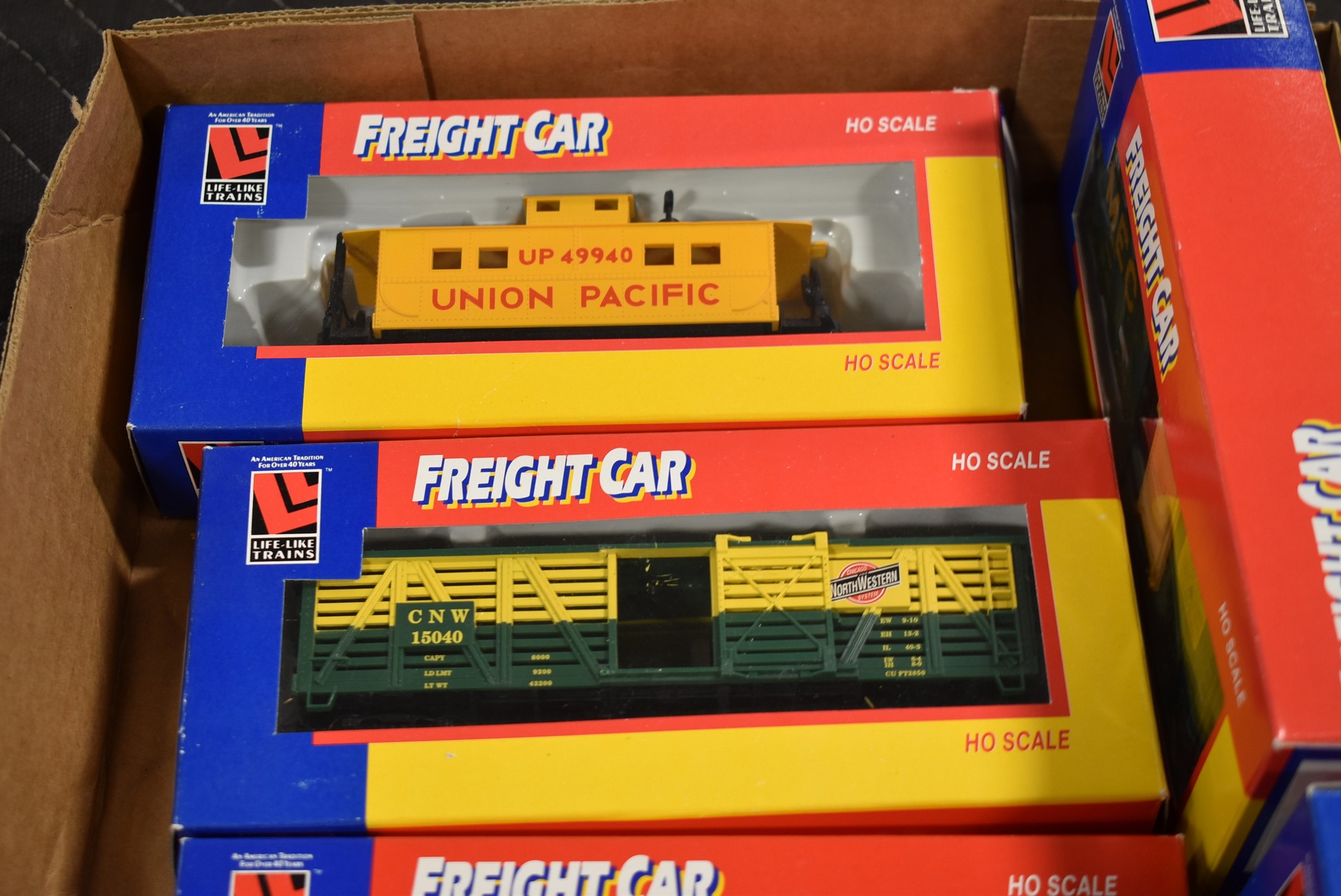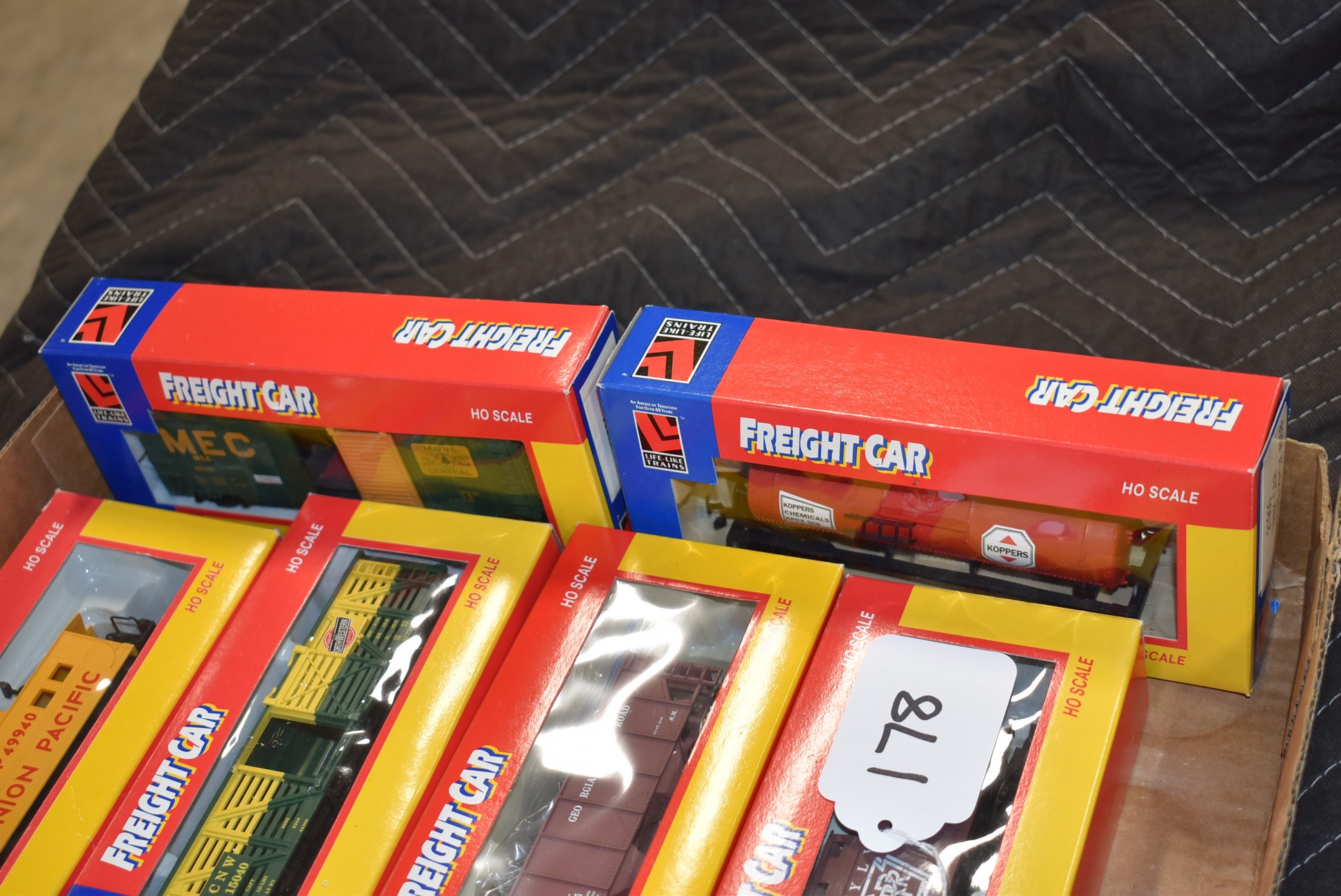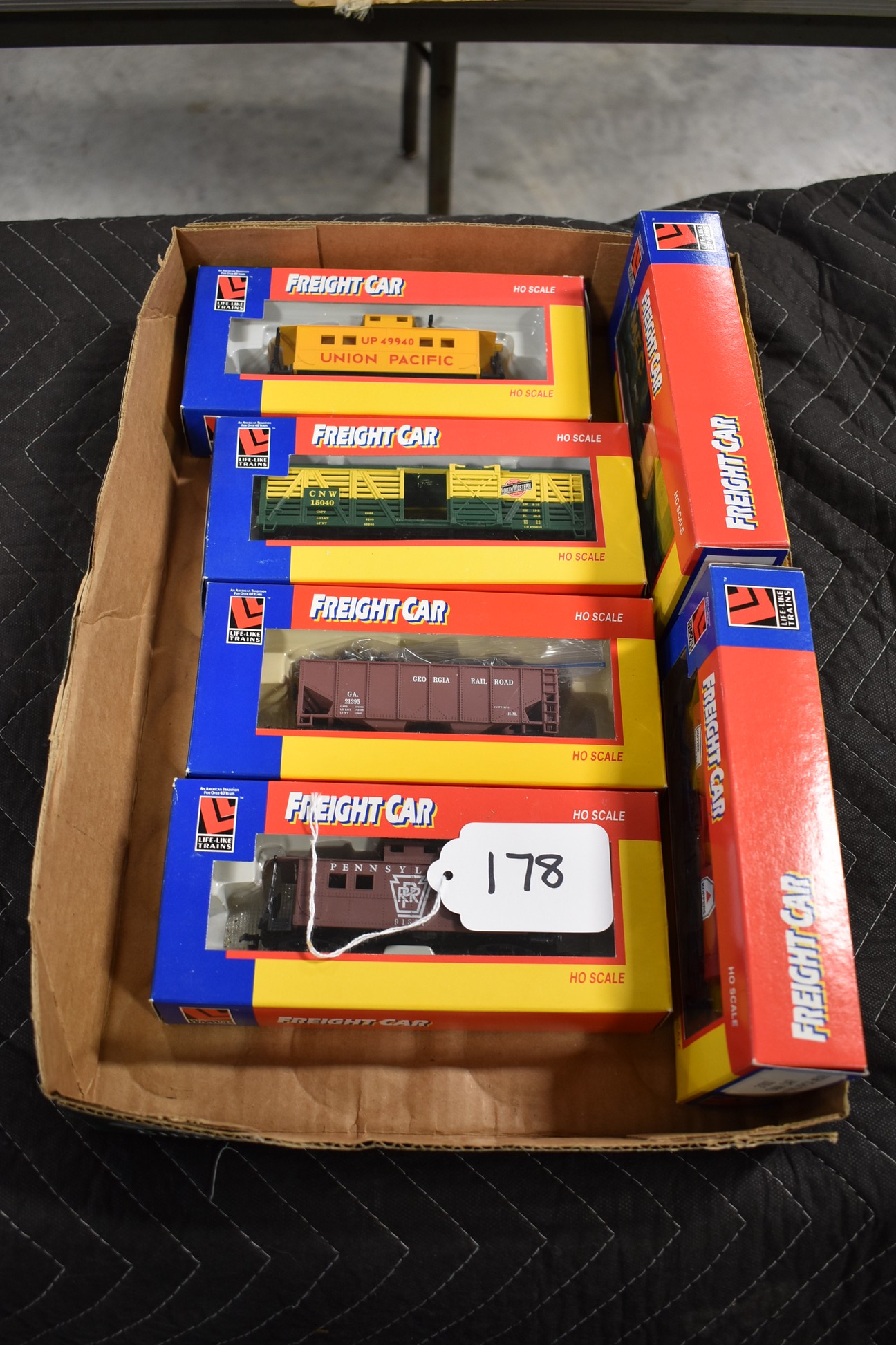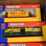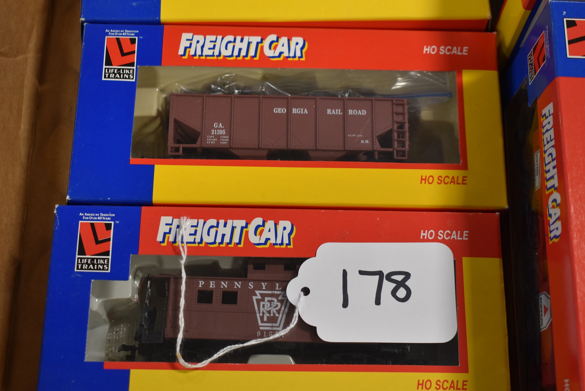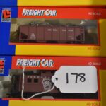 178. Lot of 6 Freight Car Train Cars – Including Caboose PRR 8538, Hopper Car 21908, Stock Car 8488, Caboose Up 8534, Tank Car 21900, and 40” Box Car 21914 – All w/Boxes