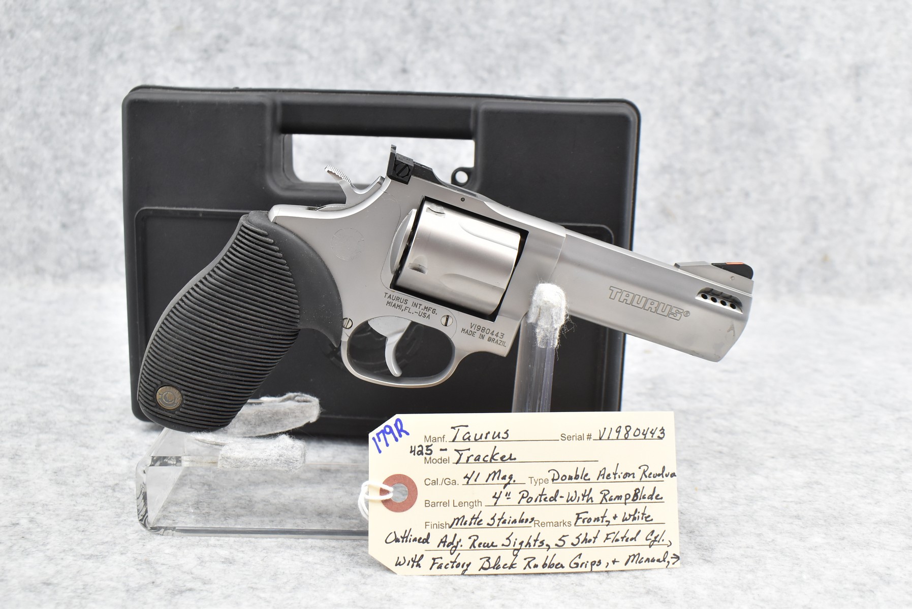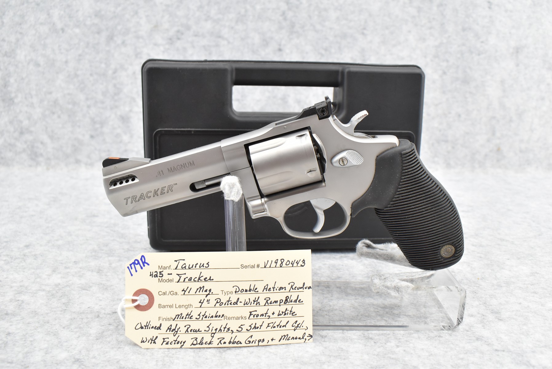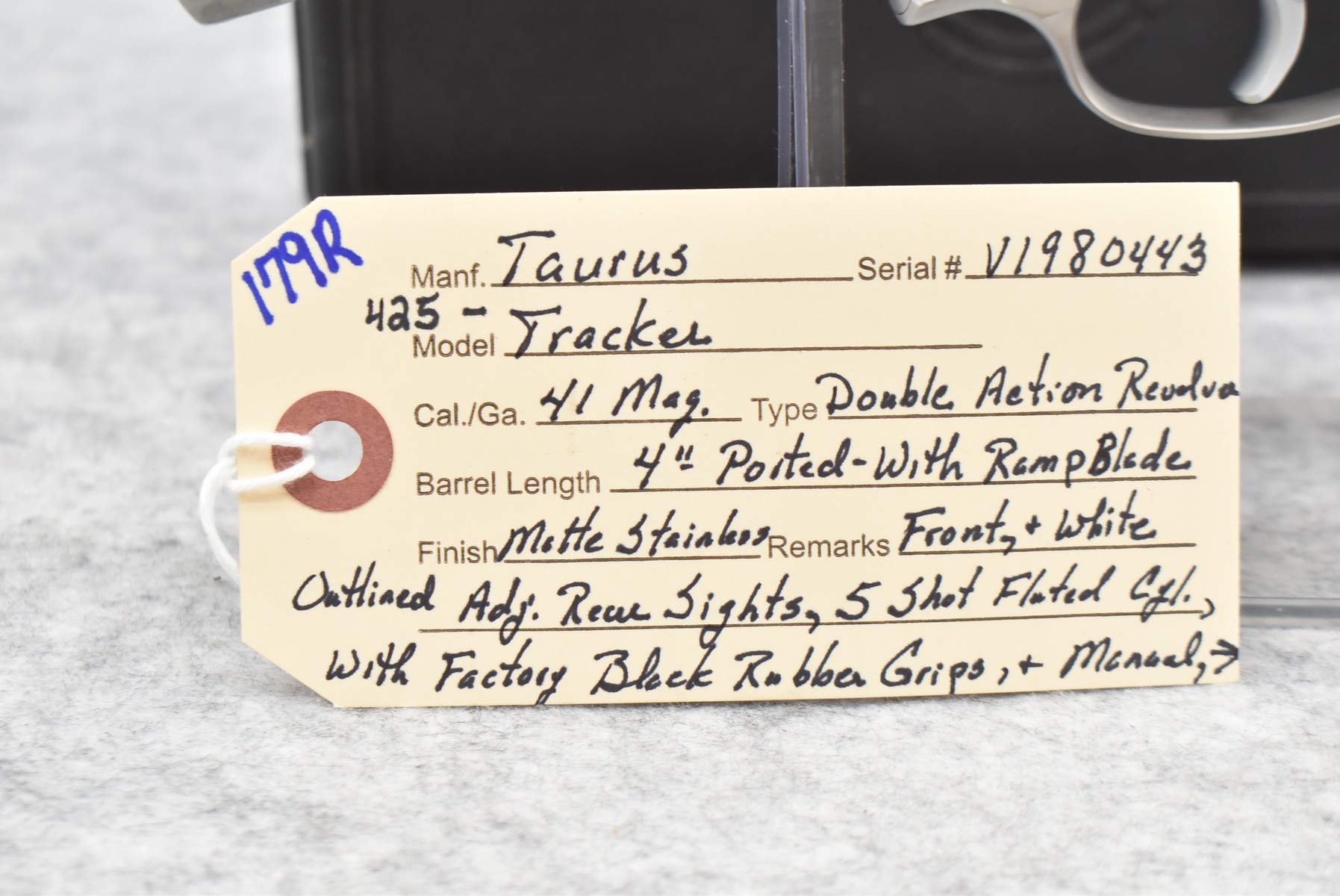 179R. Taurus – Mod. 425 Tracker – 41 Mag. Cal. Double Action Revolver – w/4” Ported Barrel w/Ramp Blade Front and White Outlined Adjustable Rear Sights – w/Factory Black Rubber Grips – w/5-Shot Fluted Cylinder – w/Factory Taurus Hard Case and Manual
