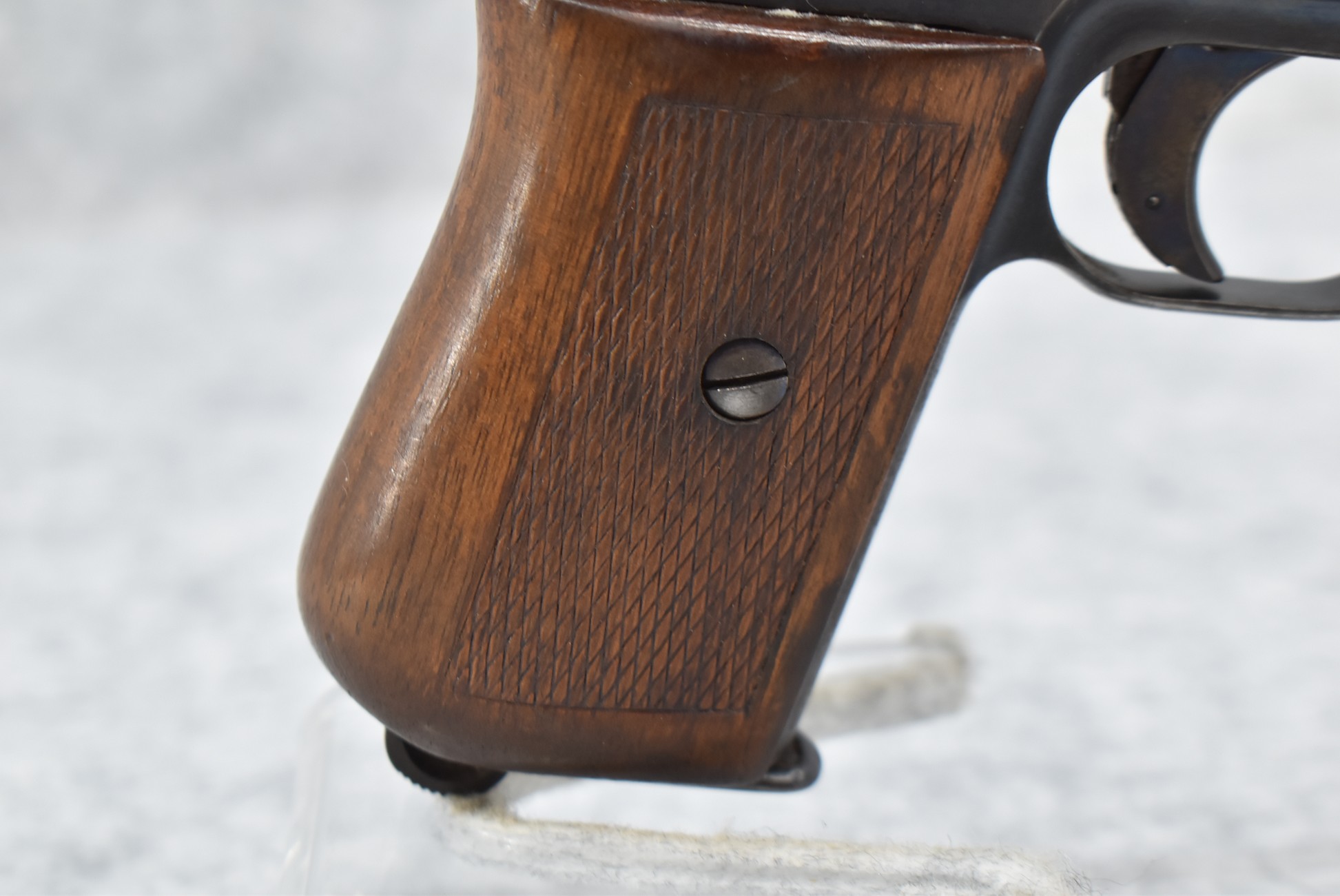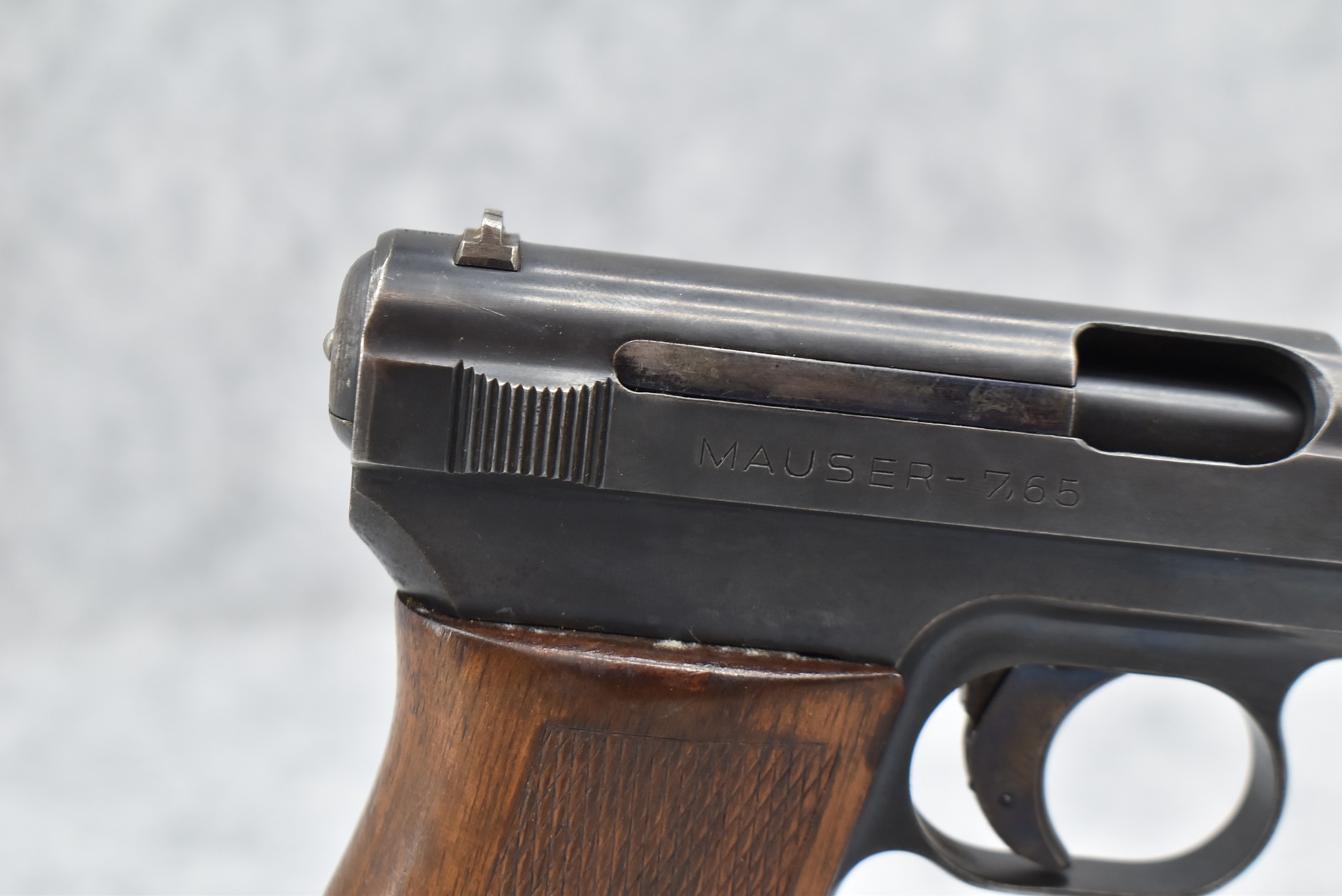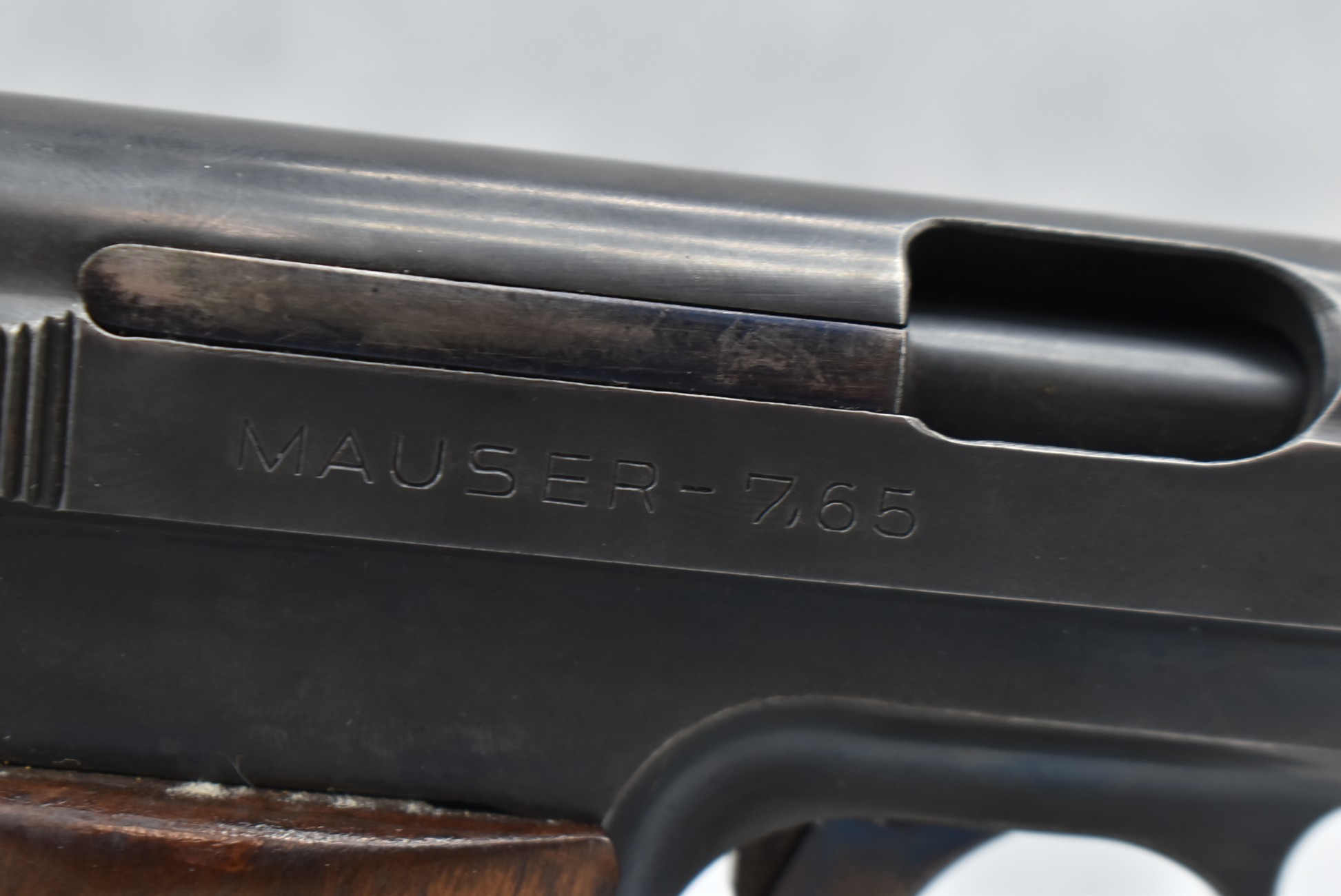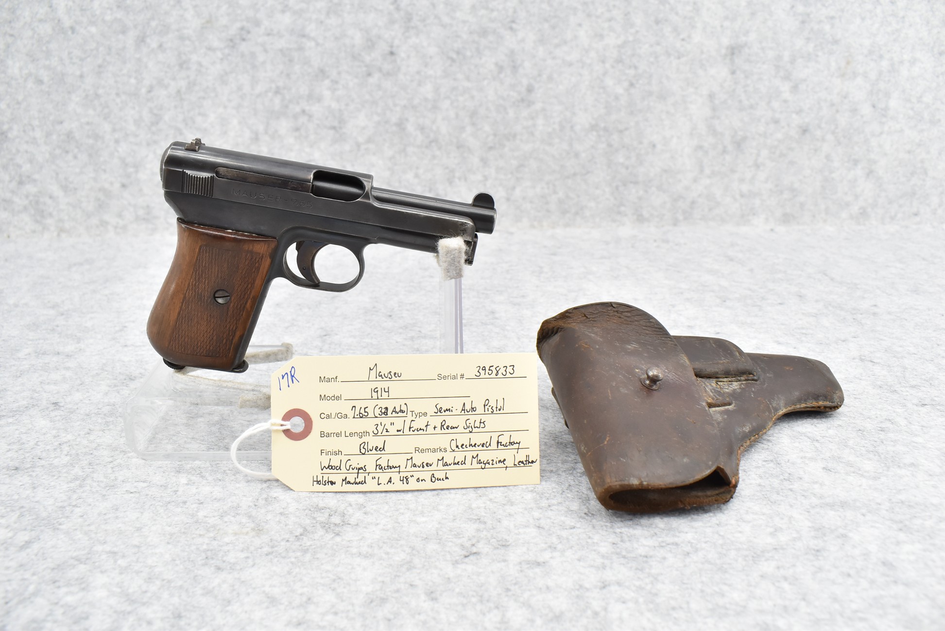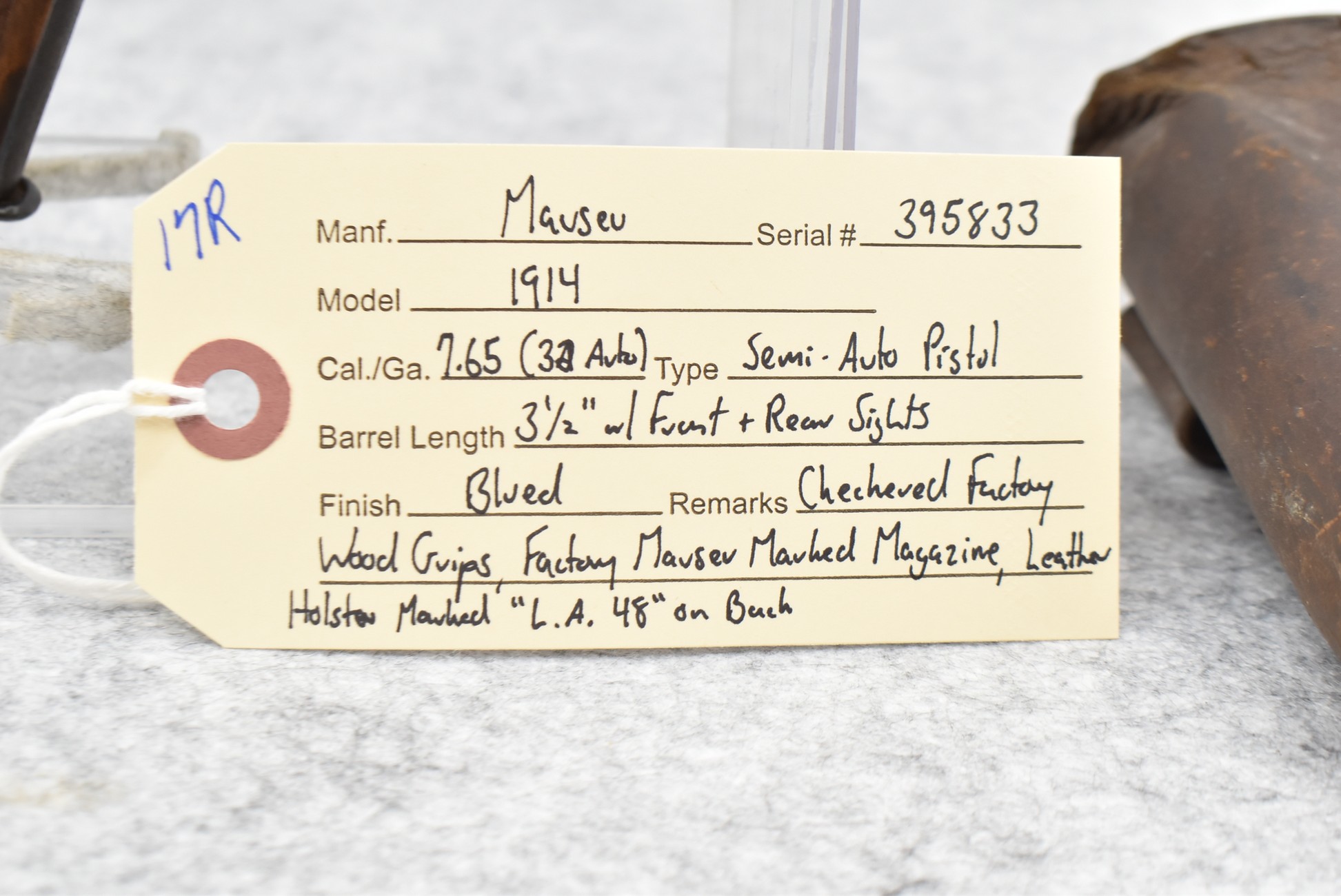 17R. Mauser – Mod. 1914 – 7.65 (32 Auto) Cal. Semi-Auto Pistol – w/3 ½” Barrel w/Front & Rear Sights – Blued Finish – w/Checkered Factory Wood Grips – w/Factory Mauser Marked Magazine – w/Leather Holster Marked “L.A. 48” on Back