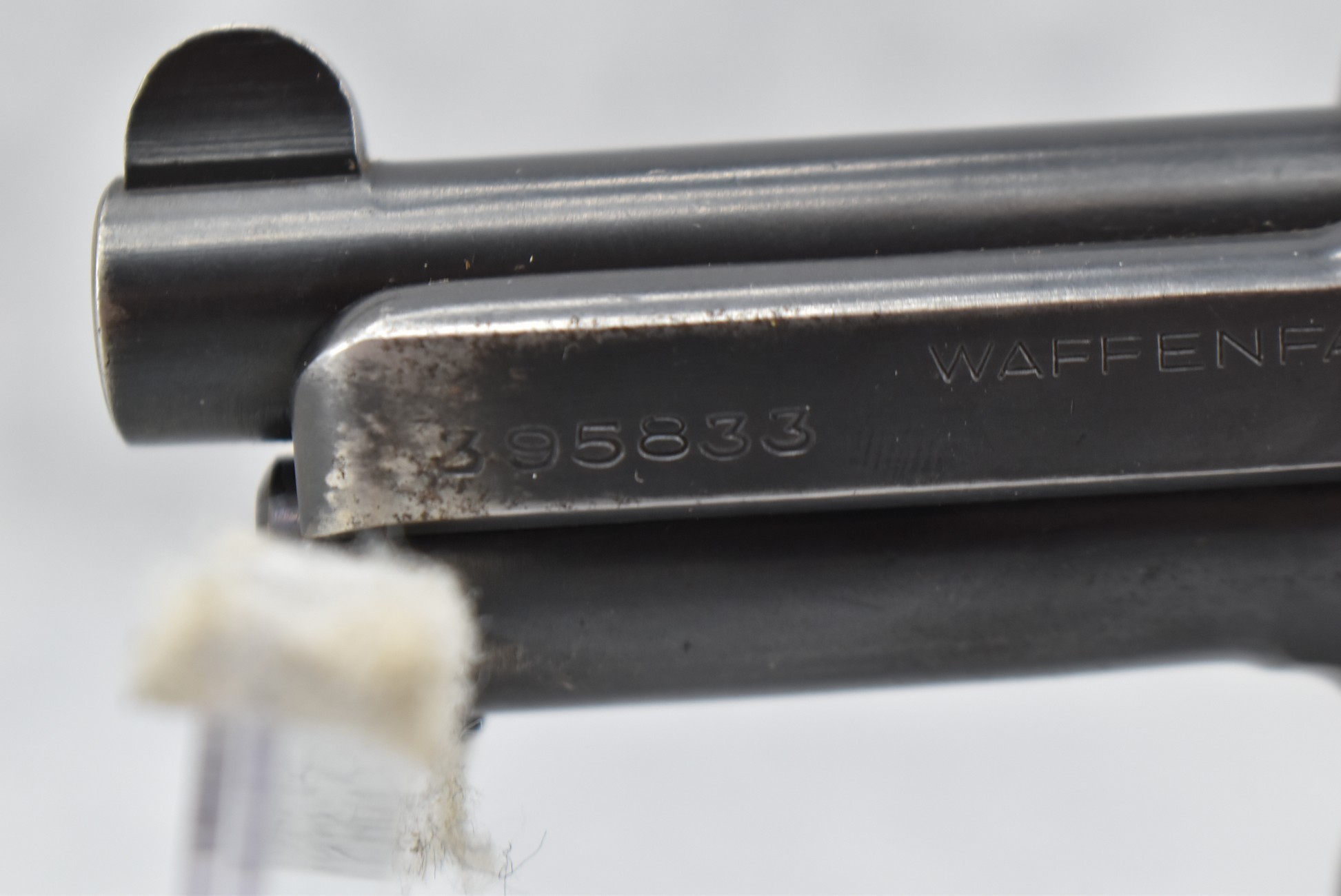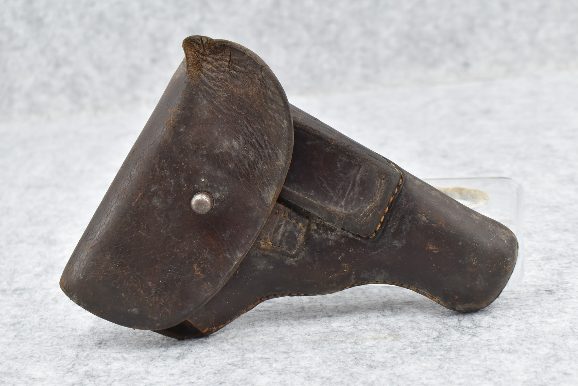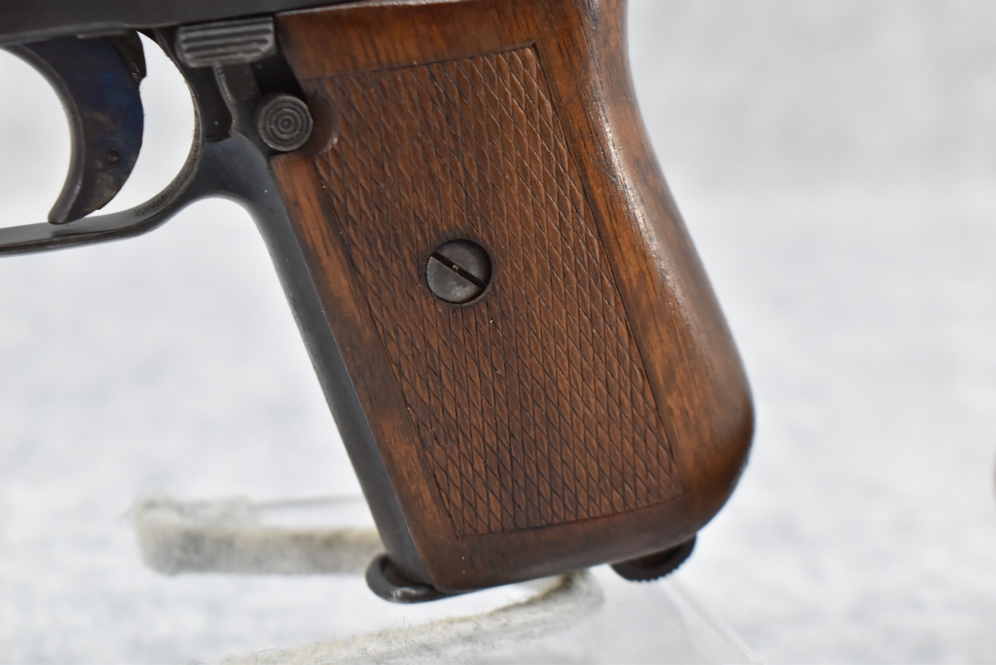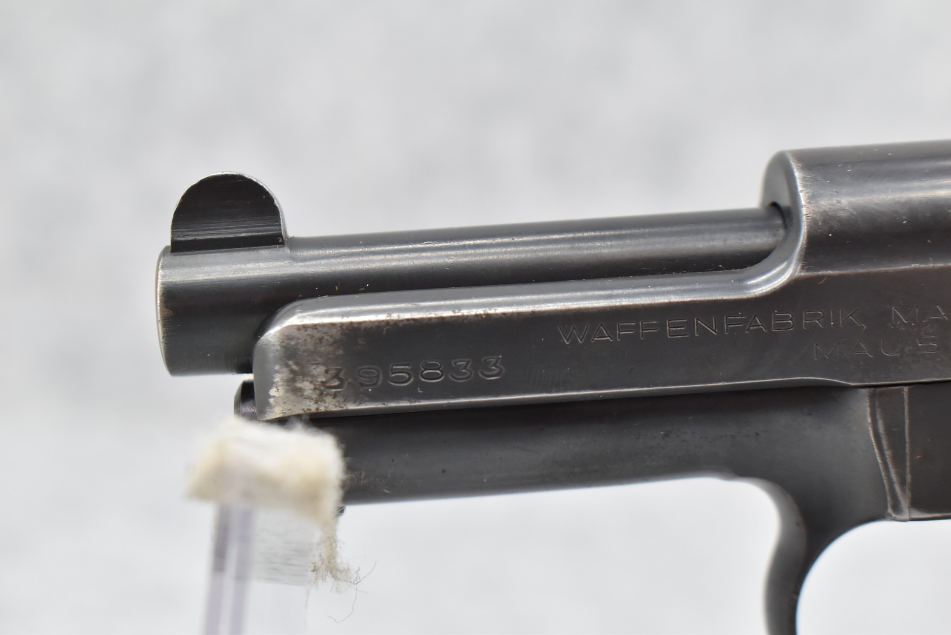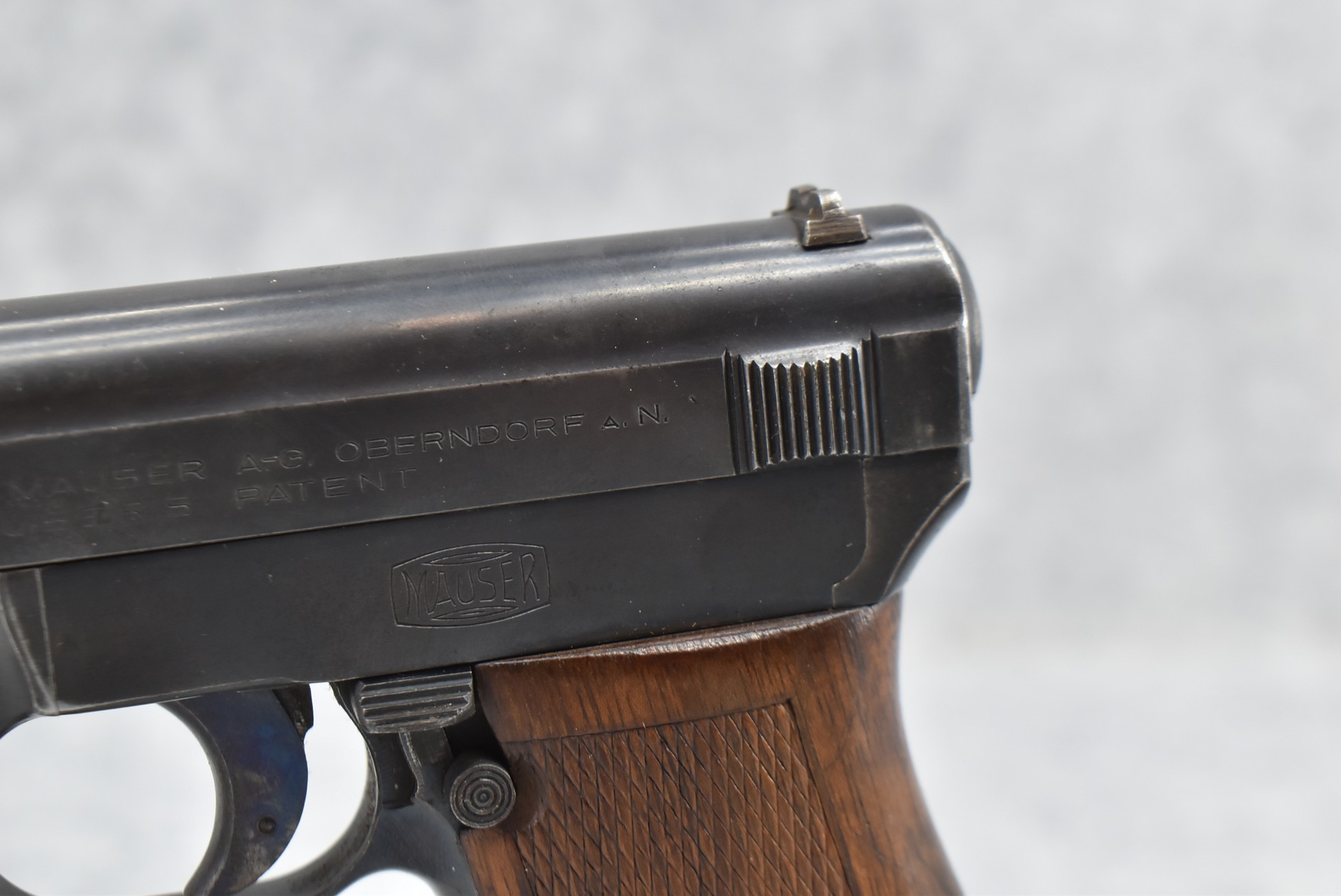 17R. Mauser – Mod. 1914 – 7.65 (32 Auto) Cal. Semi-Auto Pistol – w/3 ½” Barrel w/Front & Rear Sights – Blued Finish – w/Checkered Factory Wood Grips – w/Factory Mauser Marked Magazine – w/Leather Holster Marked “L.A. 48” on Back