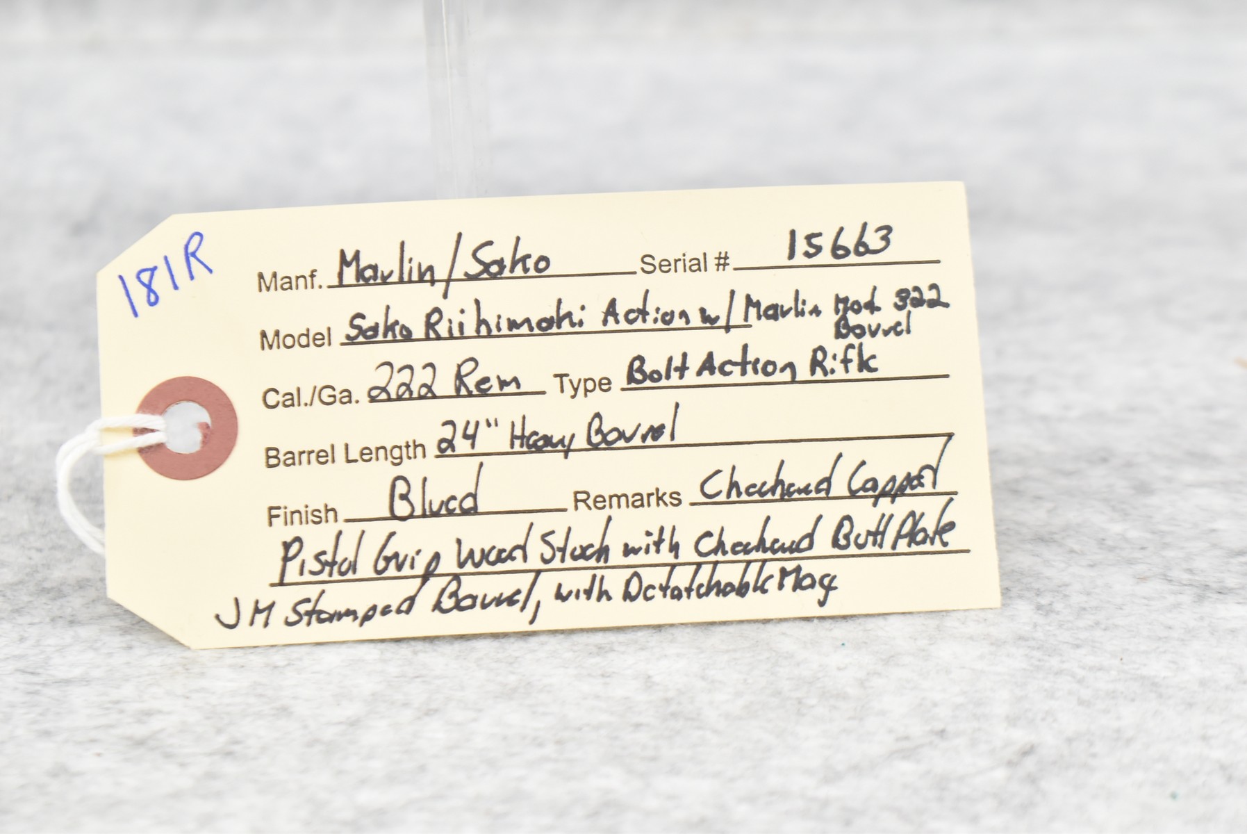 181R. Marlin/Sako – Mod. Sako Riihimaki Action – 222 Rem. Cal. Bolt Action Rifle – w/24” Marlin Mod. 322 JM Stamped Heavy Barrel – Blued Finish – w/Checkered Capped Pistol Grip Wood Stock w/Checkered Butt Plate – w/Detachable Mag