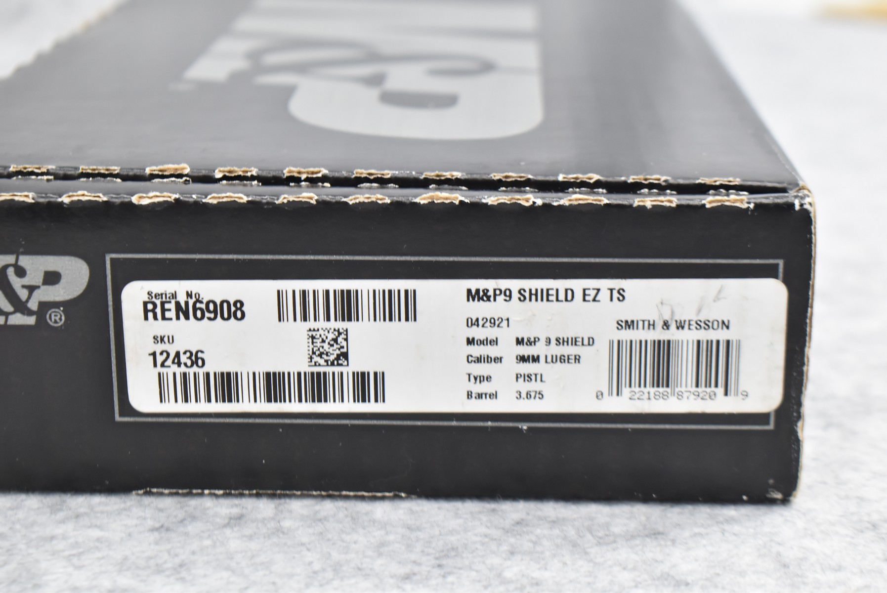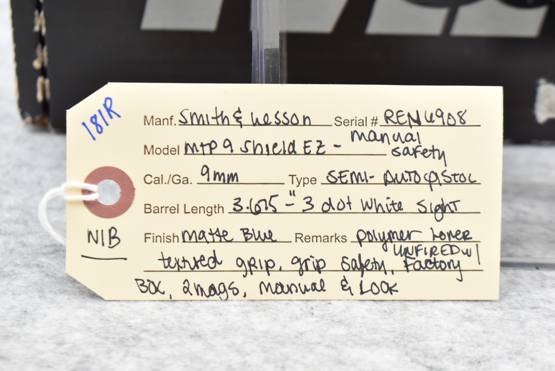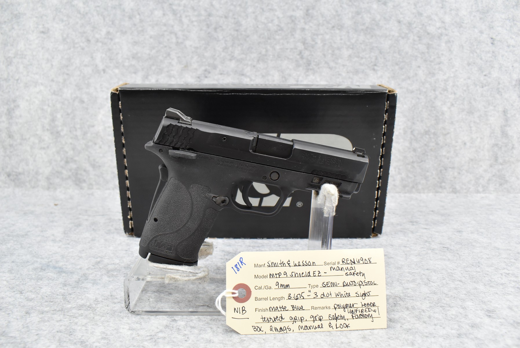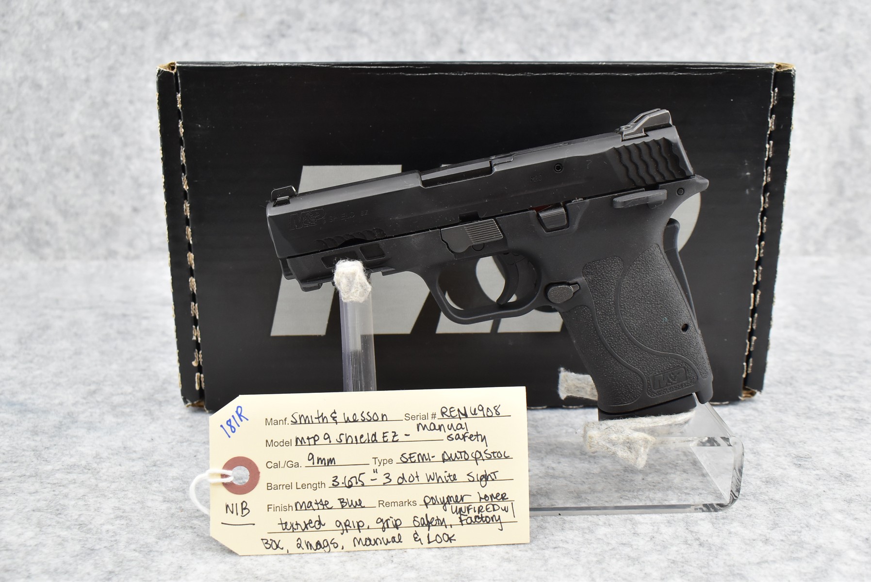 181R. Smith & Wesson – Mod. M&P 9 Shield EZ (Manual Safety) – 9mm Cal. Semi-Auto Pistol – w/3.675 Barrel w/3-Dot White Sight – Matte Blued Finish – w/Polymer Lower Textured Grip – w/Grip Safety – Unfired & New w/Factory Box, 2 Mags & Manual