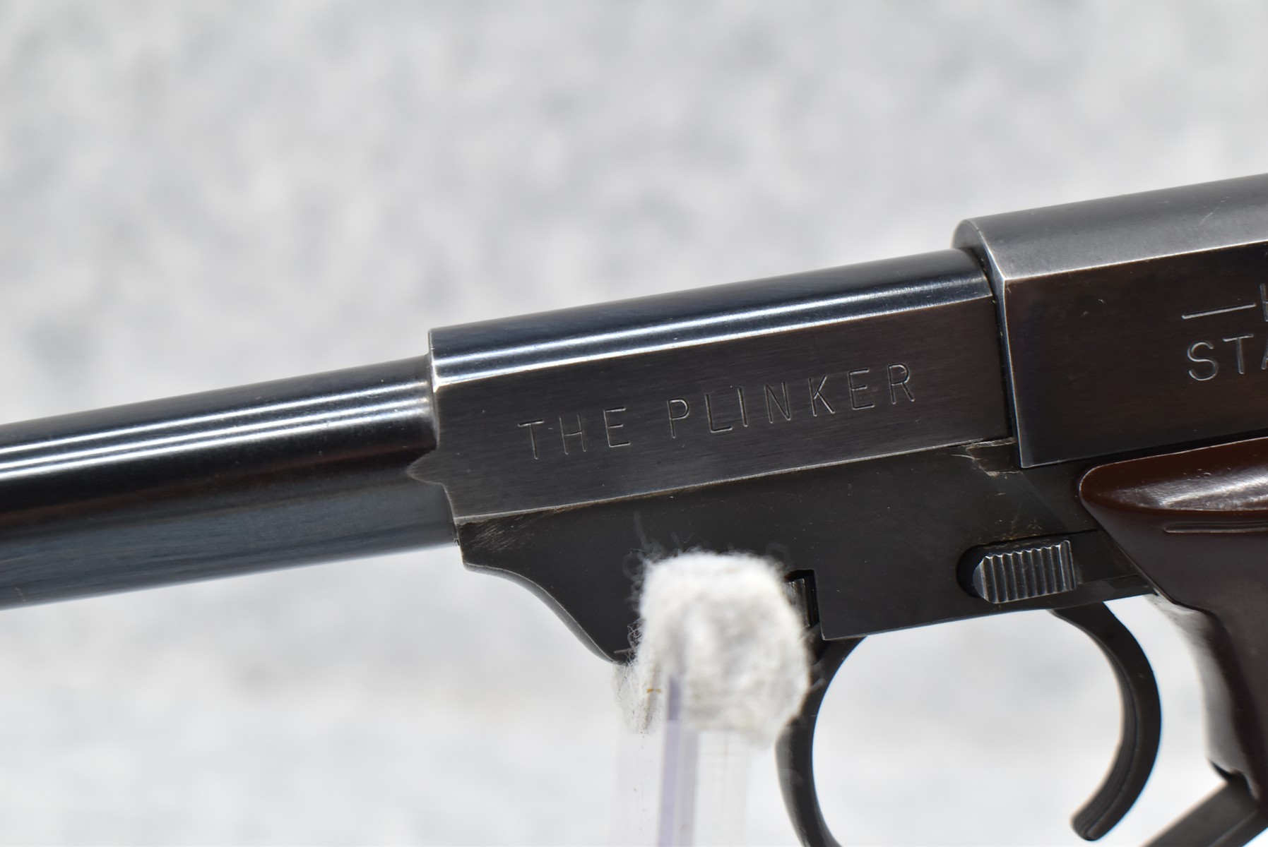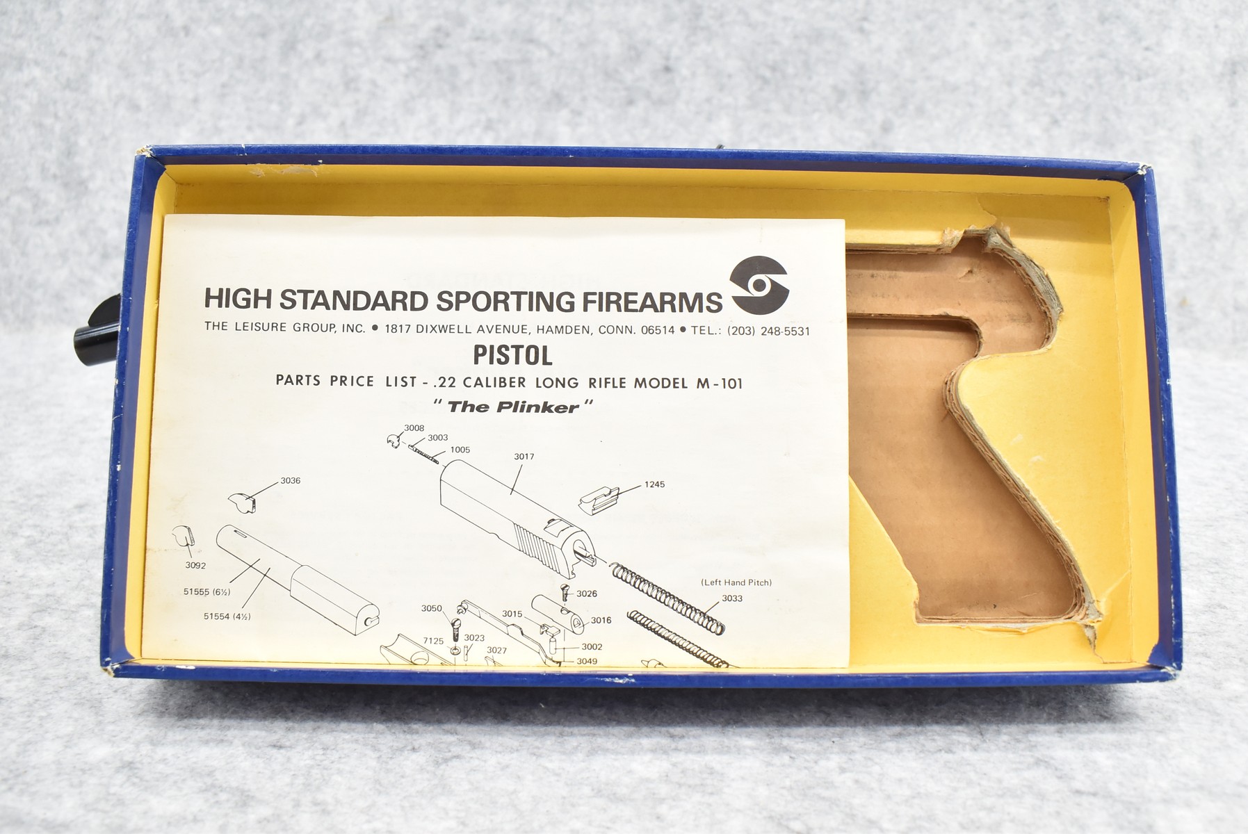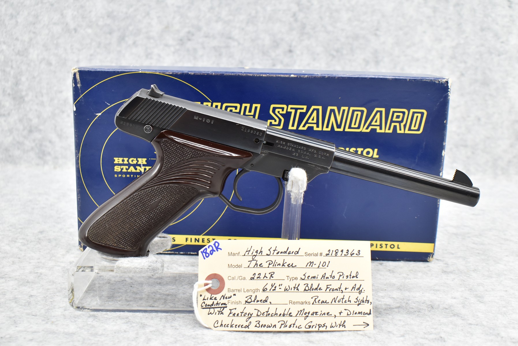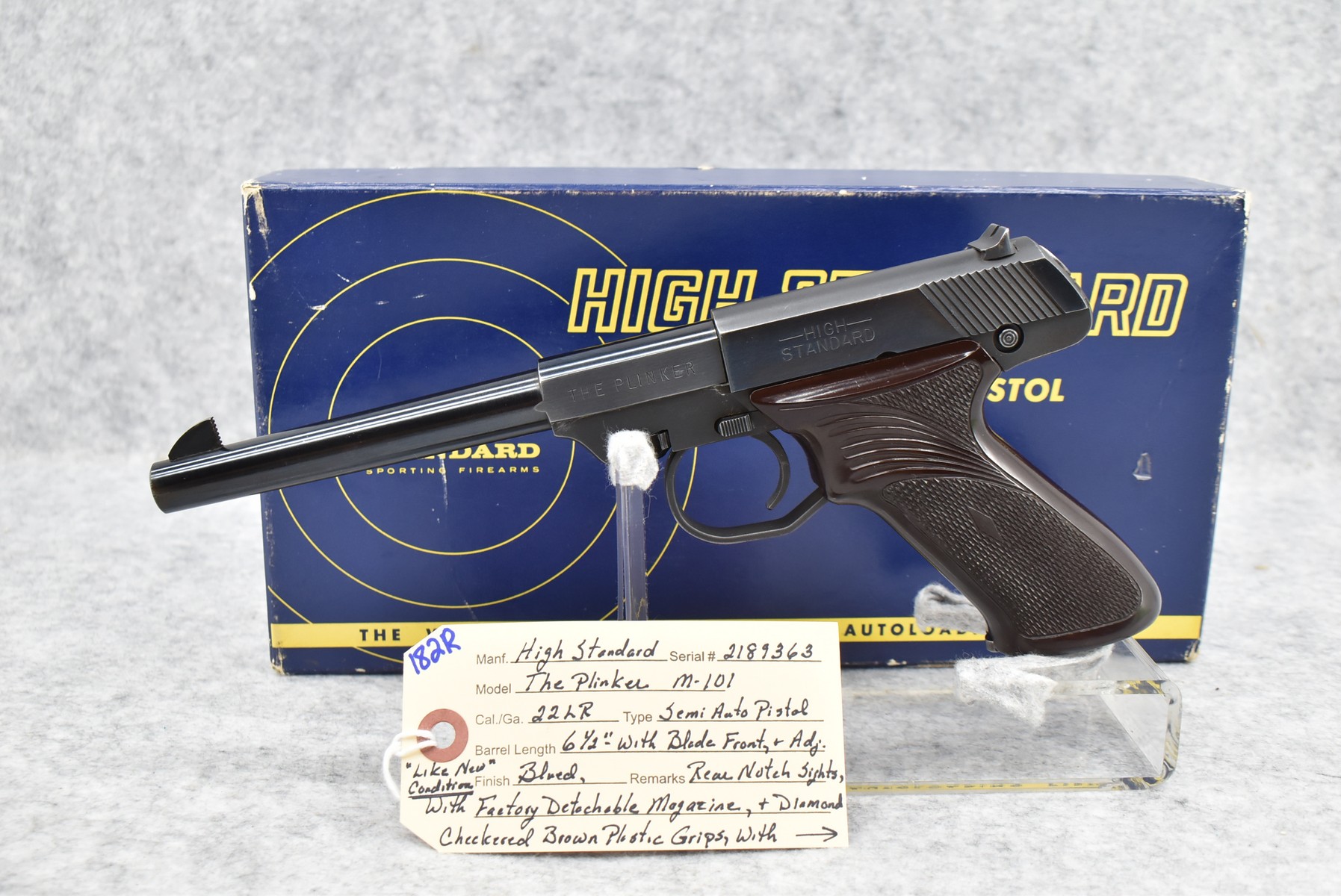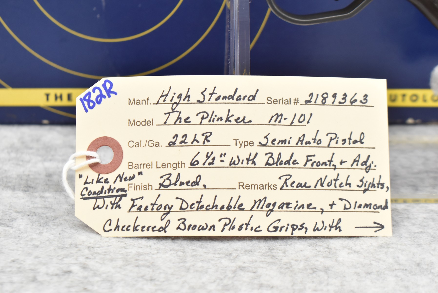 182R. High Standard – Mod. The Plinker M-101 – 22LR Cal. Semi-Auto Pistol – w/6½” Barrel w/Blade Front and Adjustable Rear Notch Sights – Blued Finish – w/Diamond Checkered Brown Plastic Grips – w/Factory Detachable Magazine – Like New Condition w/Factory Box and Manual